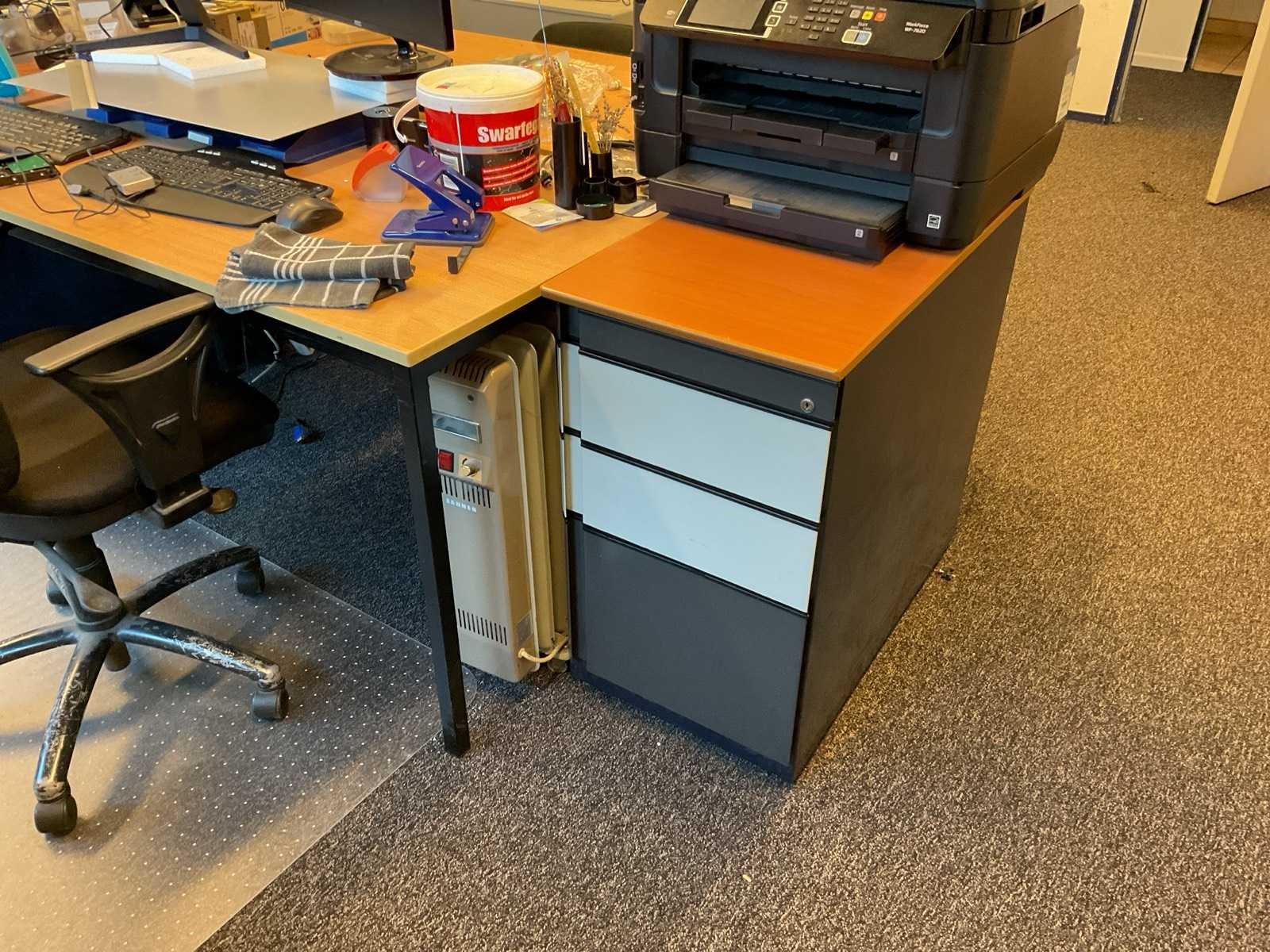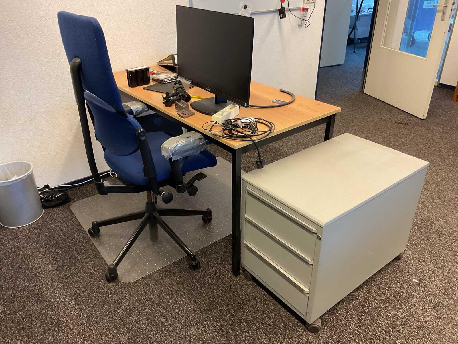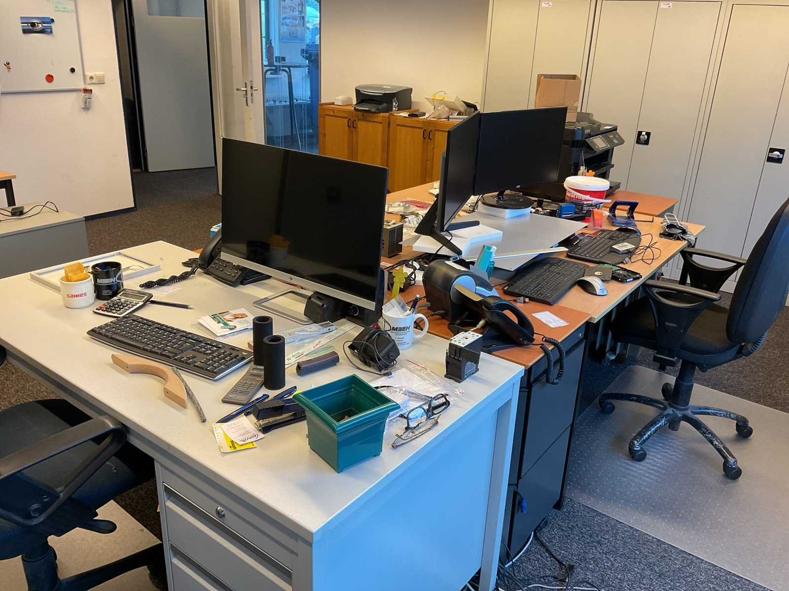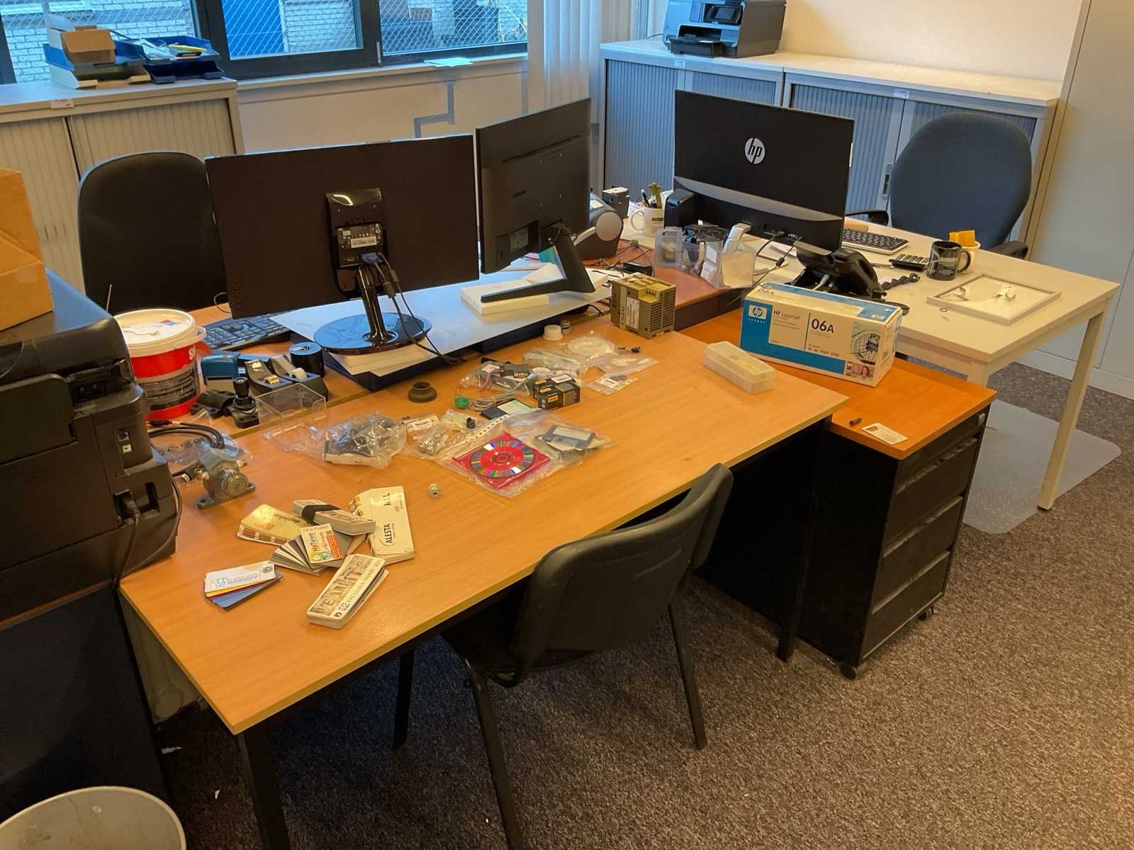 4x bureau, 3x bureaustoel, 1x stoel, diverse ladenkasten, magneetbord, monitoren, elektrische kachel, vloerplaat en alle losse materialen op de bureaus, zonder telefoons en printers