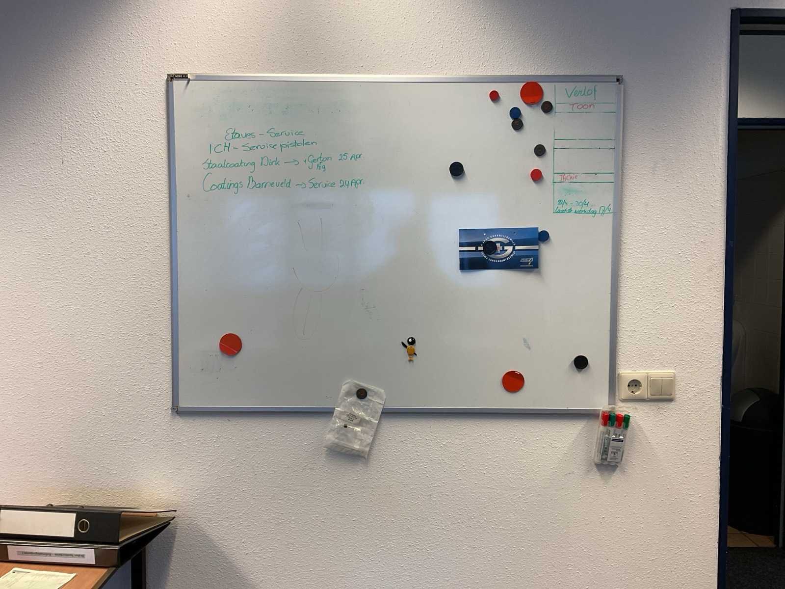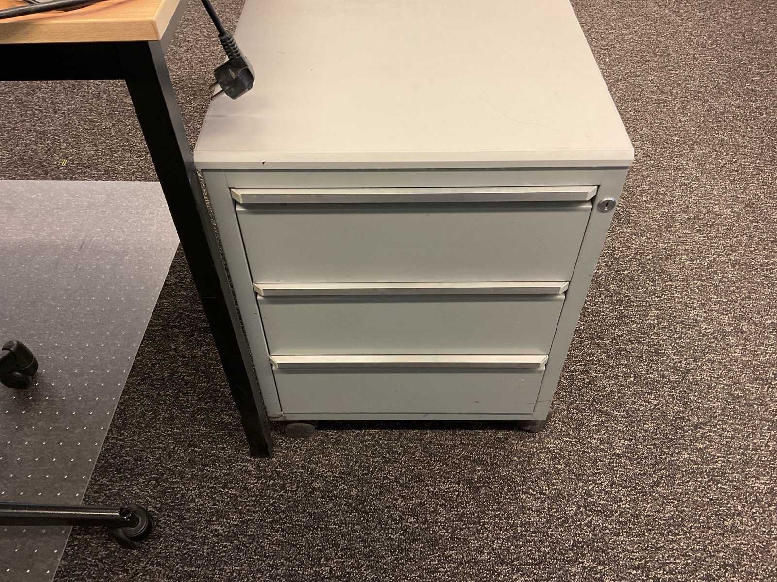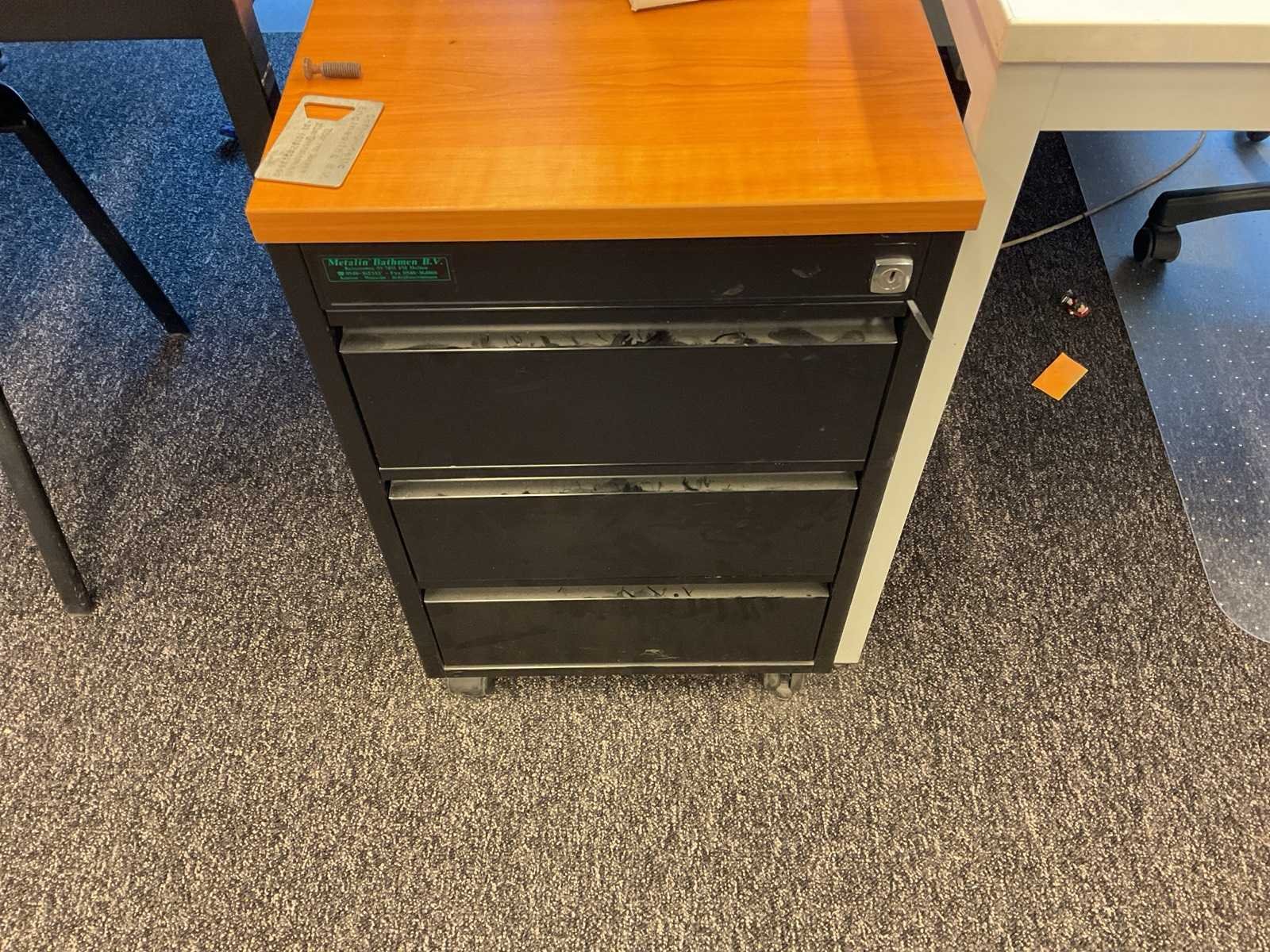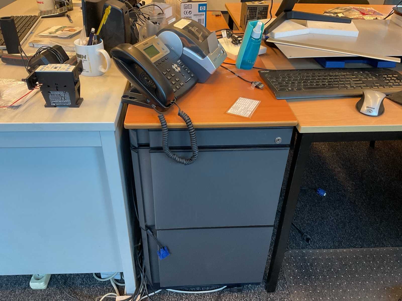 4x bureau, 3x bureaustoel, 1x stoel, diverse ladenkasten, magneetbord, monitoren, elektrische kachel, vloerplaat en alle losse materialen op de bureaus, zonder telefoons en printers