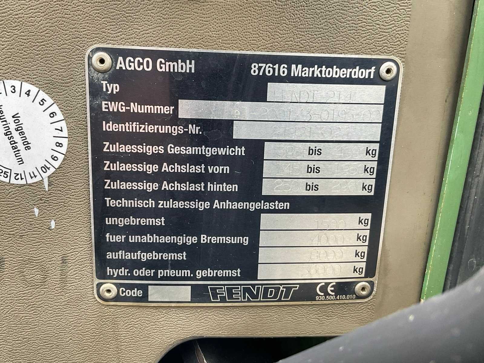 Voorzien van vierwielaandrijving, gazonbanden, hefinrichting, boven trekhaak, rolbeugel, werkverlichting, Merk: Fendt Type: 209V Bouwjaar: 2012 Serienummer: 214213027 Kenteken: THS-32-Z Afgelezen urenstand: 1838 Versnellingsbaktype: Handgeschakeld Bandenmaat voor: 31x15.50-15 Bandenmaat achter: 650/50-22.5 Spoorbreedte: 1250mm Aantal hydraulische ventielen achter: 3 Datum eerste toelating: 2012-06-30