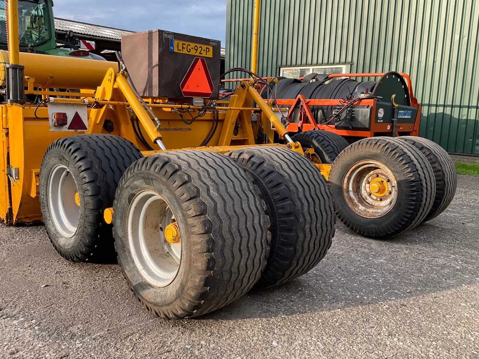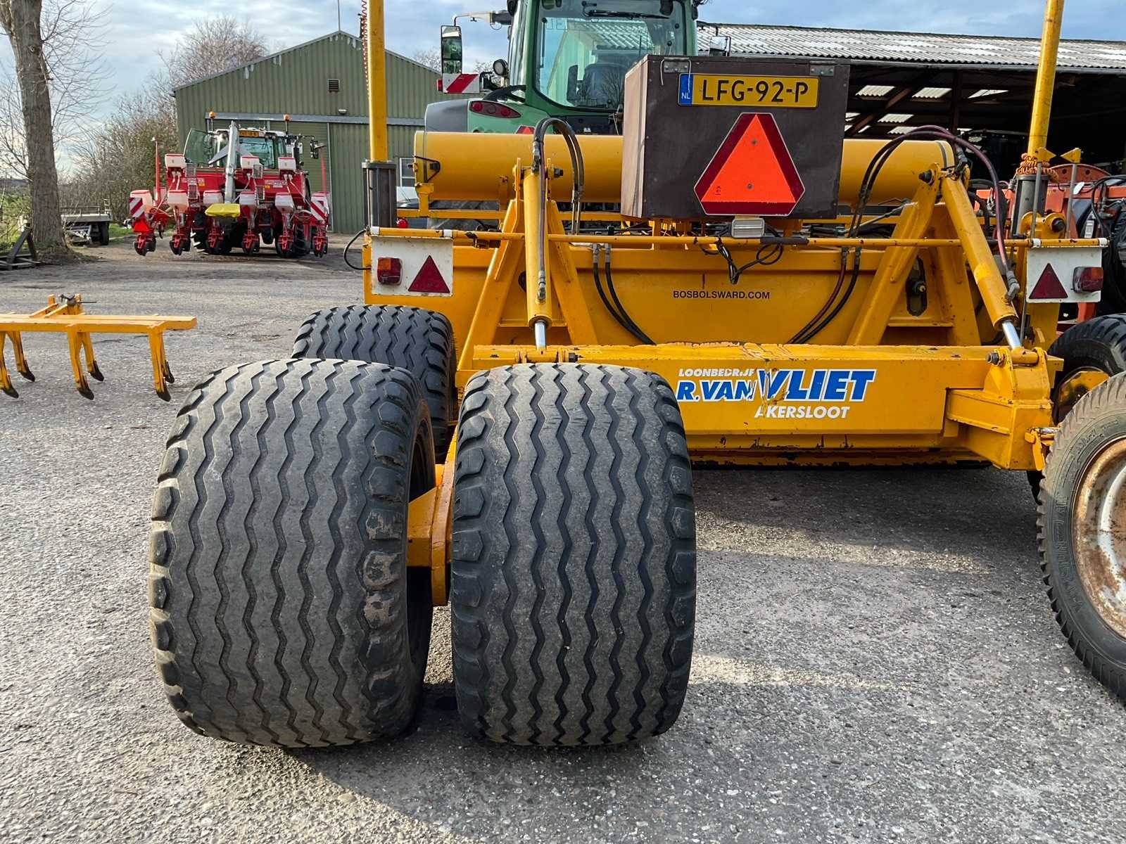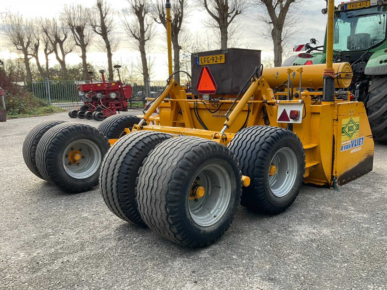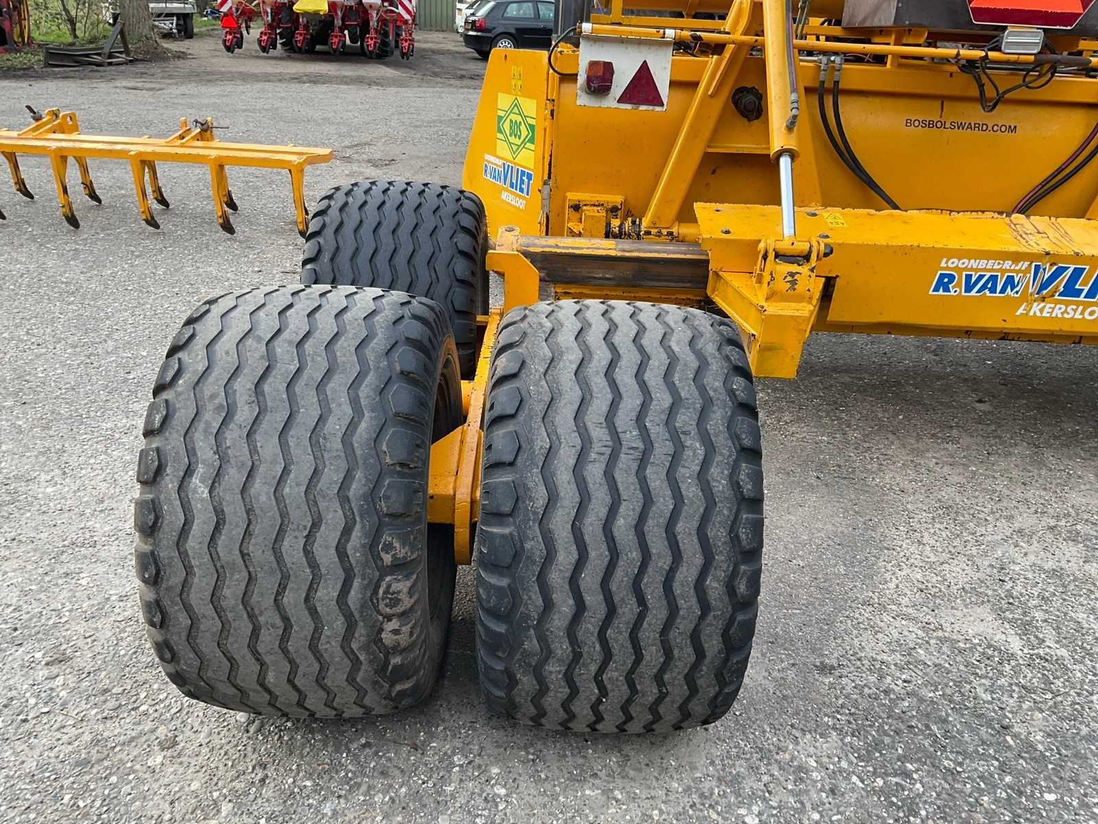 Voorzien van hydraulisch uitklapbare zijkleppen, lasergestuurd, in breedte verstelbaar wielenstel, cultivator aan voorzijde kilverbak (2 punts aansluiting), opbergkist, trekoog; bladhoogte ca. 1000 mm; Pendelend tandemstel, hydraulische schuinstelling, opbergkoker, bedieningspaneel met losse joystick. Merk: Bos Type: KB 5004 Bouwjaar: 2008 Serienummer: 08-1192 Kenteken: LFG-92-P Werkbreedte: 5000mm Aantal wielen: 6 Eigen gewicht: 2000kg Totale afmeting L: 3000mm