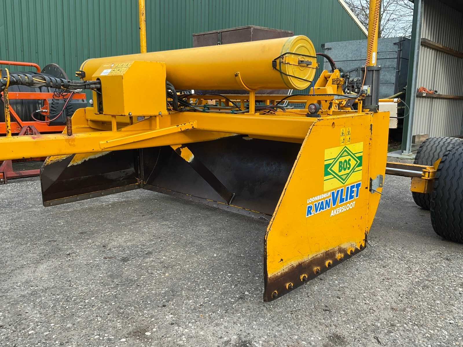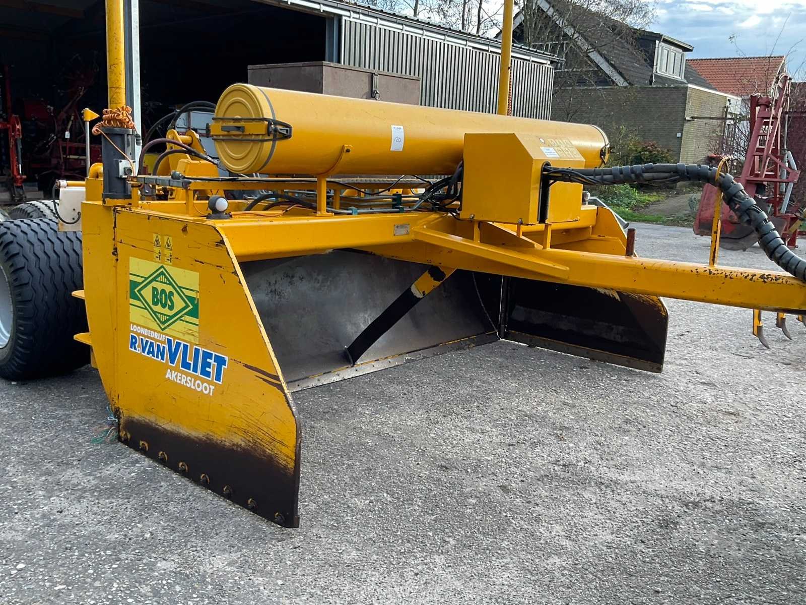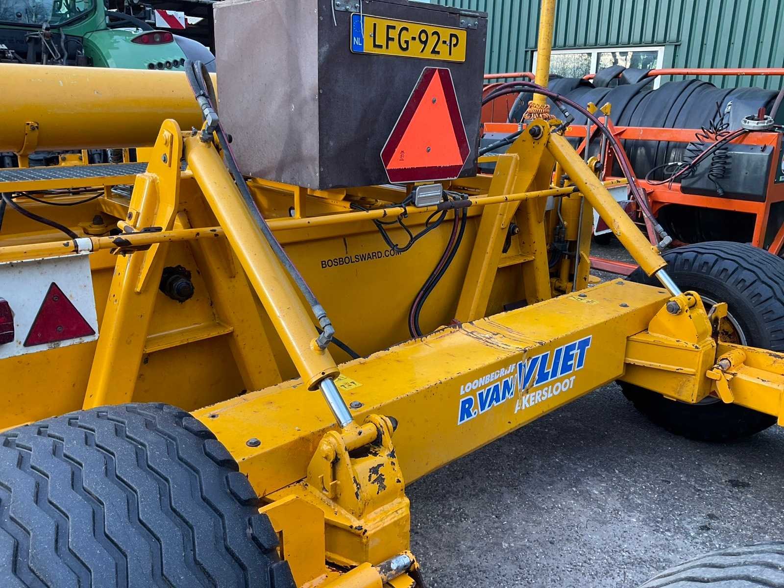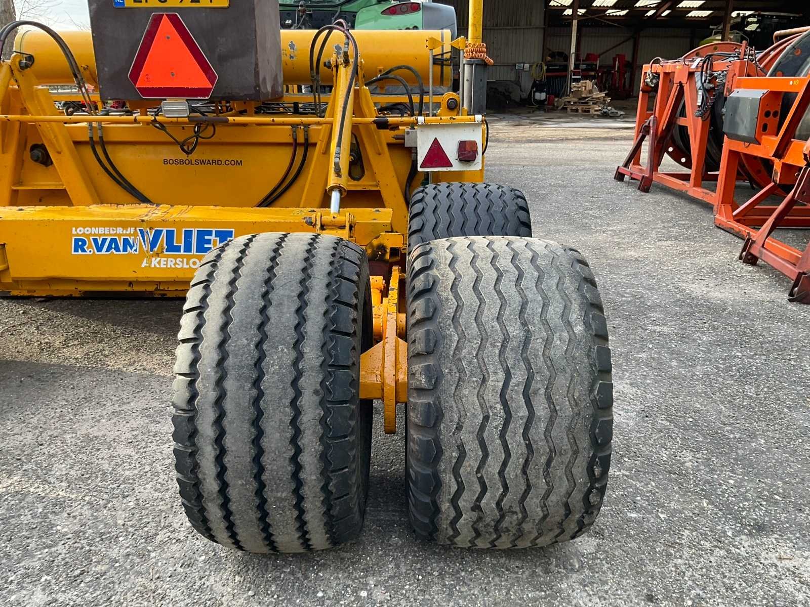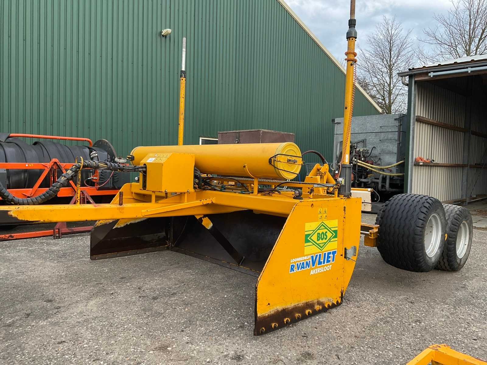 Voorzien van hydraulisch uitklapbare zijkleppen, lasergestuurd, in breedte verstelbaar wielenstel, cultivator aan voorzijde kilverbak (2 punts aansluiting), opbergkist, trekoog; bladhoogte ca. 1000 mm; Pendelend tandemstel, hydraulische schuinstelling, opbergkoker, bedieningspaneel met losse joystick. Merk: Bos Type: KB 5004 Bouwjaar: 2008 Serienummer: 08-1192 Kenteken: LFG-92-P Werkbreedte: 5000mm Aantal wielen: 6 Eigen gewicht: 2000kg Totale afmeting L: 3000mm