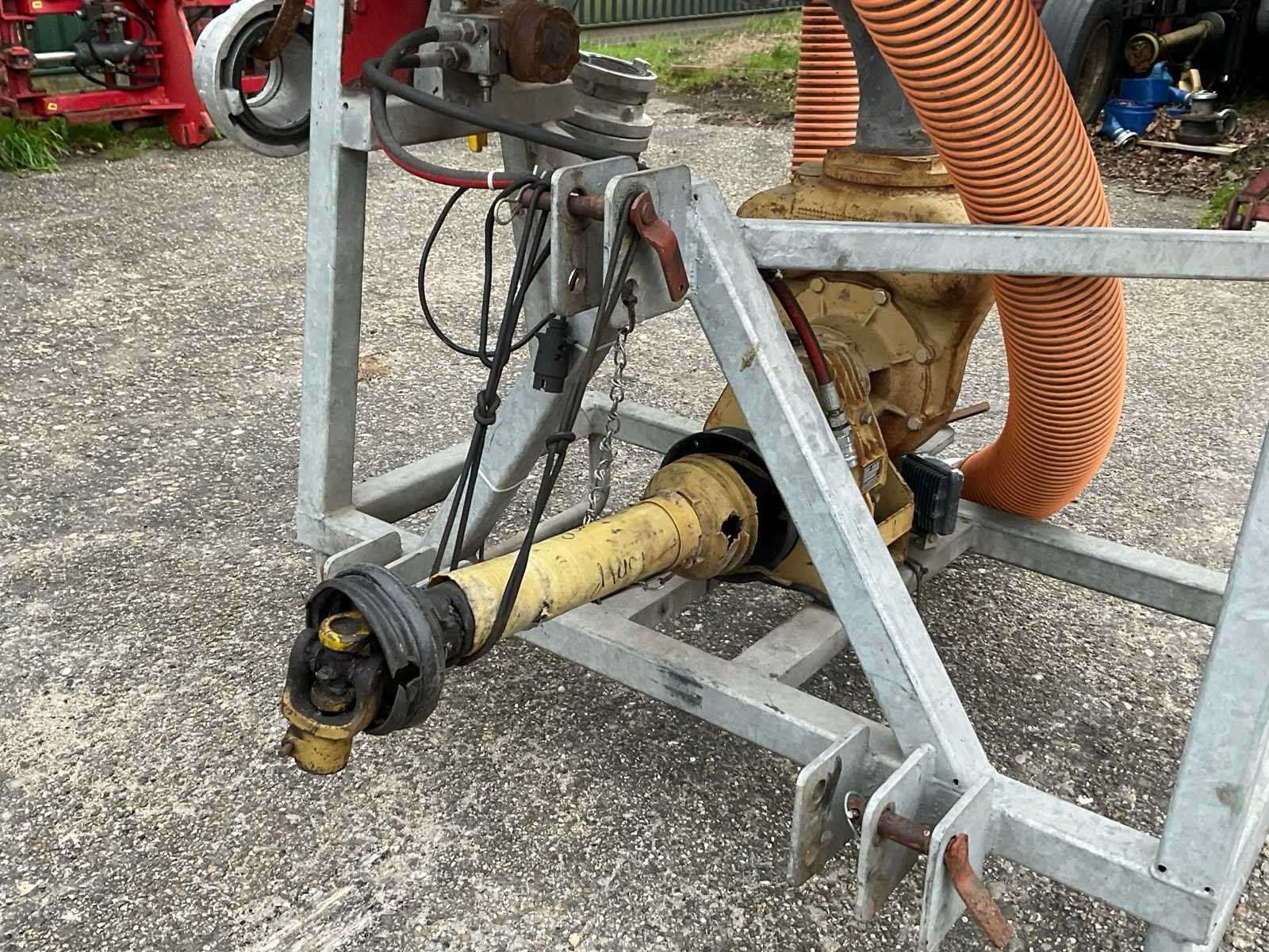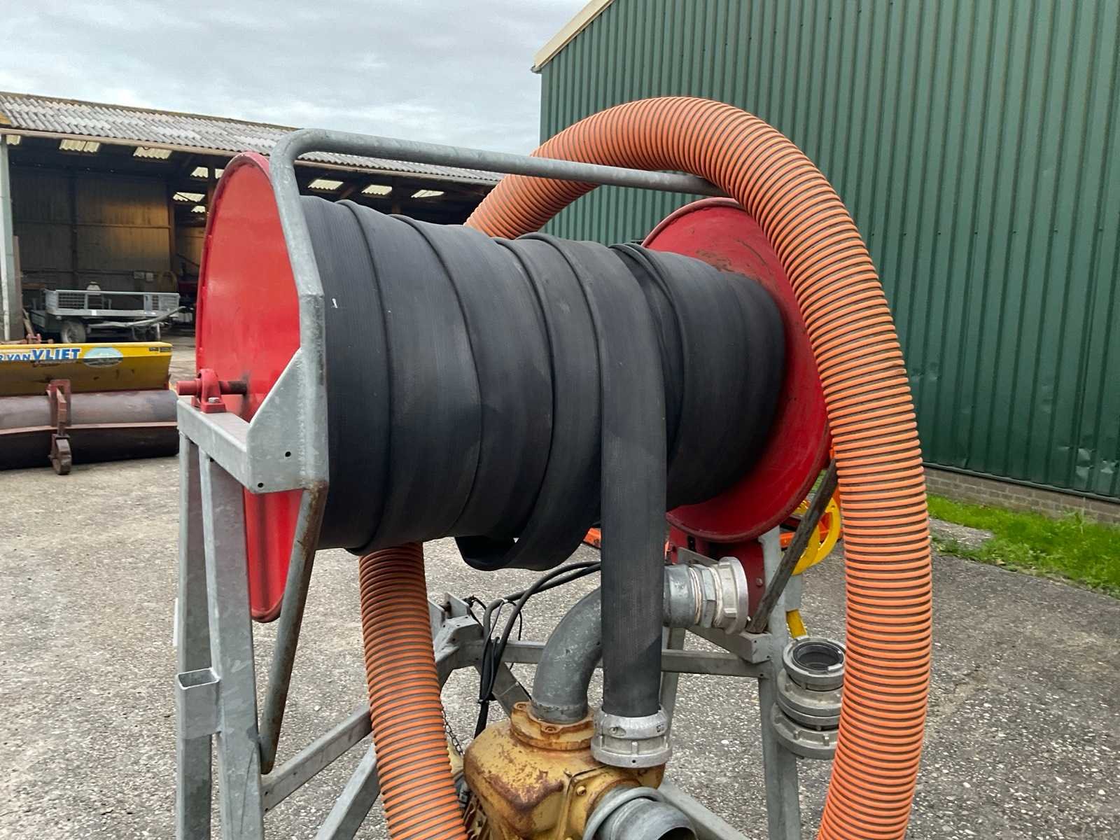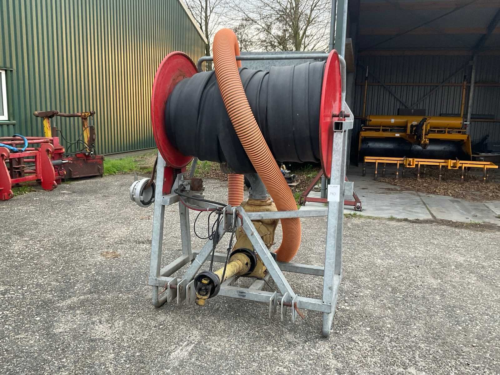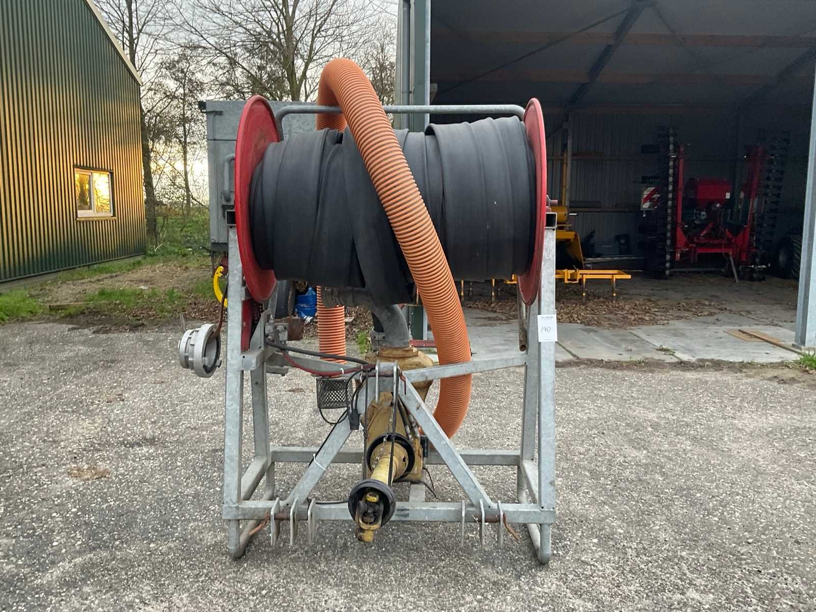 5- duims aanzuigslang met zuigkorf, 4-duims storz persaansluiting, 4- duims waterslang L 90 mtr, haspel hydraulisch aangedreven, 2 stuks verloopkoppelingen 6x4, 2 storz sleutels Merk: Comer Totale afmeting L: 1500mm Totale afmeting Breedte: 1400mm Totale afmeting Hoogte: 2000mm