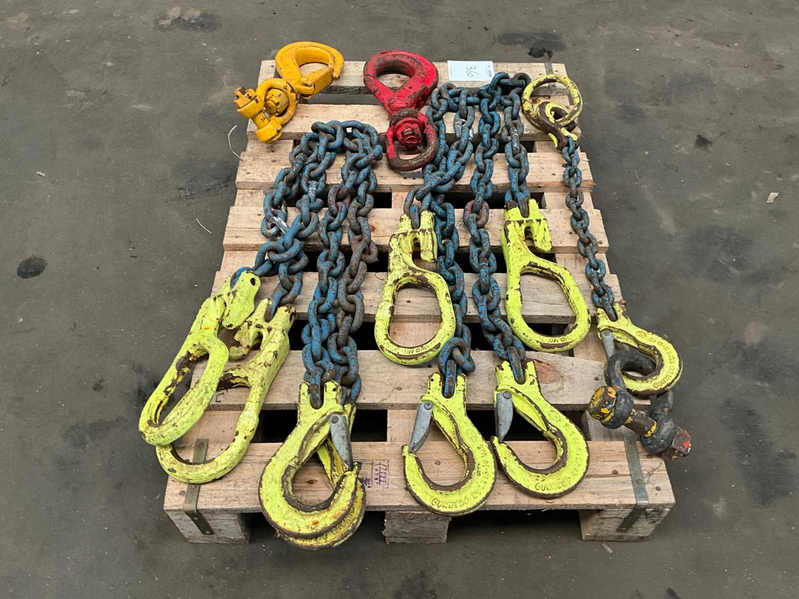 4x inkortbare enkele hijsketting (lengte circa 1500 mm), 1x 800 mm enkele hijsketting, 2x draai hijshaak (5/8” + 16-8)