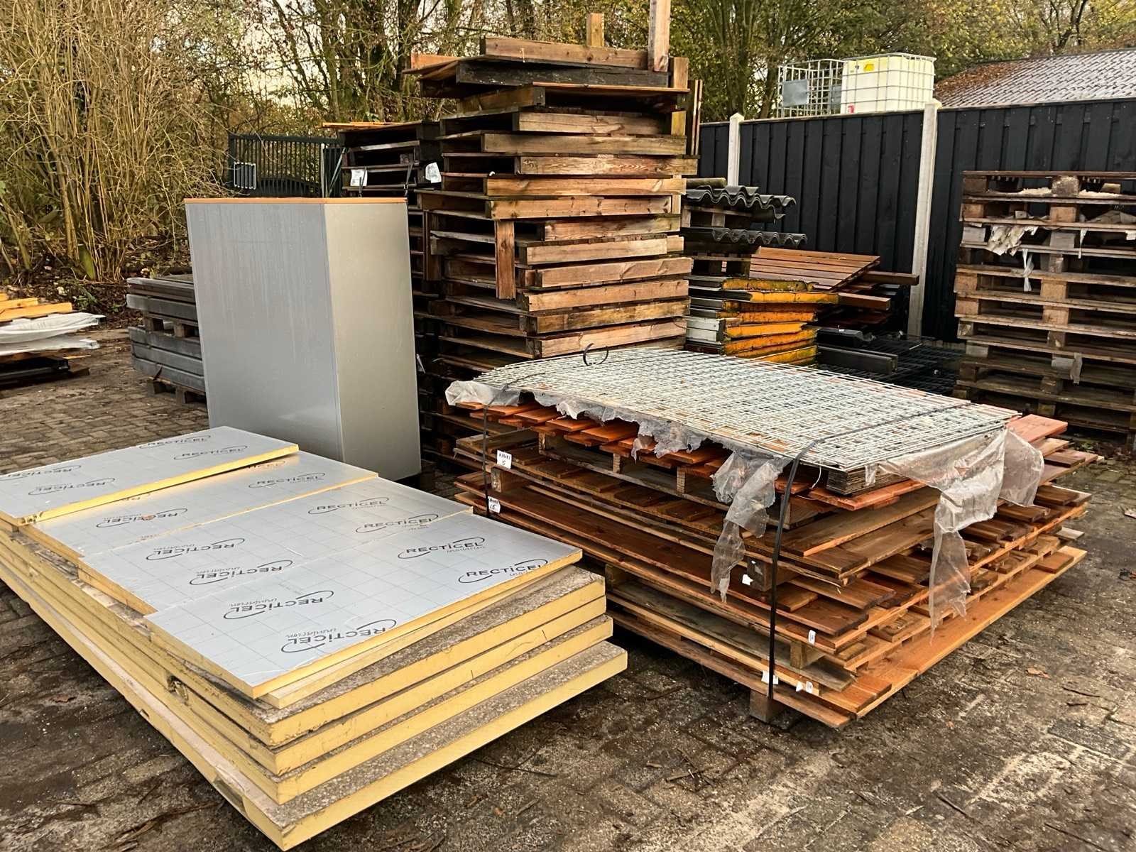 Bestaande uit: pallets, tuin omheining, golfplaten, isolatieplaten en kast