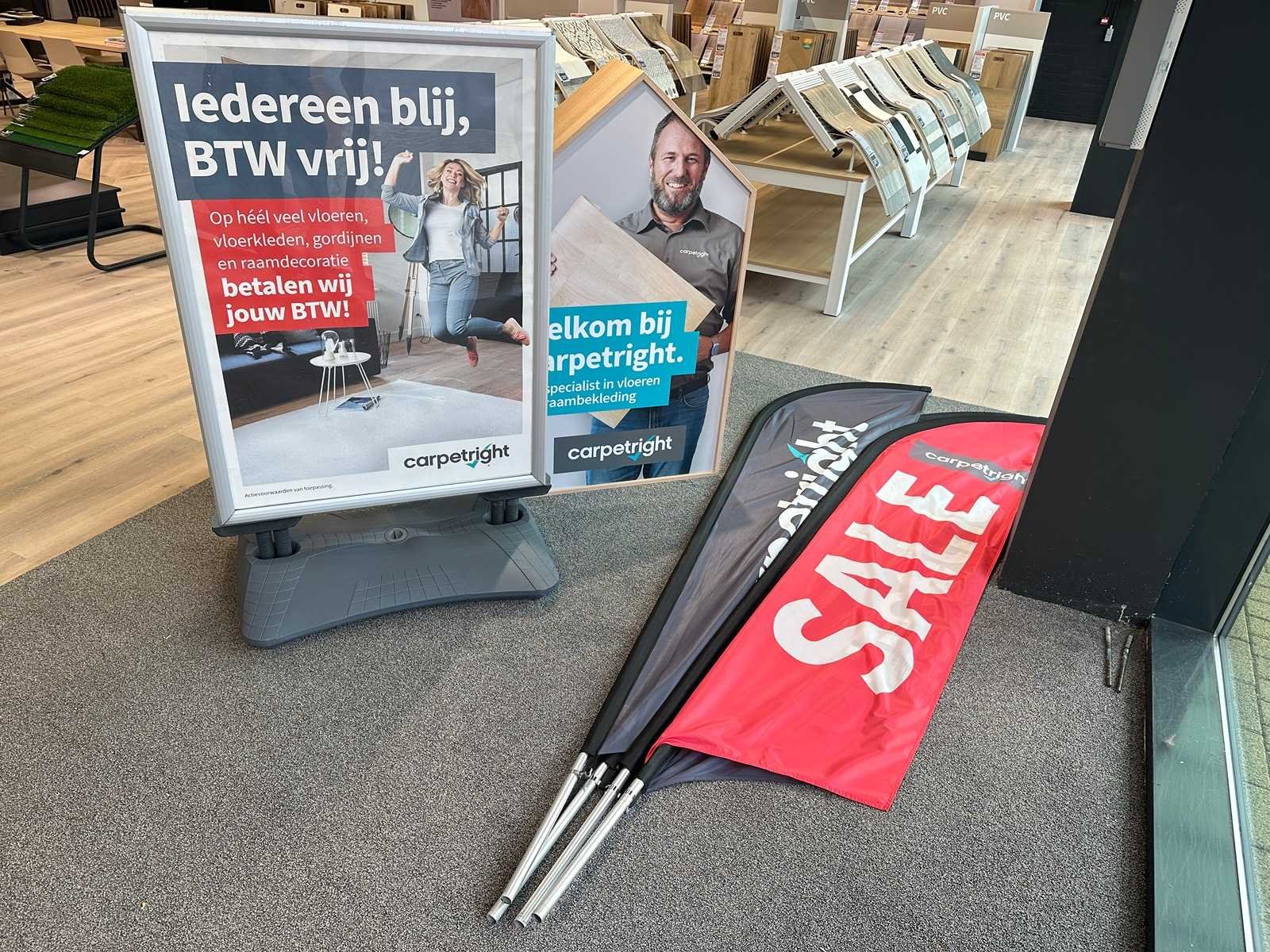 Mobiel stoepbord met houten decoratiestuk en vier beachvlaggen