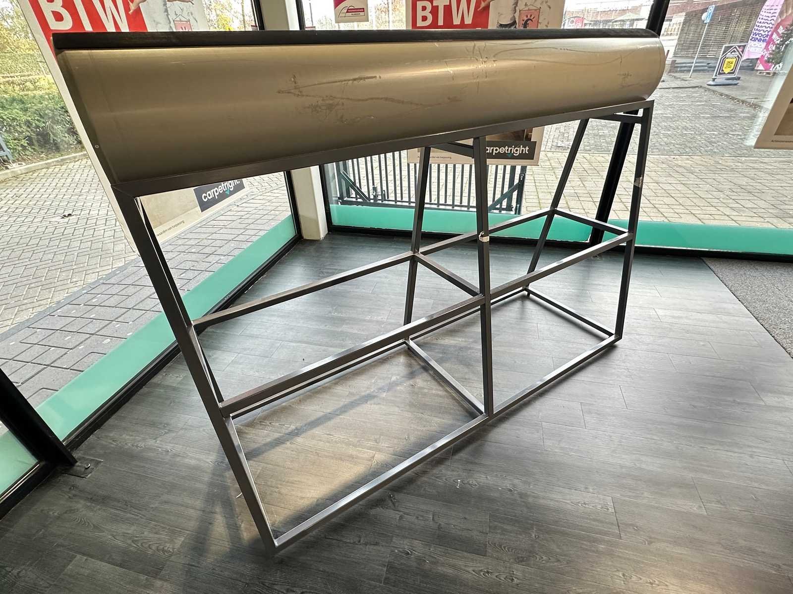 Stalen frame met houten rol. Voorzien van stelbare poten. De tweede bok staat in het magazijn. Totale afmeting L: 2000mm Totale afmeting Breedte: 700mm Totale afmeting Hoogte: 1470mm