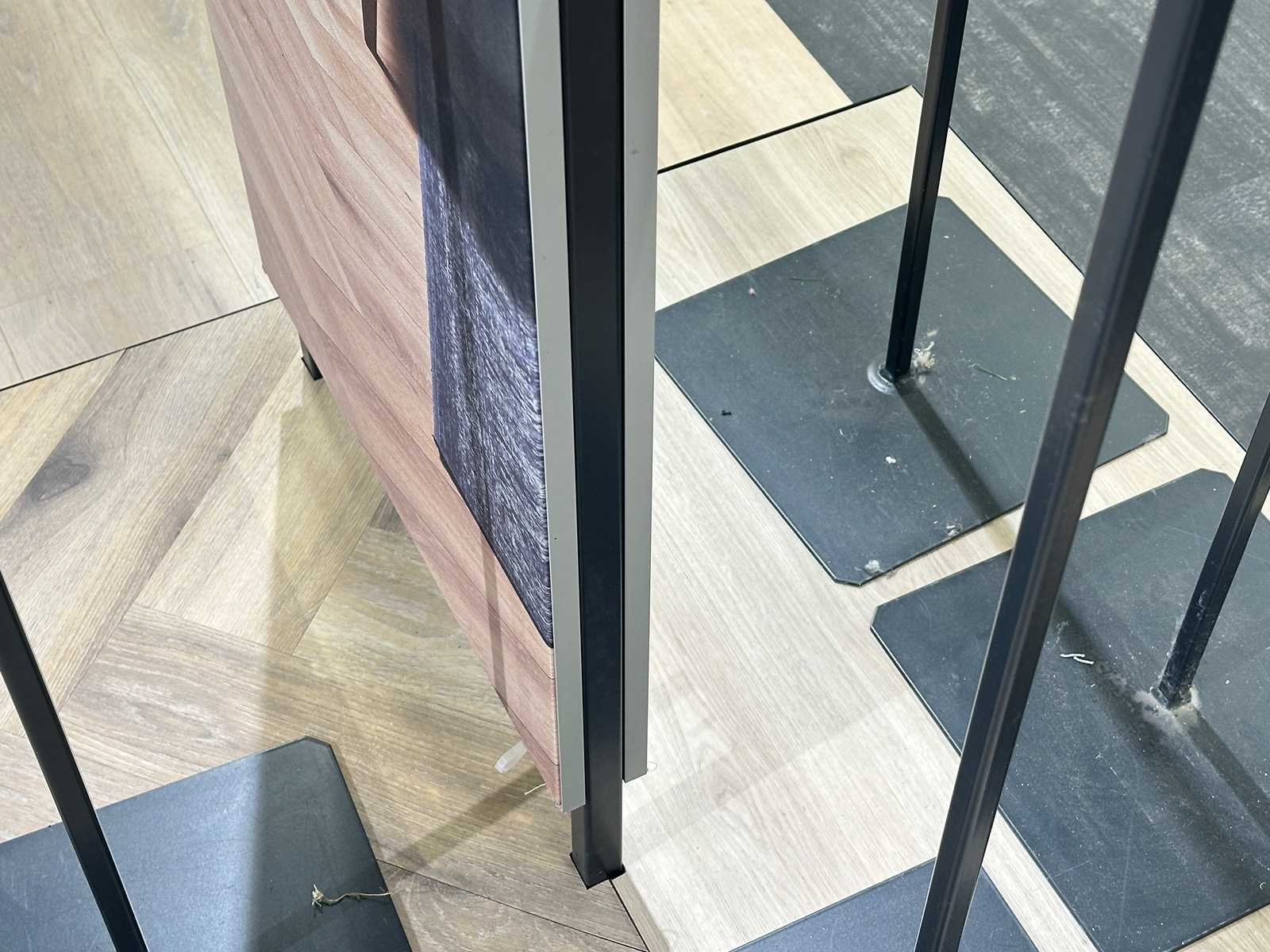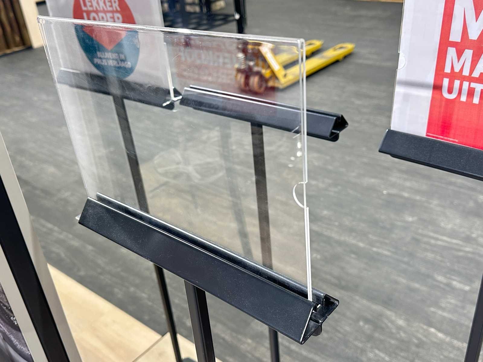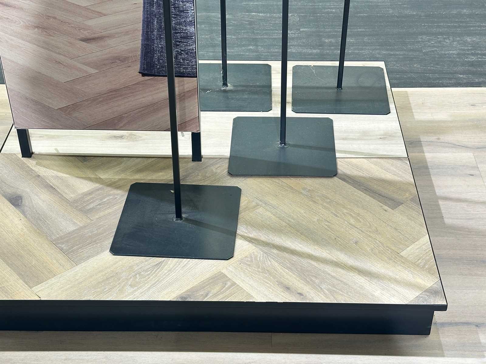 Plateau van hout en metaal en 5 metalen prijskaarthouders.