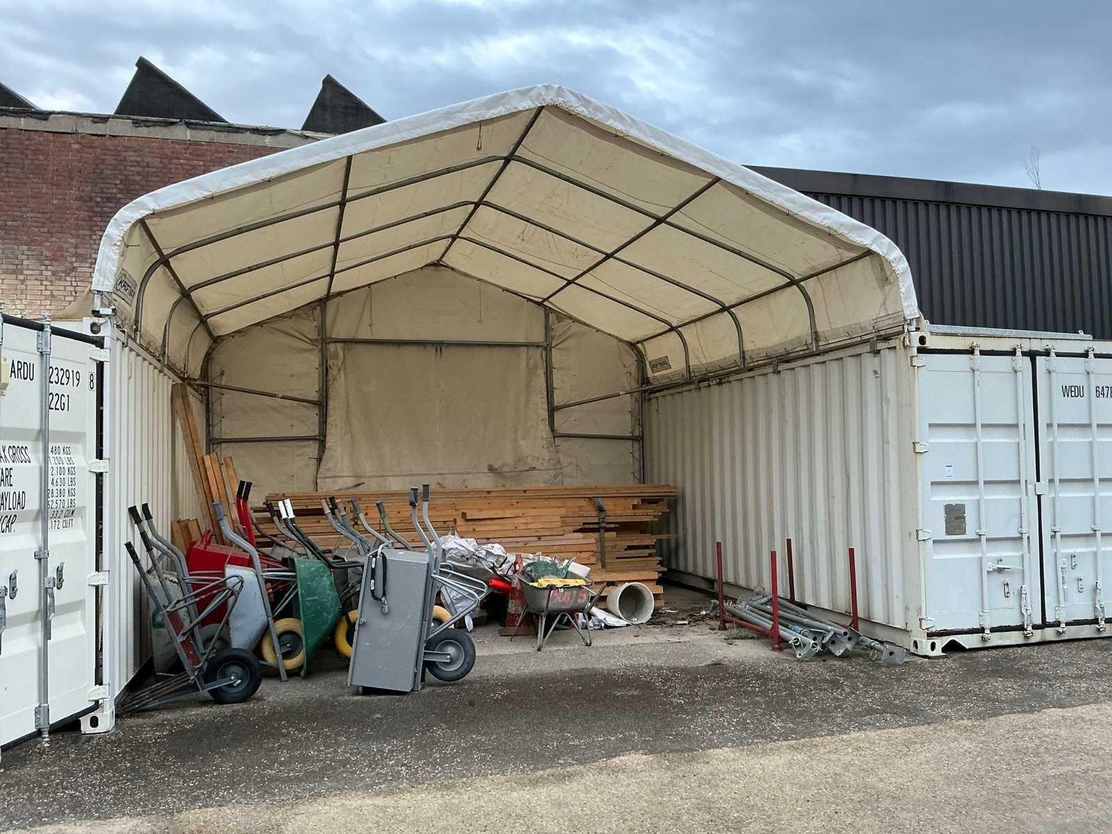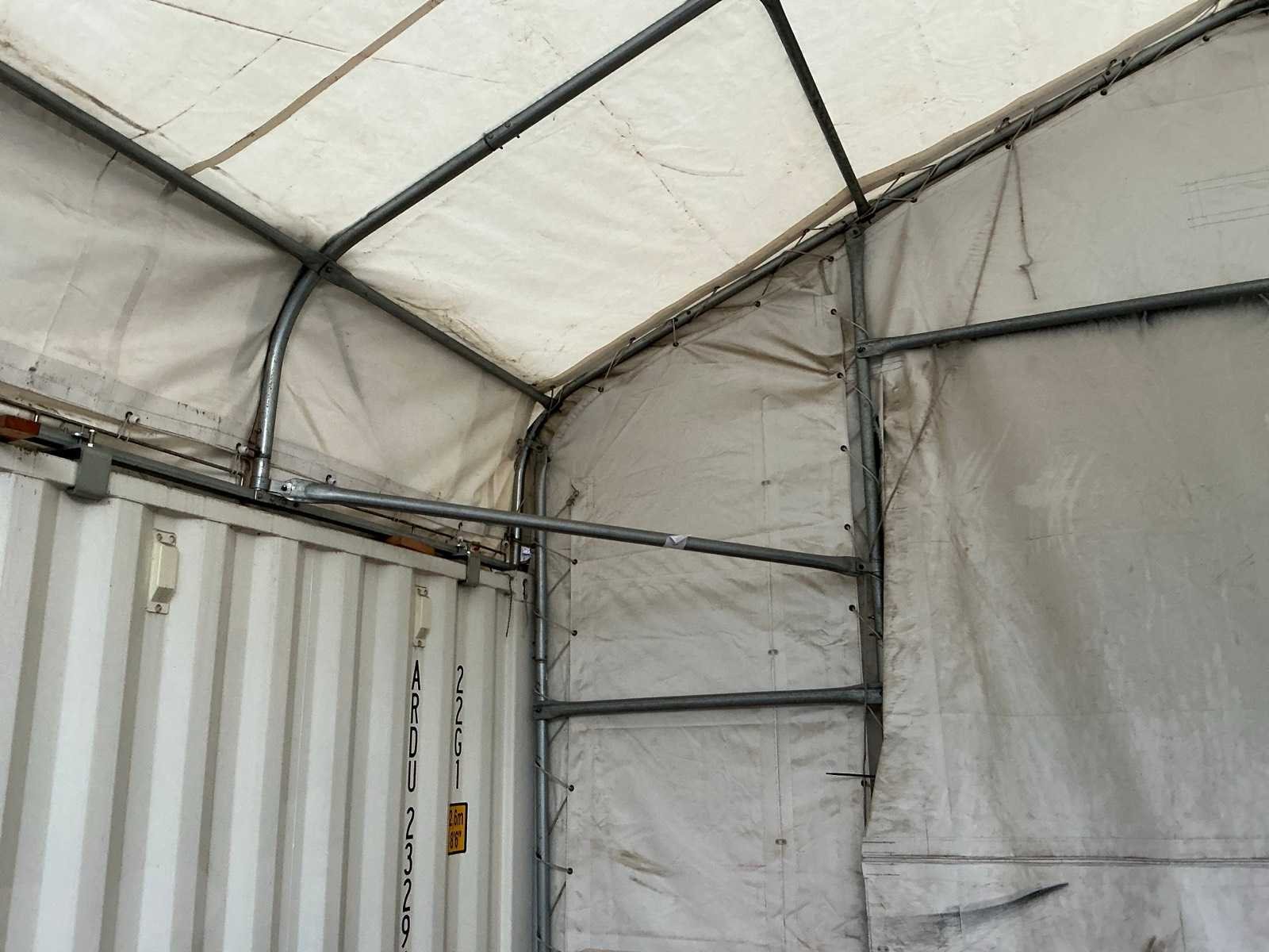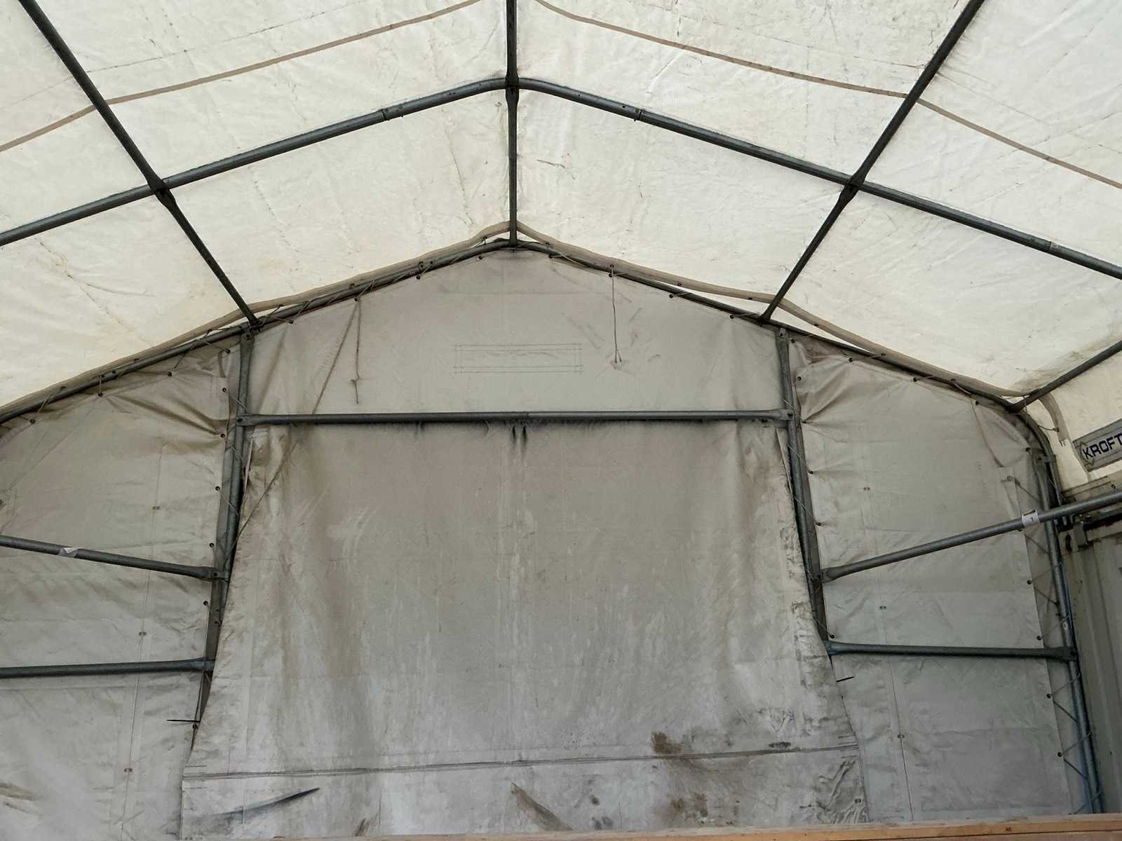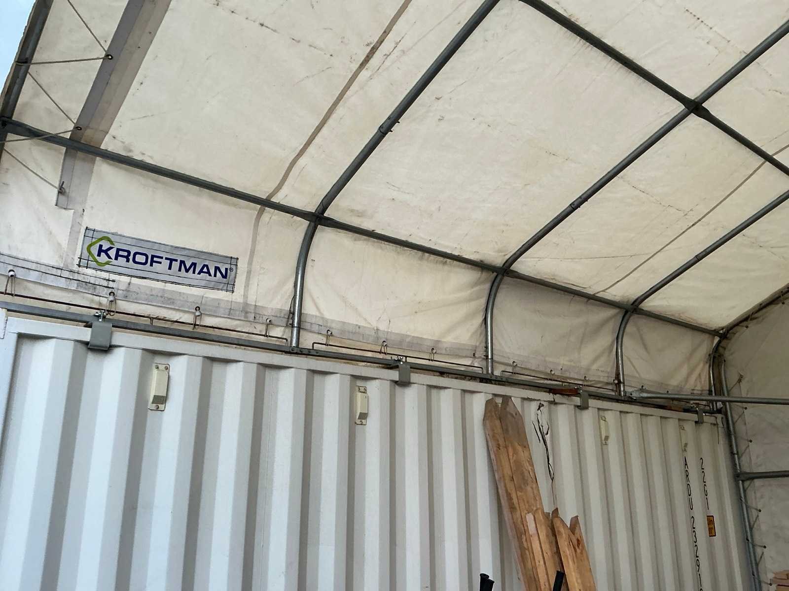 Zadeldak, 6x6 meter, voorzien van 8 bevestigingsklemmen voor zeecontainers en achterwand met deur Merk: Kroftman Type: CTS606