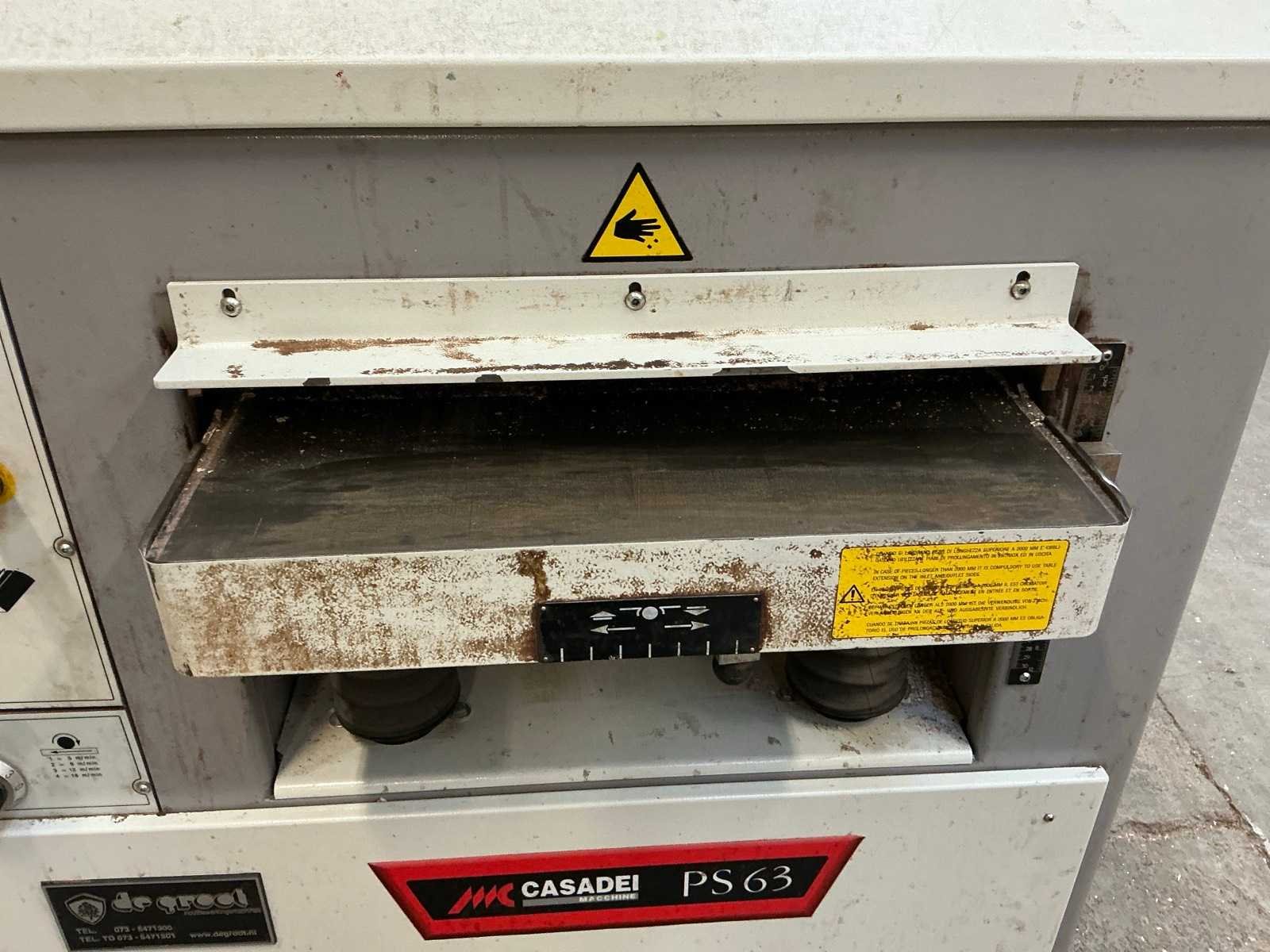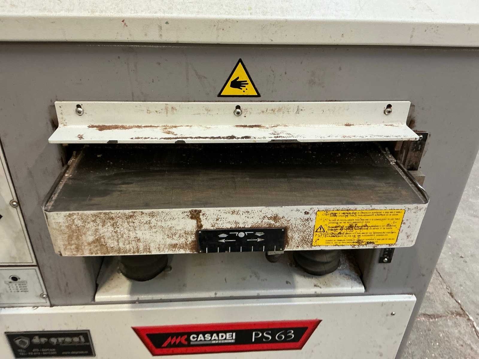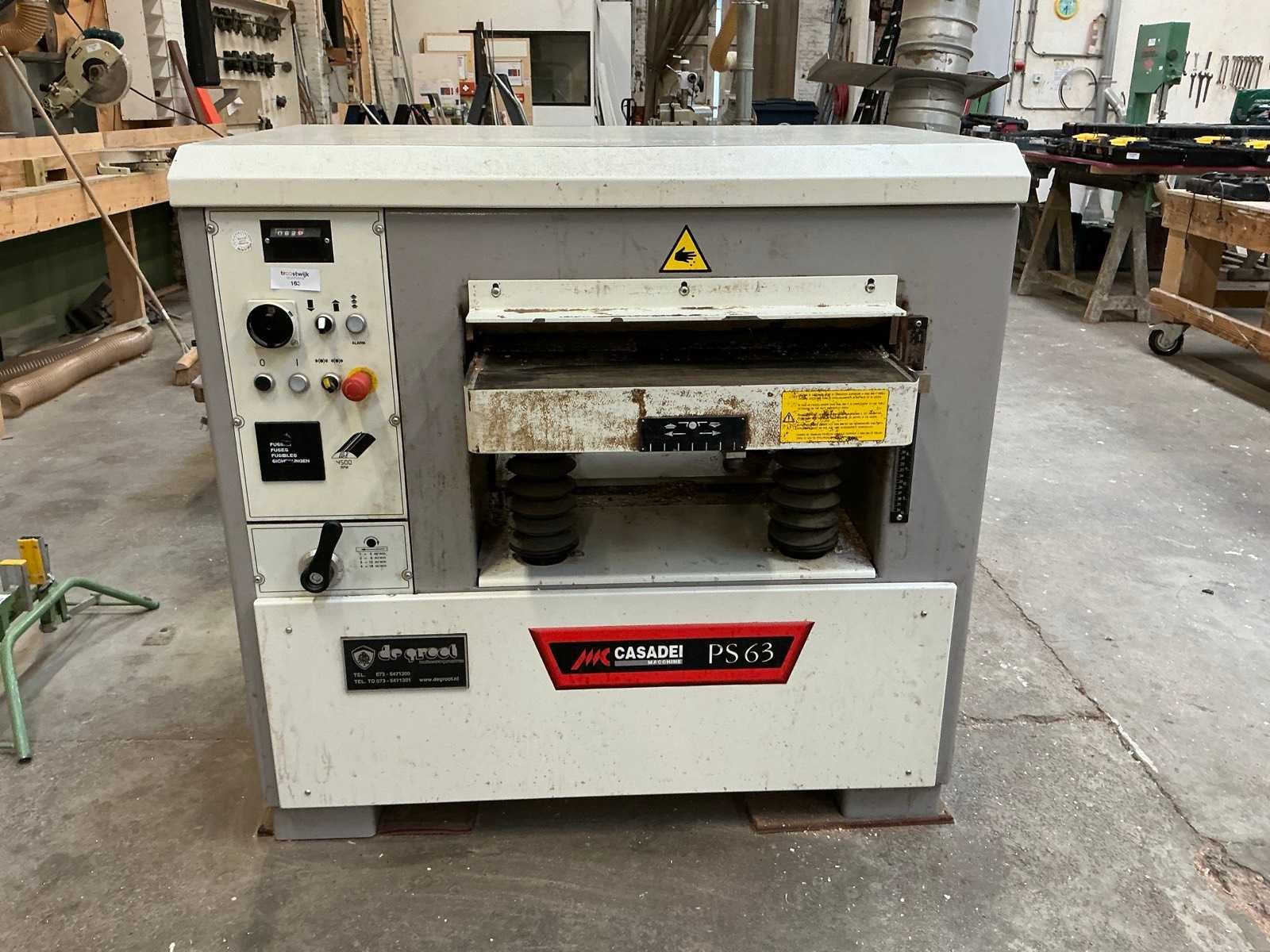 Voorziening elektrische hoog-laag verstelling. Afzuiging alleen tot de afsluiter. Merk: Casadei Type: PS63 Bouwjaar: 2010 Serienummer: AB 201419 Werkbreedte: 630mm Aansluiting: 400V Machinegewicht: 790kg Afmeting l: 1230mm Afmeting b: 900mm Afmeting h: 1180mm