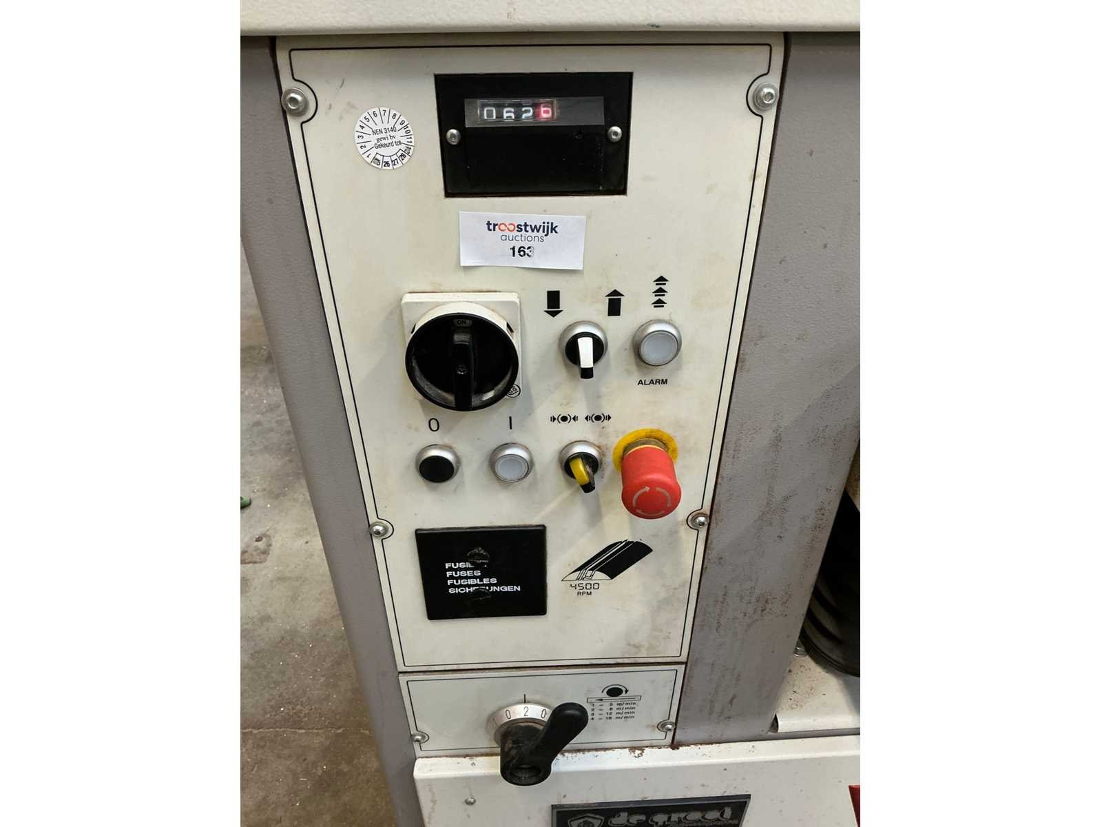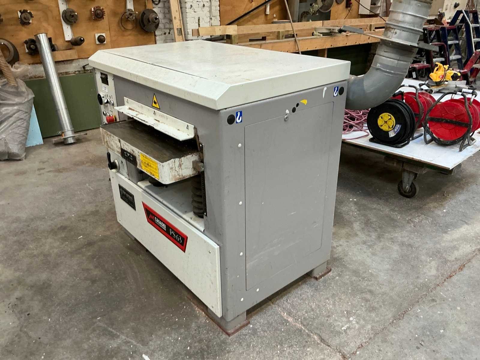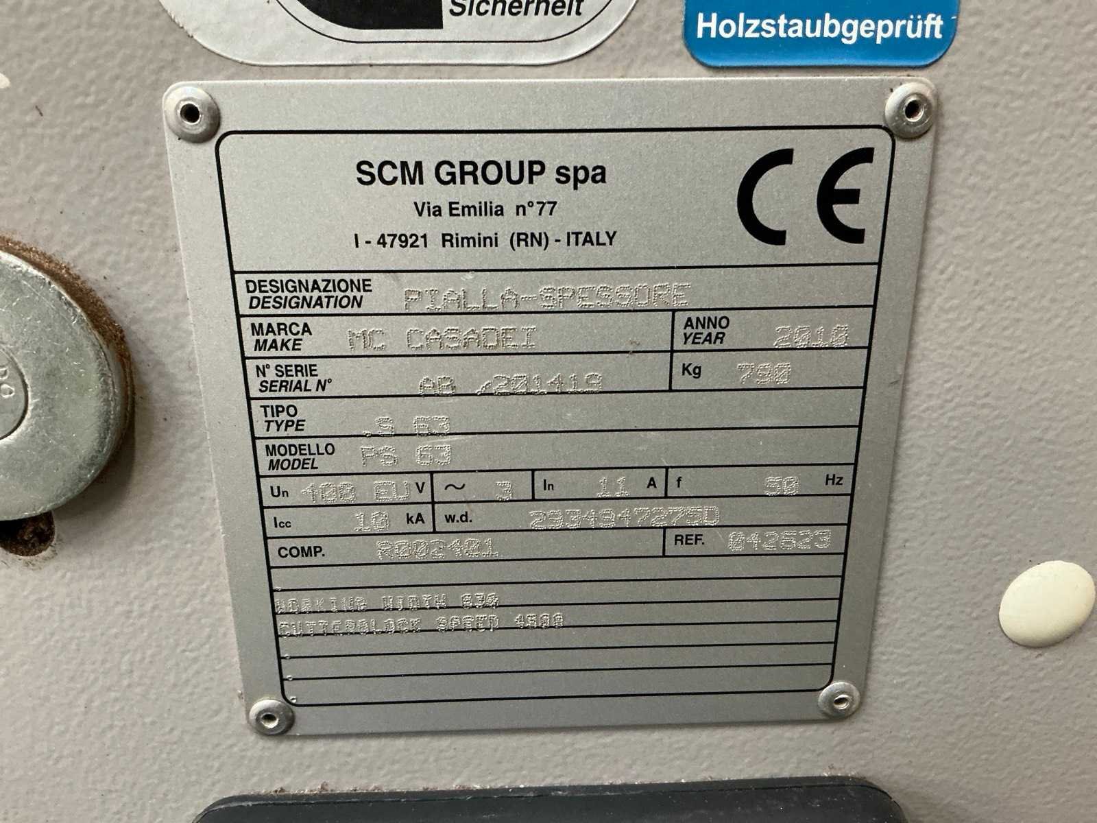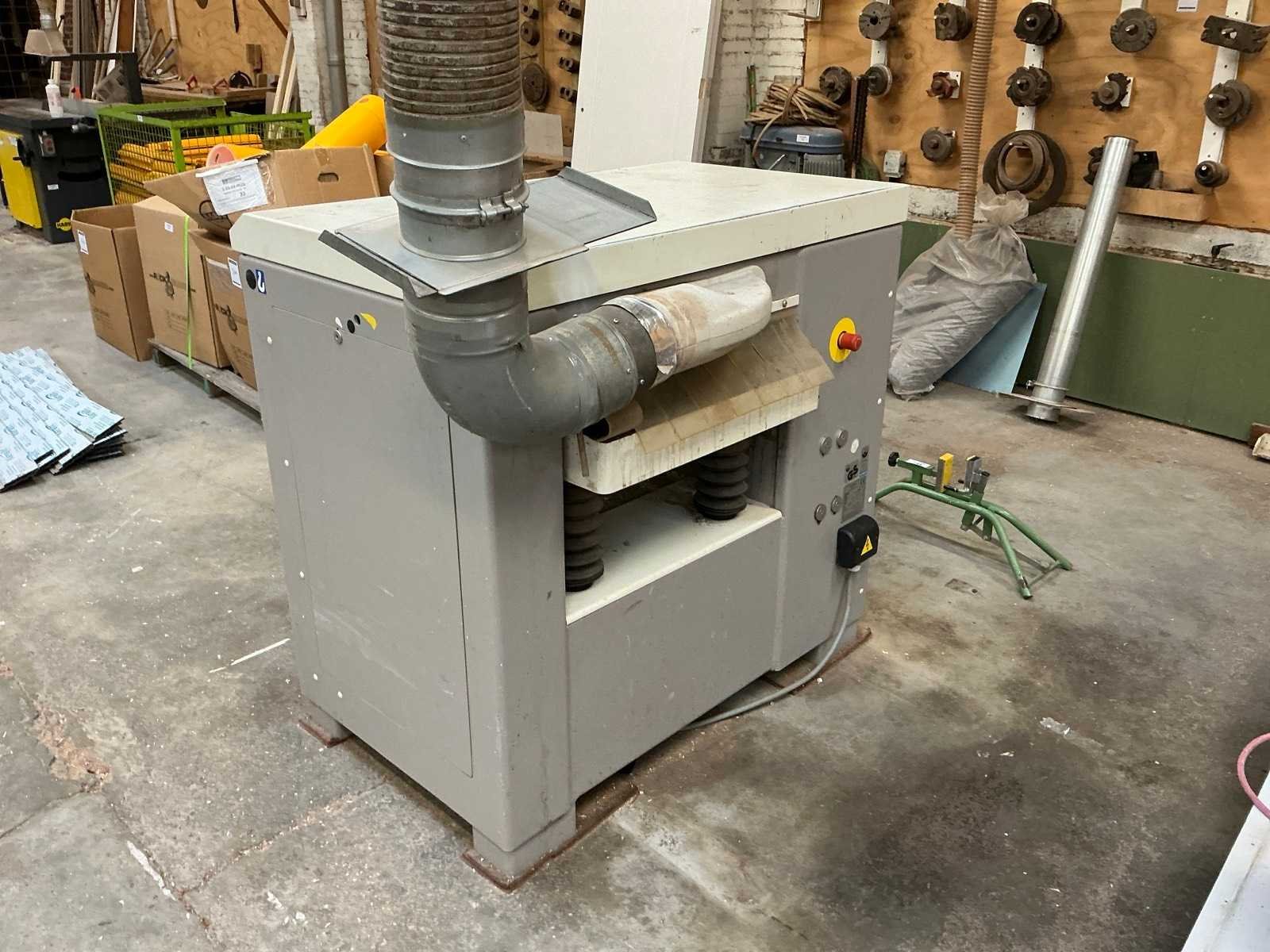 Voorziening elektrische hoog-laag verstelling. Afzuiging alleen tot de afsluiter. Merk: Casadei Type: PS63 Bouwjaar: 2010 Serienummer: AB 201419 Werkbreedte: 630mm Aansluiting: 400V Machinegewicht: 790kg Afmeting l: 1230mm Afmeting b: 900mm Afmeting h: 1180mm