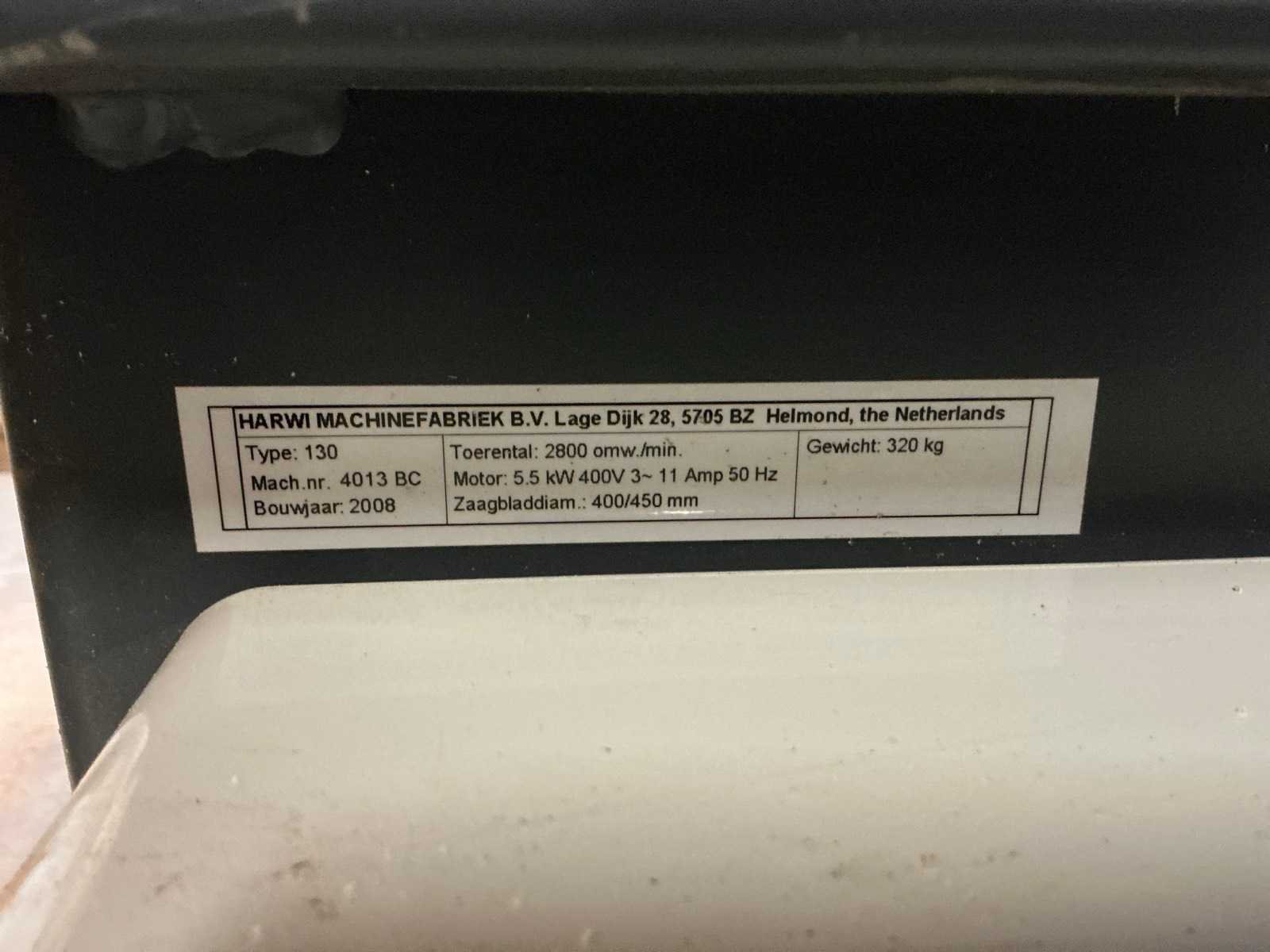 Exclusief afzuigbuis, alleen de flexibele slang Merk: Harwi Type: 130 Bouwjaar: 2008 Serienummer: 4013BC Zaagblad Ø: 400mm Tafel afmeting l: 1130mm Tafel afmeting b: 970mm Motorvermogen (kW): 5.5kW Aansluiting: 400V Machinegewicht: 320kg Totale afmeting Hoogte: 860mm