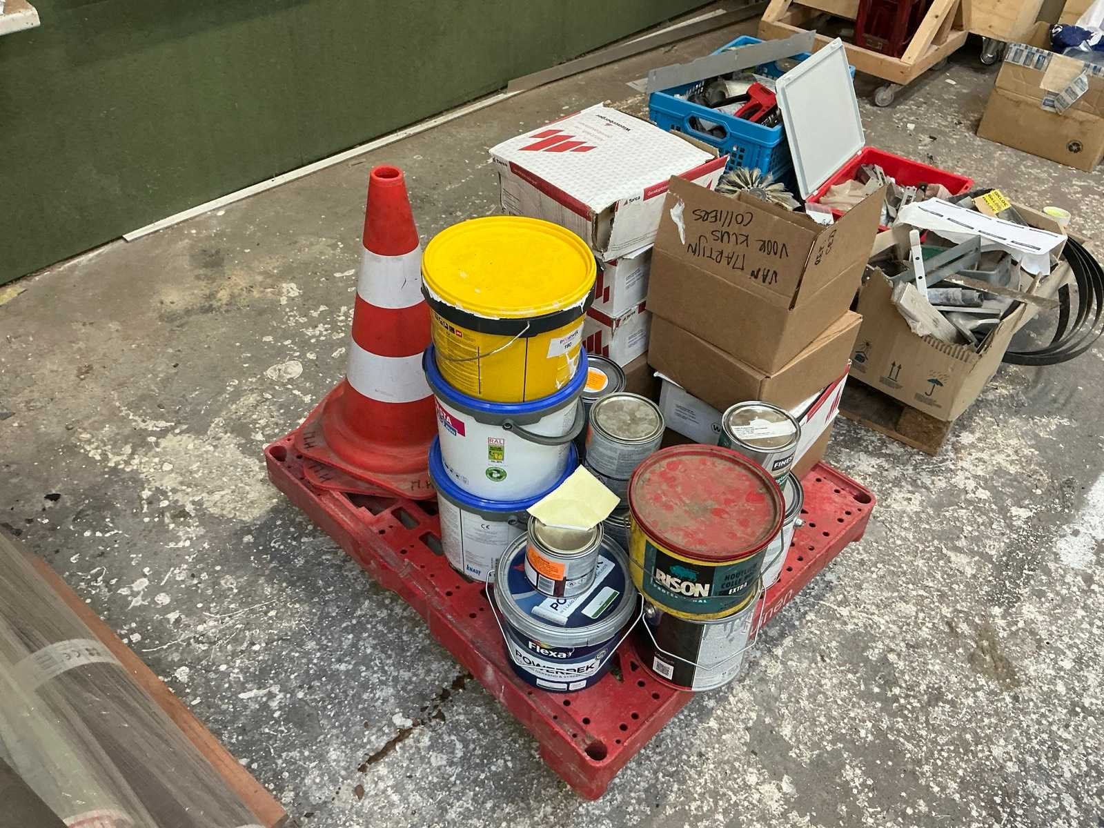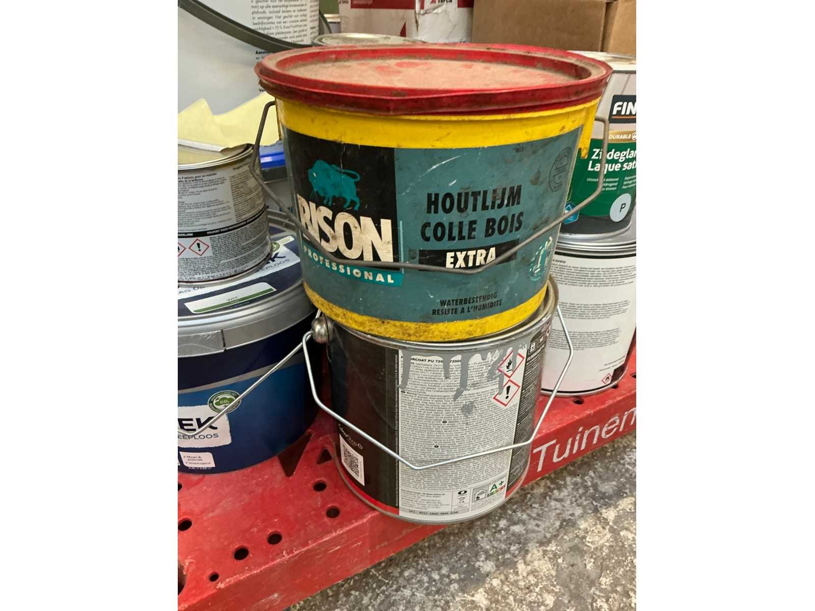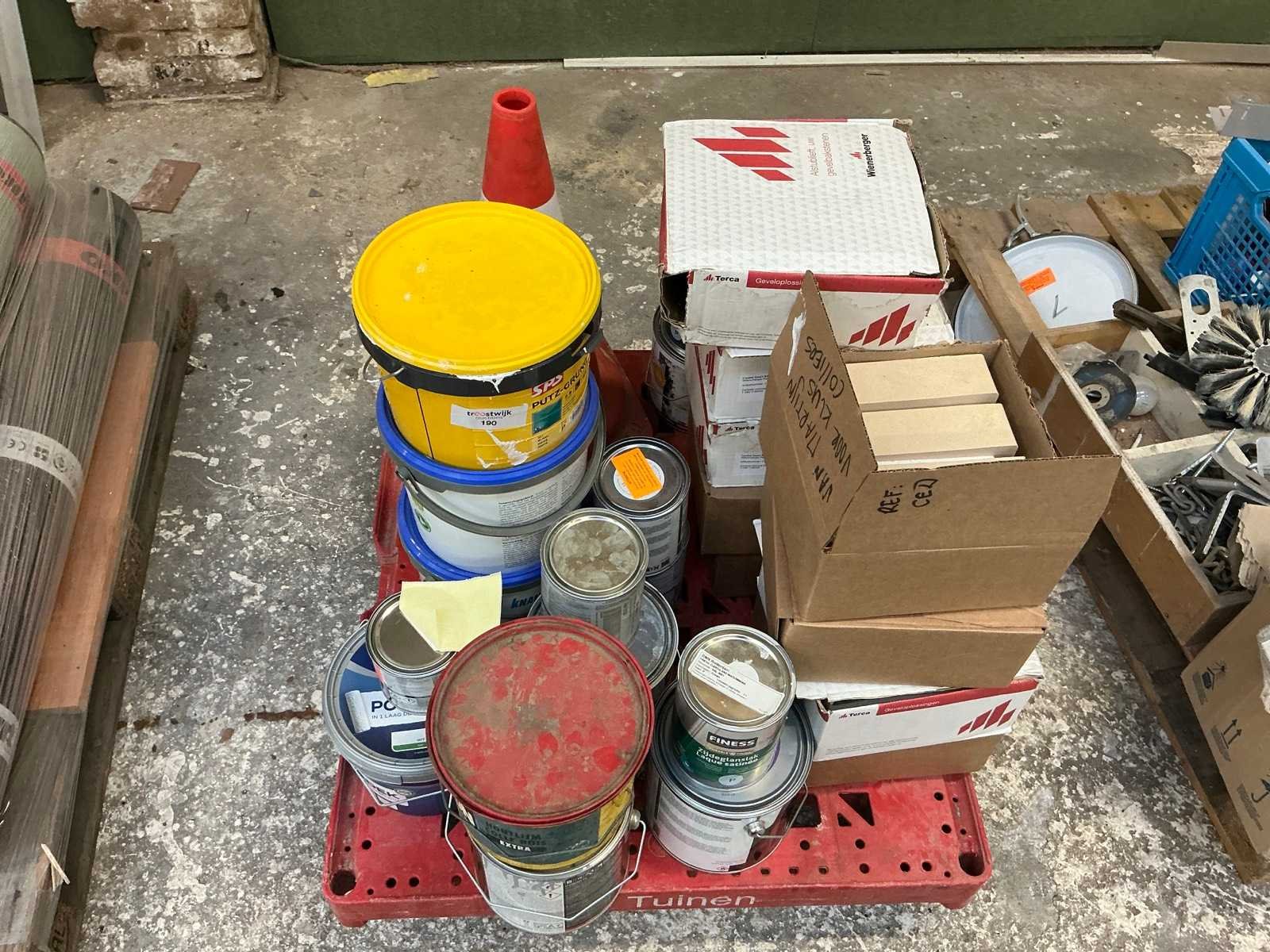 Partij verf, lijm en stenen