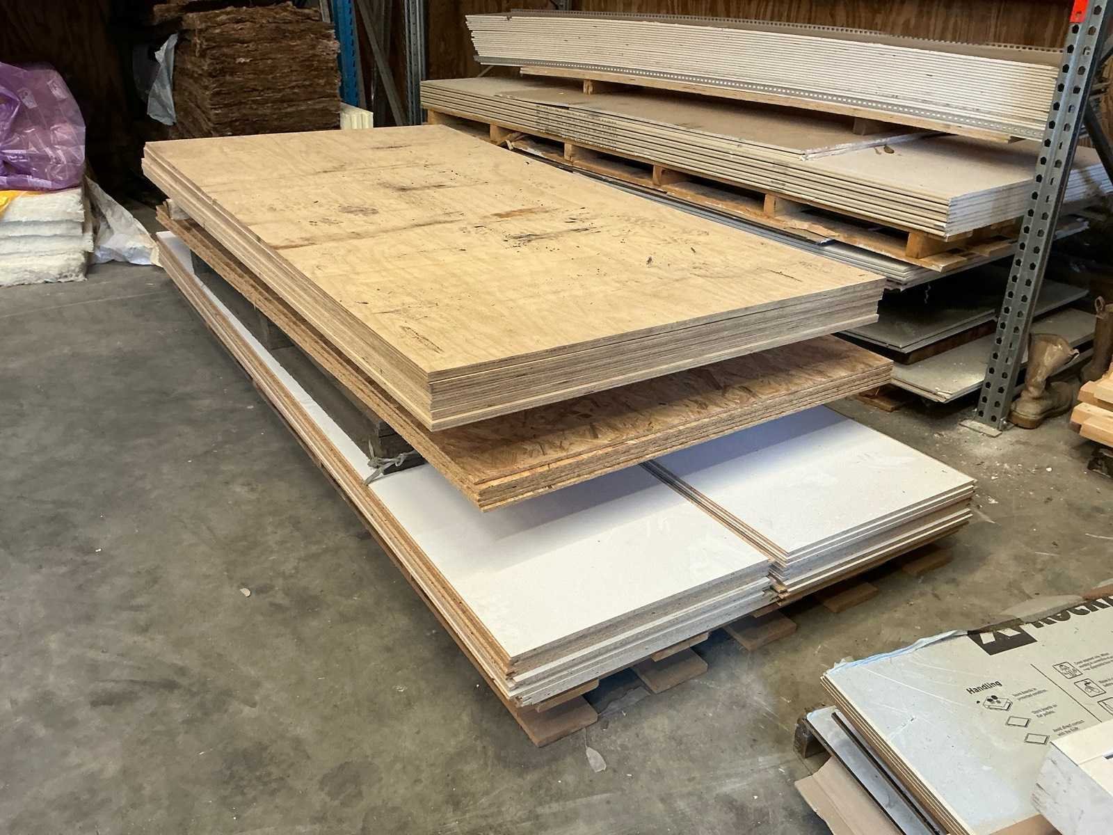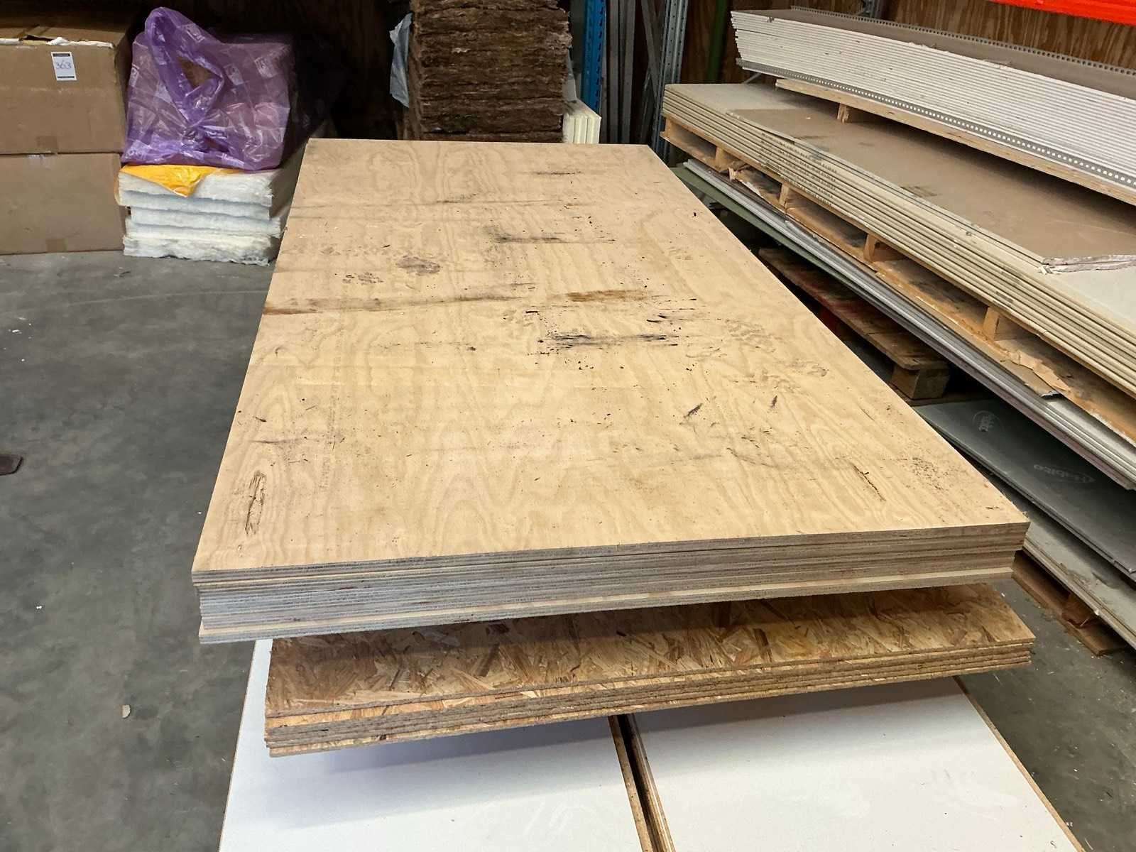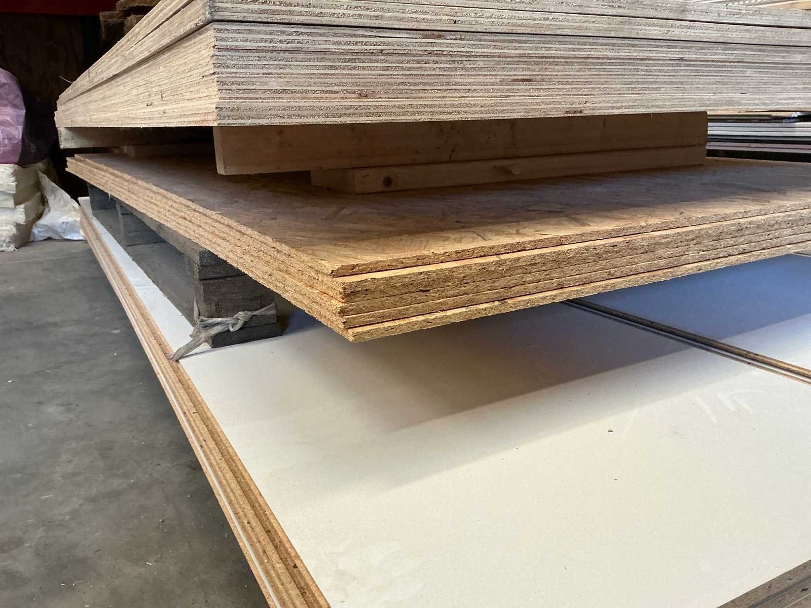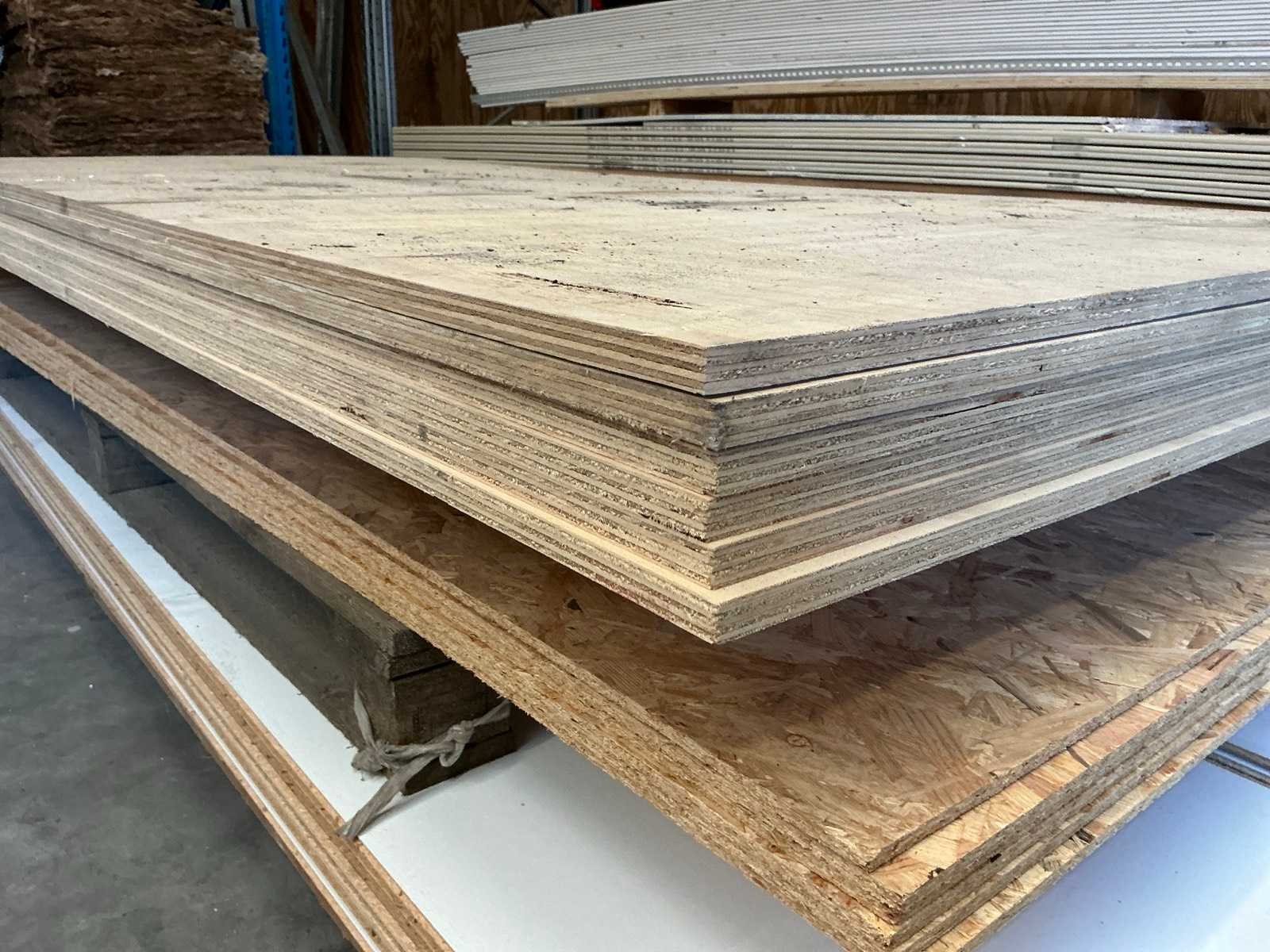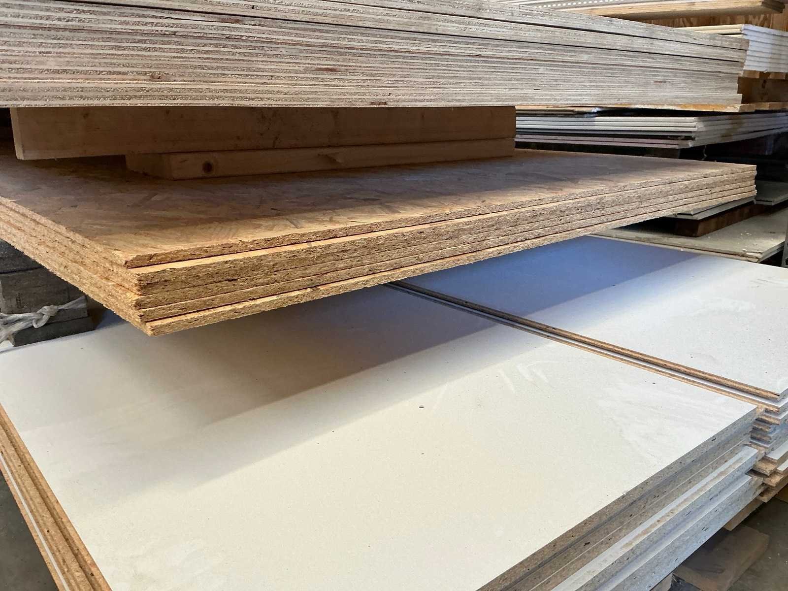 Bestaande uit: 6x Multiplex: 2440x1220x18 mm, 6x OSB: 2440x1220x9 mm en 20x OSB gegrond mes en groef: 3000x600x12 mm