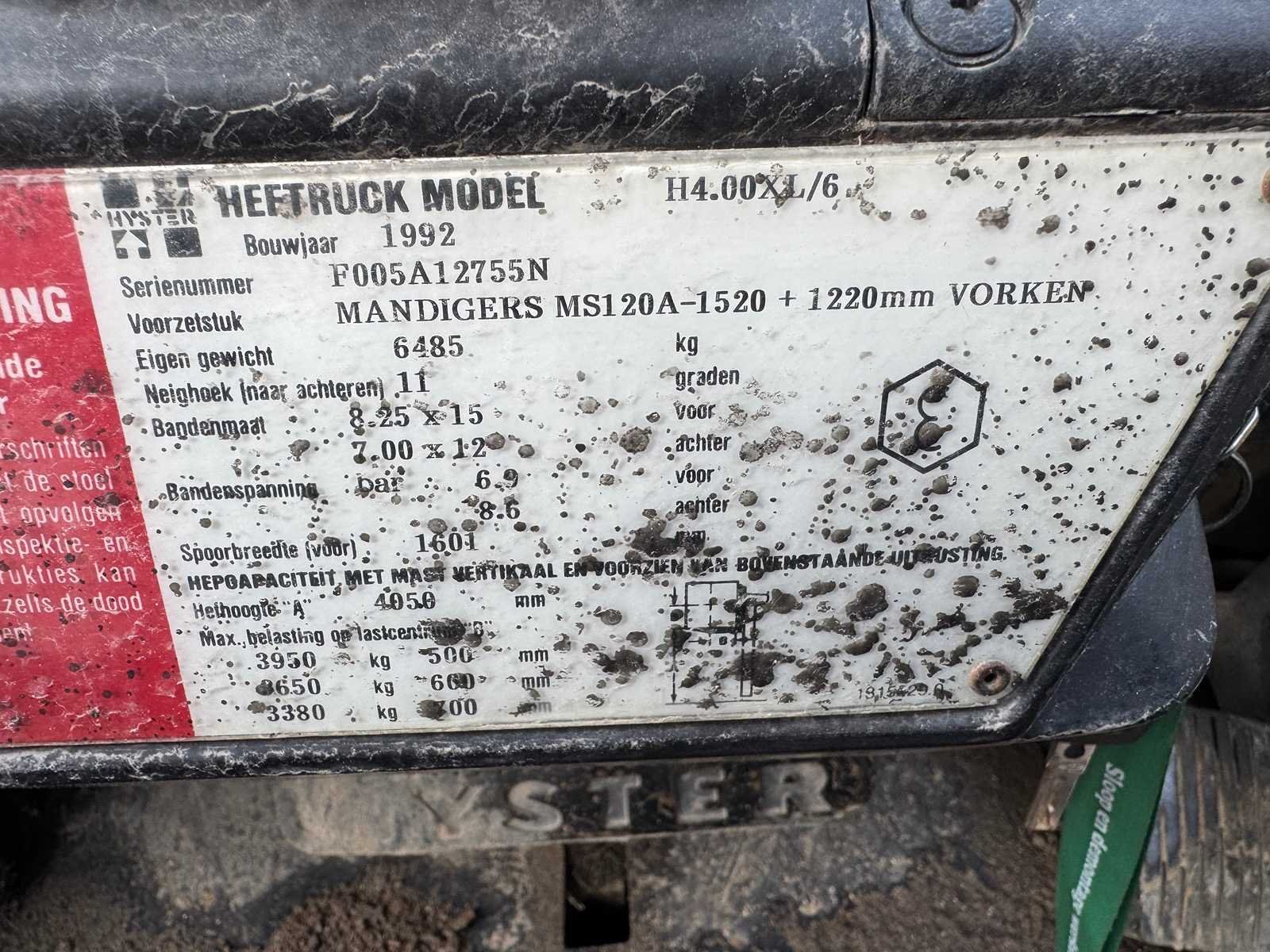 Heftruck start rijdt en remt goed, urenstand loopt nog iets op, uitlevering op afspraak Merk: Hyster Type: H.400XL/6 Serienummer: F005A12755N Brandstof: diesel Kenteken: TKG-46-V Side-shift: true Duplex mast: true Eigen gewicht: 6485kg Hefvermogen: 4000kg Hefhoogte: 4050mm Minimale doorrijhoogte: 2800mm Diesel: true