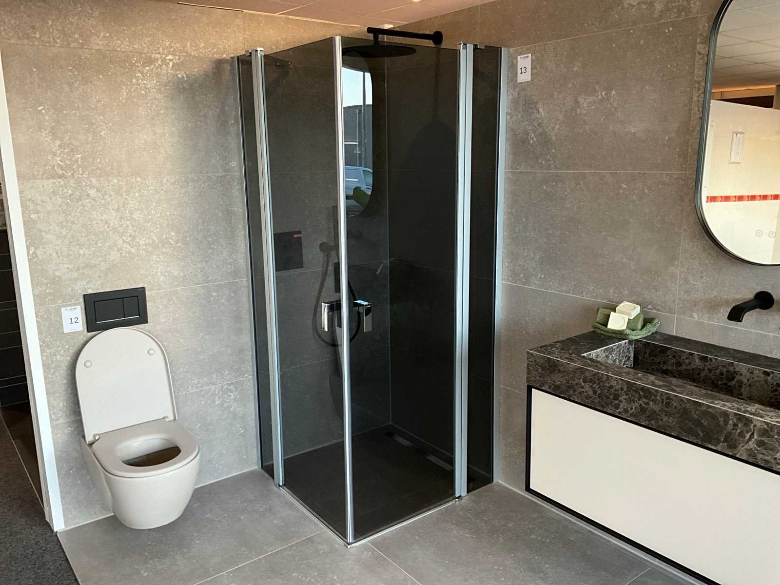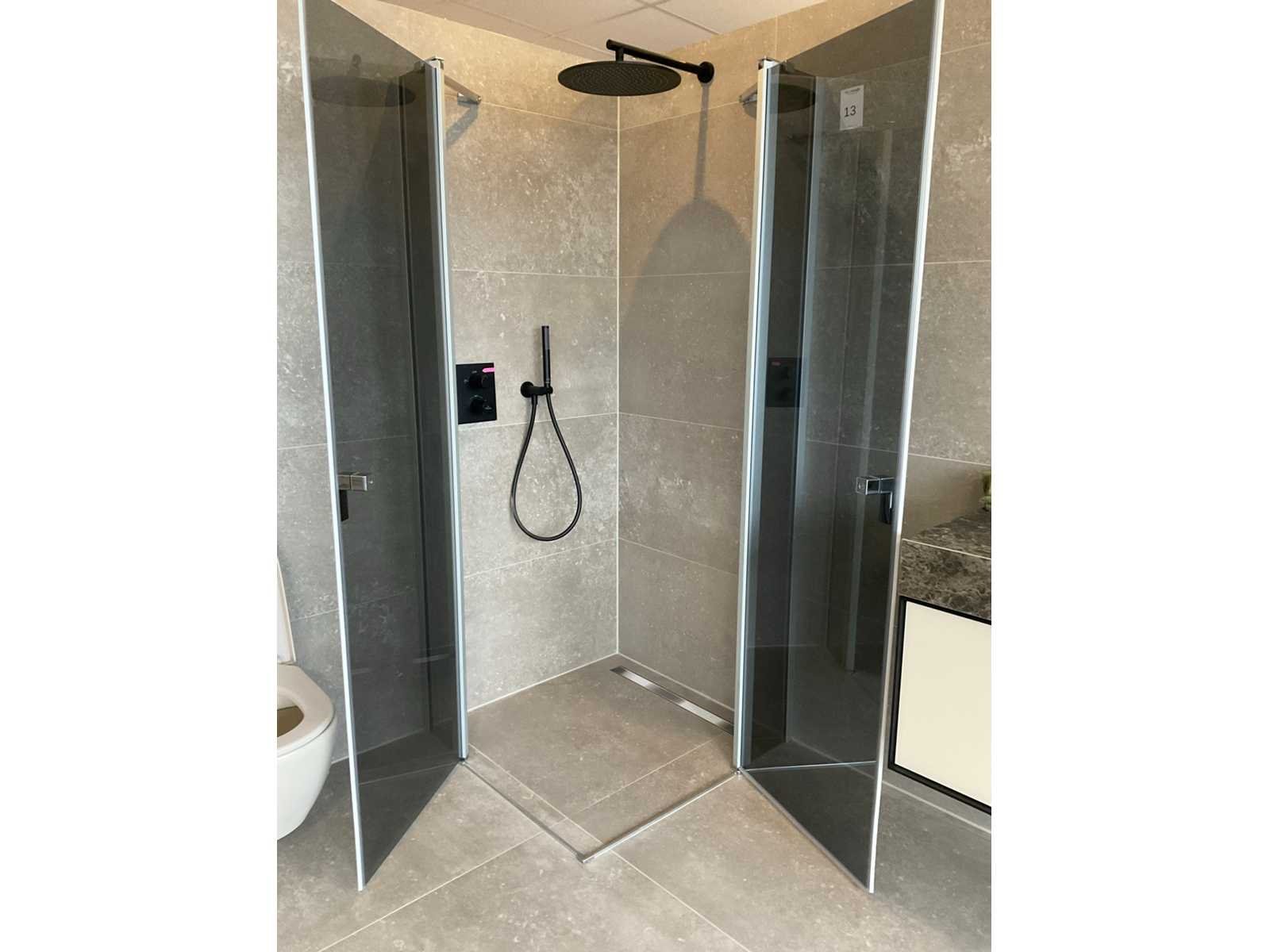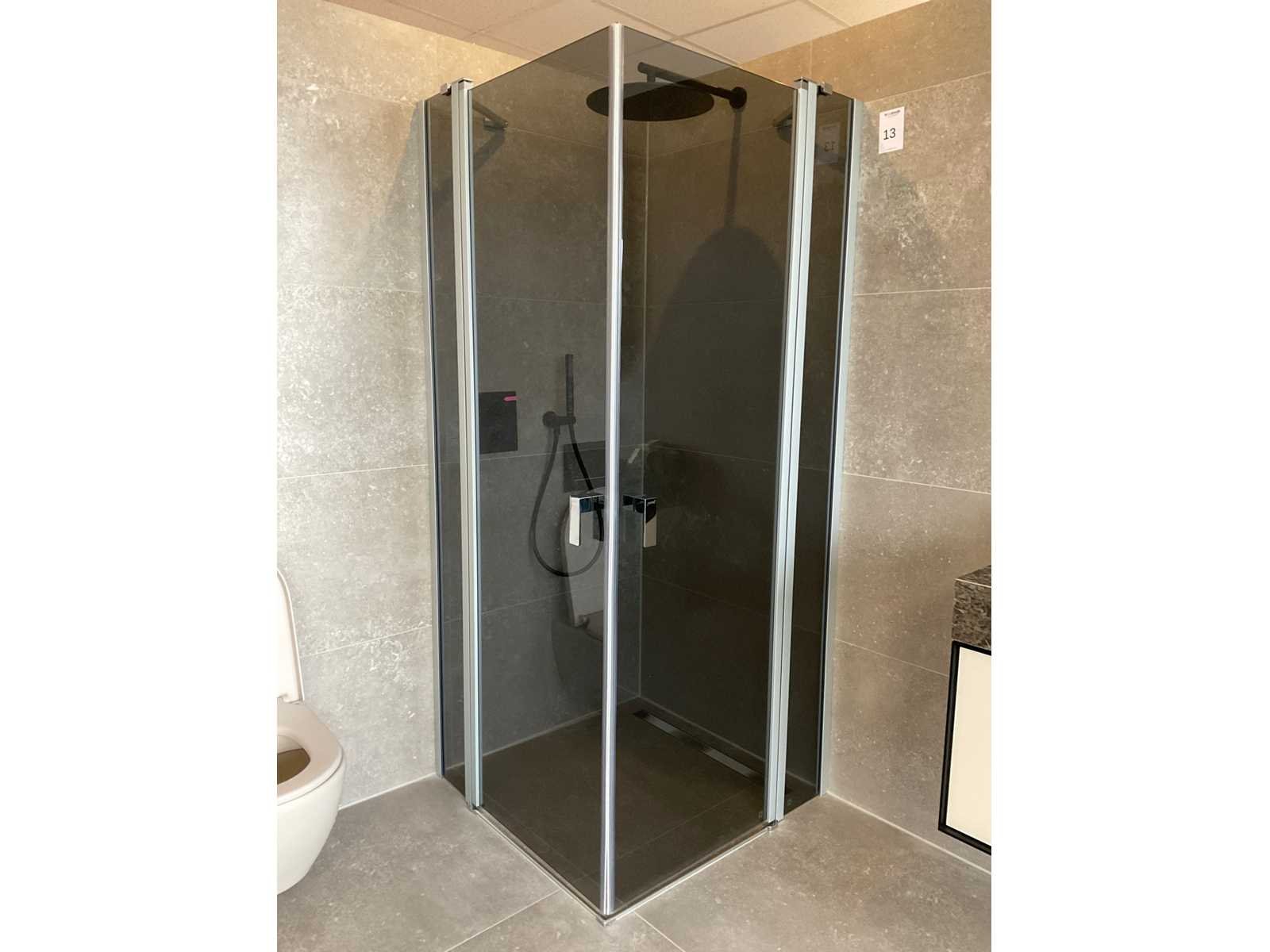 Inclusief: “Dummy” Villeroy & Boch regendouche (Ø35cm) en mengkraan. Let op! Zonder inbouw binnenwerk. Merk: Hüppe Lengte: 85cm Breedte: 85cm Hoogte: 200cm Materiaal: Glas