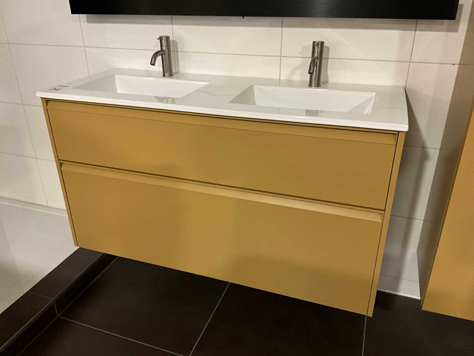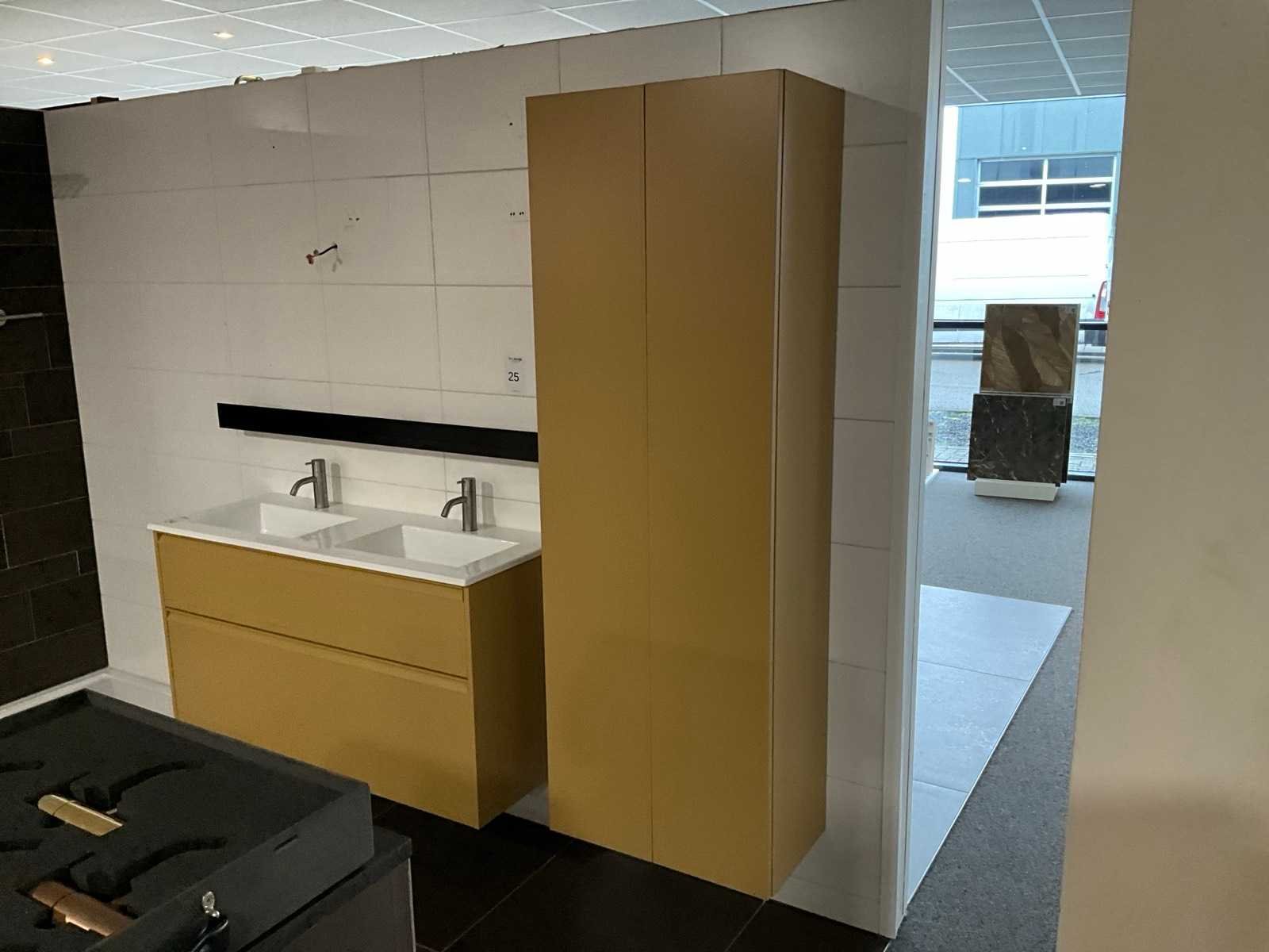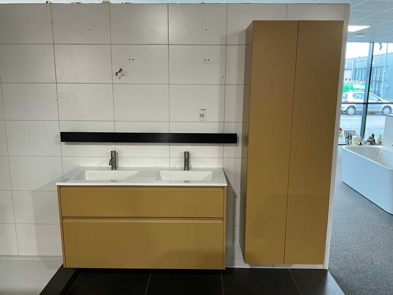 Afmeting hoge kast: H176xB60xD35cm, push to open, softclose; Inclusief 2x Vola wastafelmengkraan geborsteld RVS Merk: Dansani Lengte: 120cm Breedte: 44cm Hoogte: 64cm