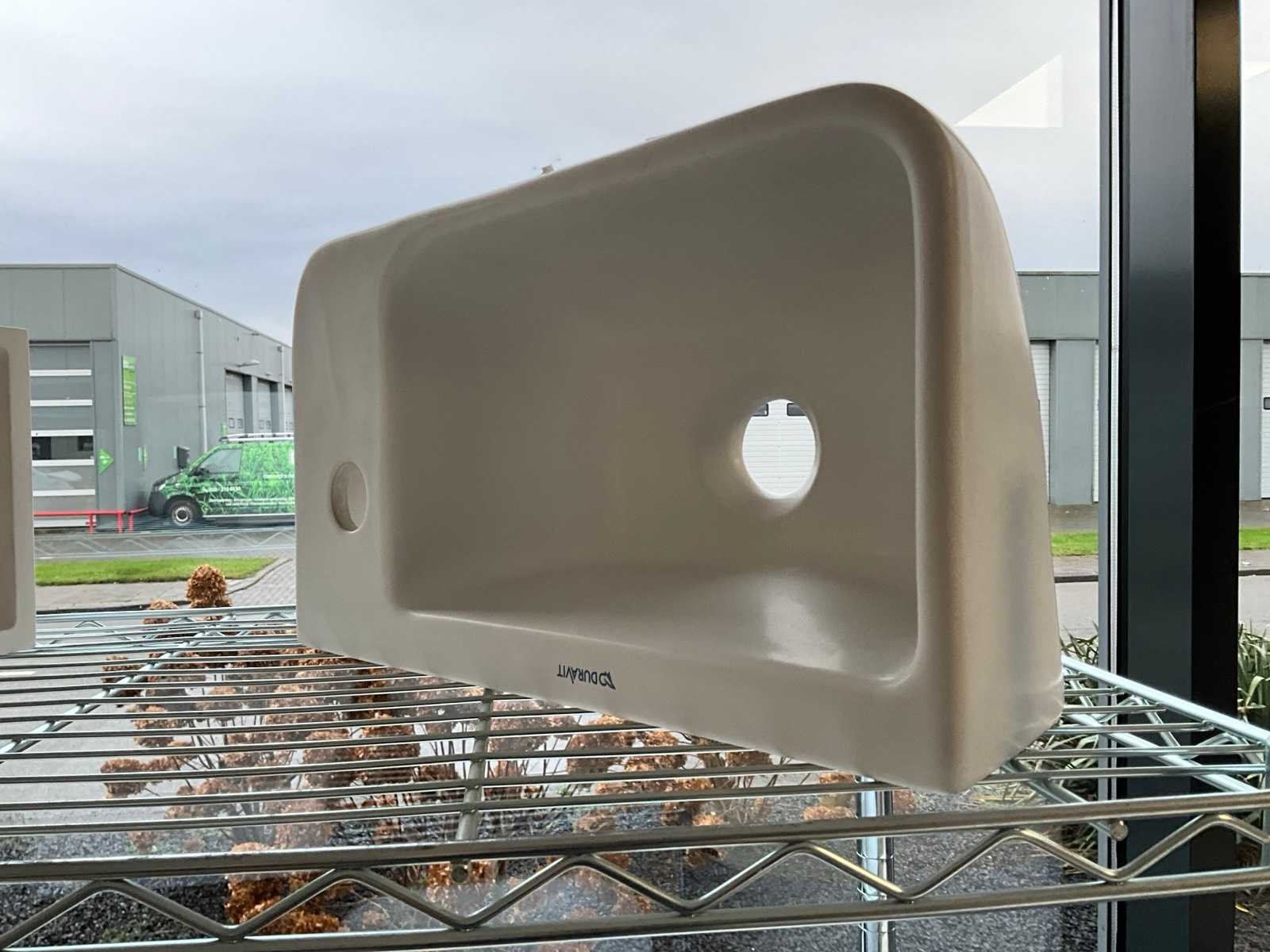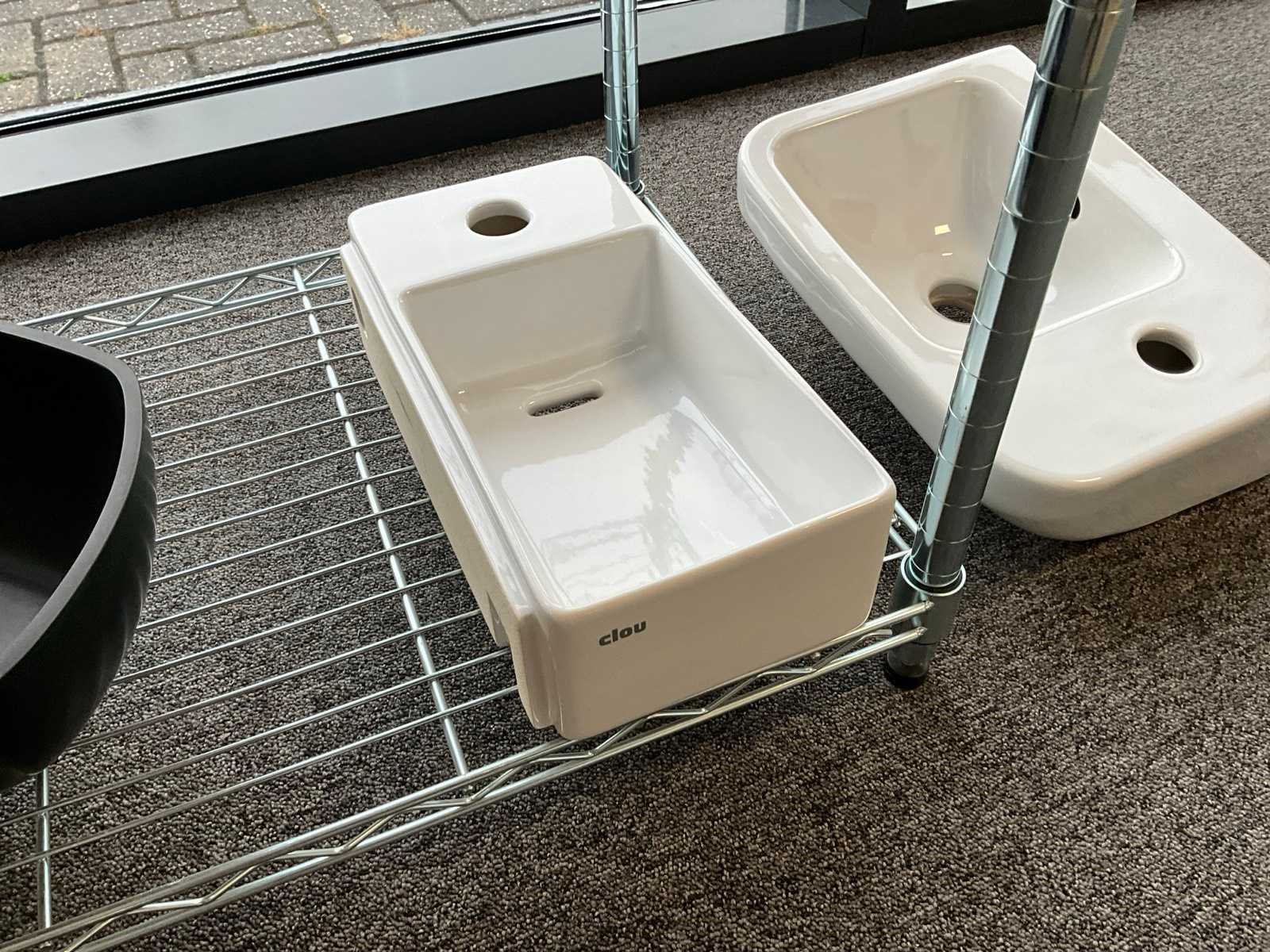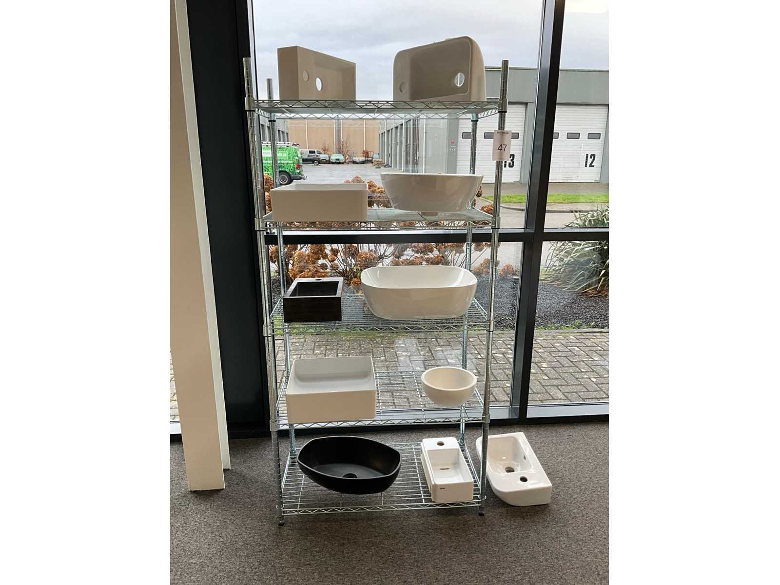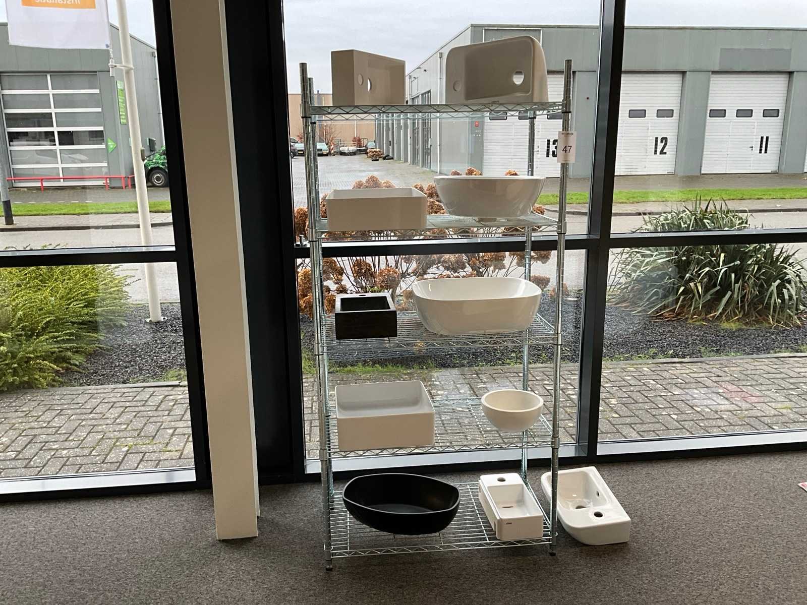 Bestaande uit onder andere Duravit en Laufen fonteinen; diverse afmetingen, waaronder: 35x60cm, 40cm diameter, 36x36cm, etc; In stelling: H185xB90xD45cm
