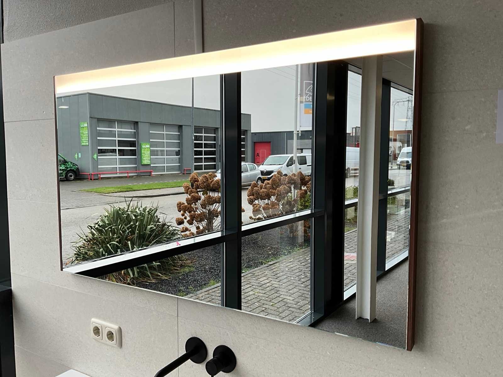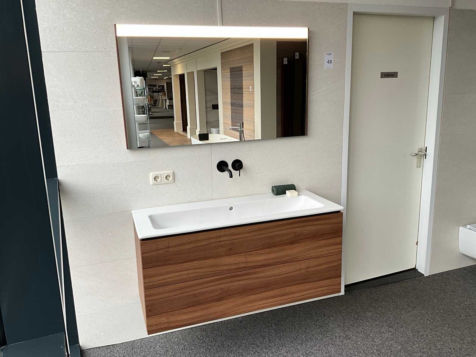 Merk: Duravit Model: L-Cube Hoogte: 55cm Lengte: 122cm Breedte: 49cm Kleur: Noten naturel Kraan: Cristina wandkraan Wastafel: Duravit wit 123x49cm keramiek Spiegel met verlichting: Duravit Brioso LED spiegel 120x70 Onderkast: Push to open Lades: 2 Softclose: true