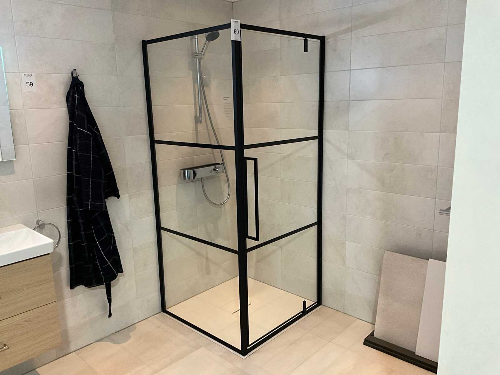 Bestaande uit: Van Rijn ST04 hoekcabine 90x90cm, hoogte 200cm helderglas, mat zwart en Hansgrohe Select 400 opbouw thermostaat en glijstangset Merk: Villeroy & Boch Model: Squaro infinity Kleur: Mat wit Lengte: 90cm Breedte: 90cm