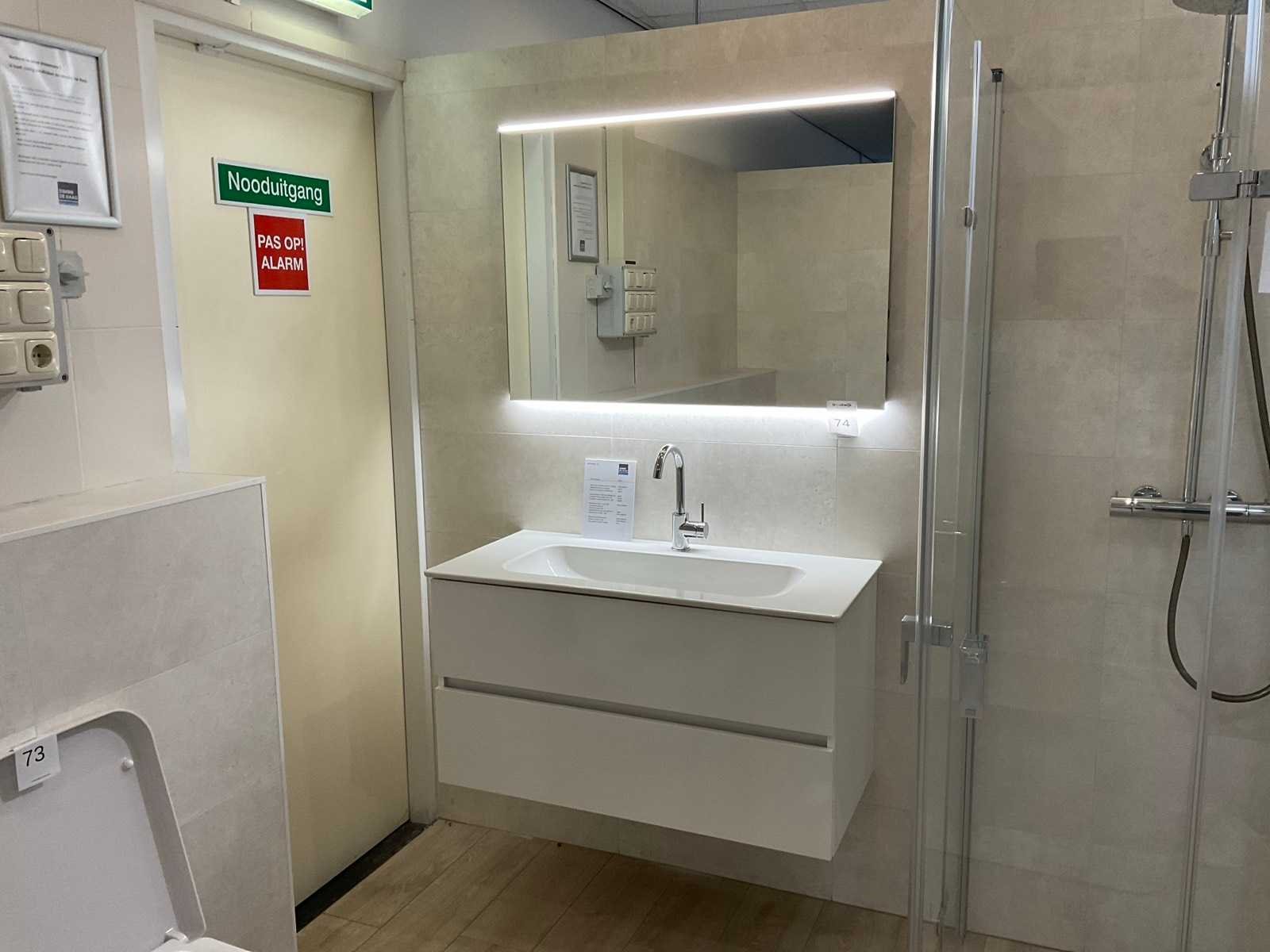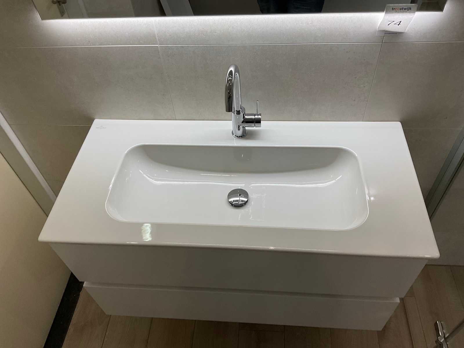 Formaat Spiegel: 100x70cm. Inclusief: (1x) Lagoo wastafelmengkraan, Cold start, chroom. Merk: Villeroy & Boch Model: Verity Hoogte: 54cm Lengte: 100cm Breedte: 47cm Materiaal: Keramiek Kleur: Wit Kraan: 1 Wastafel: 1 Spiegel met verlichting: 1 Lades: 2 Softclose: true