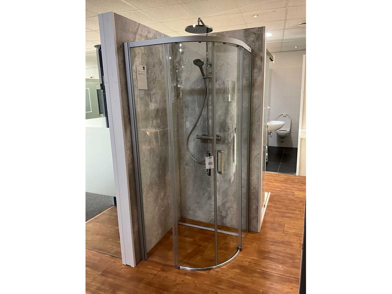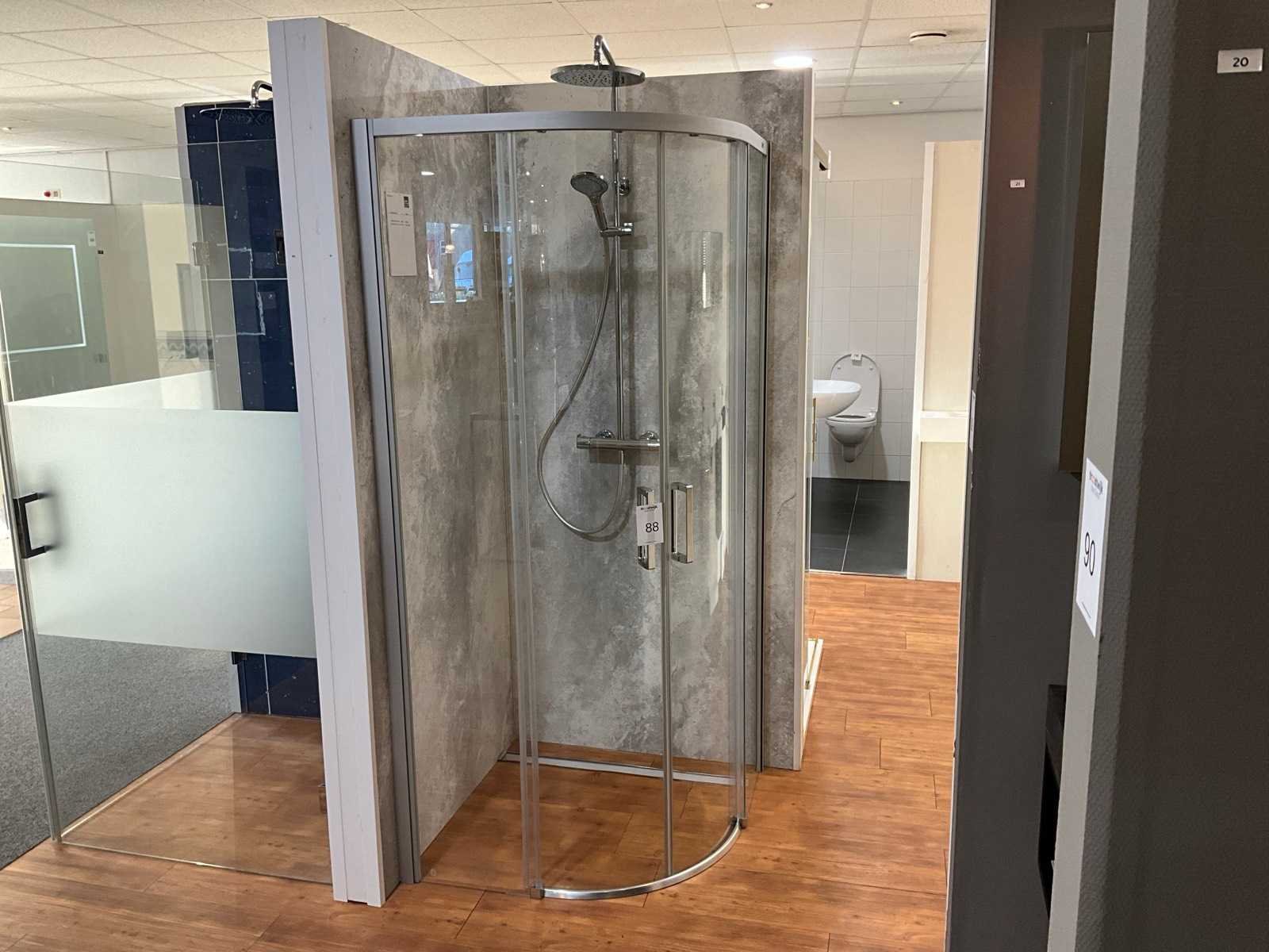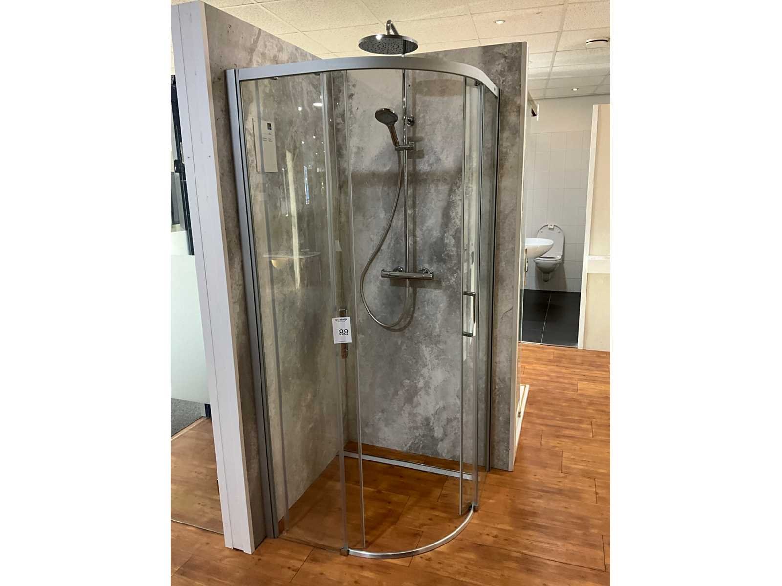 Voorzien van schuifdeur, helder glas, profiel zilvermat, breedte instap 485mm en Cristina opbouwdeel rainshower 310mm Merk: Hüppe Model: Classics easyentry Lengte: 88cm Breedte: 88cm Hoogte: 197cm