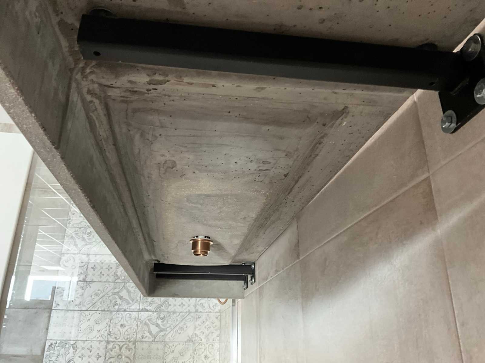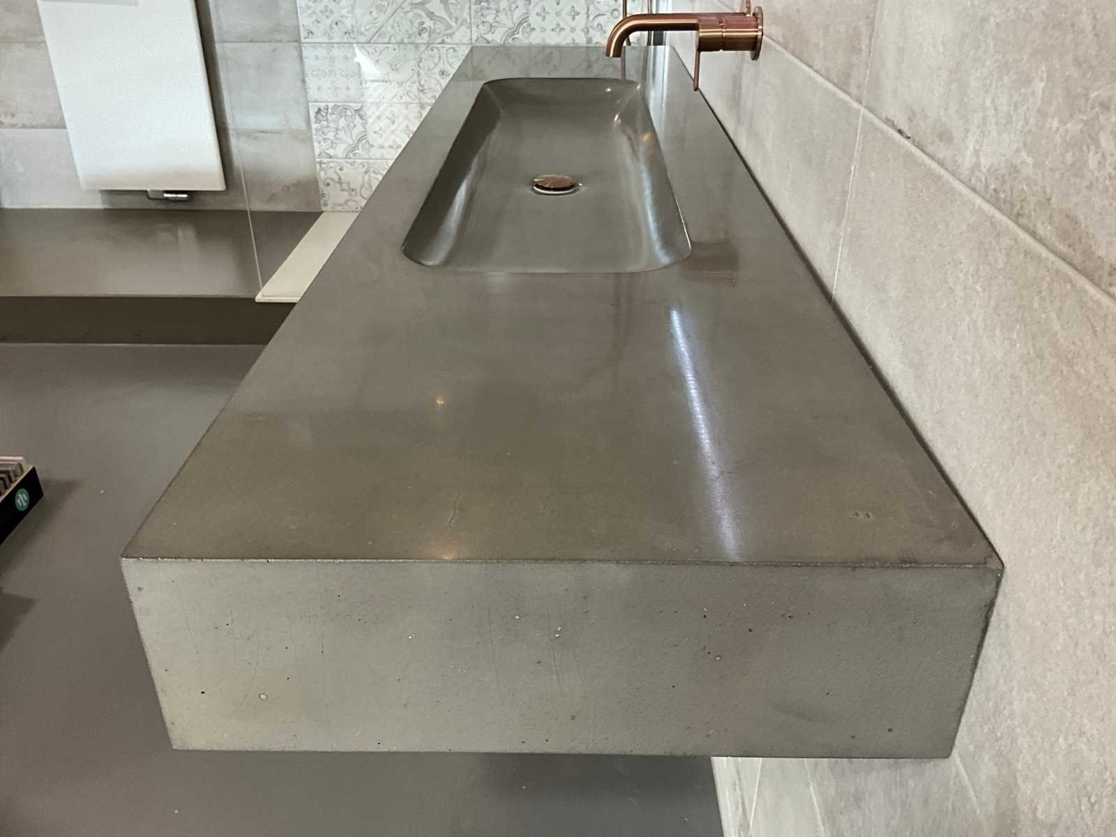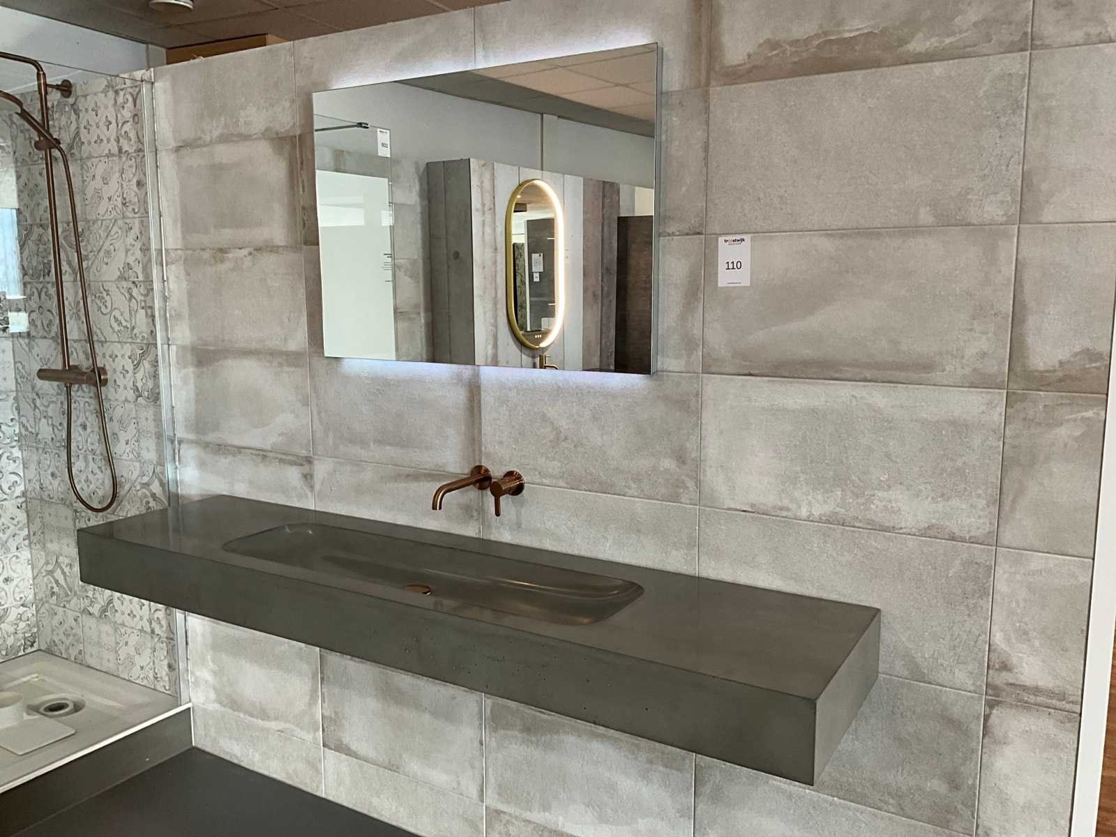 Voorzien van Damixa Silhouet mat koper opbouwdeel wastafelkraan en Looox RGB LED spiegel 100x70cm Merk: Meglio Model: Vario Lengte: 200cm Breedte: 48cm Hoogte: 15cm Materiaal: Beton