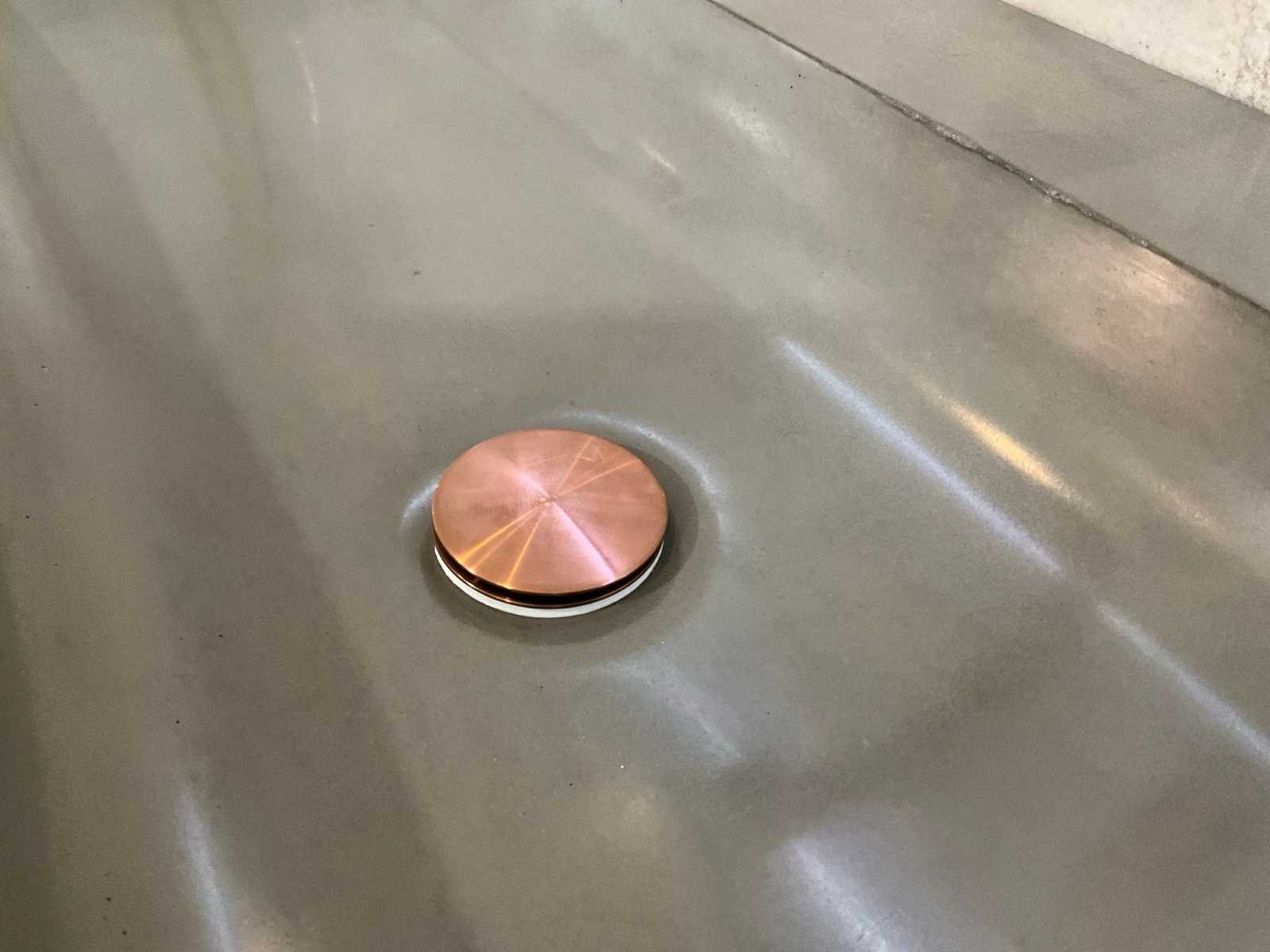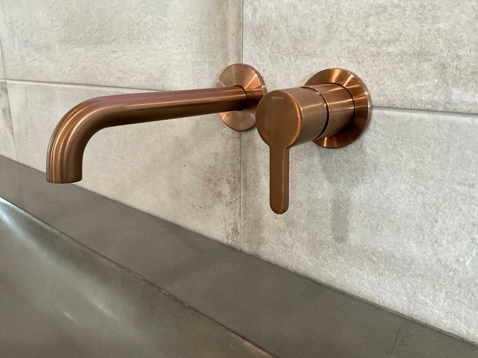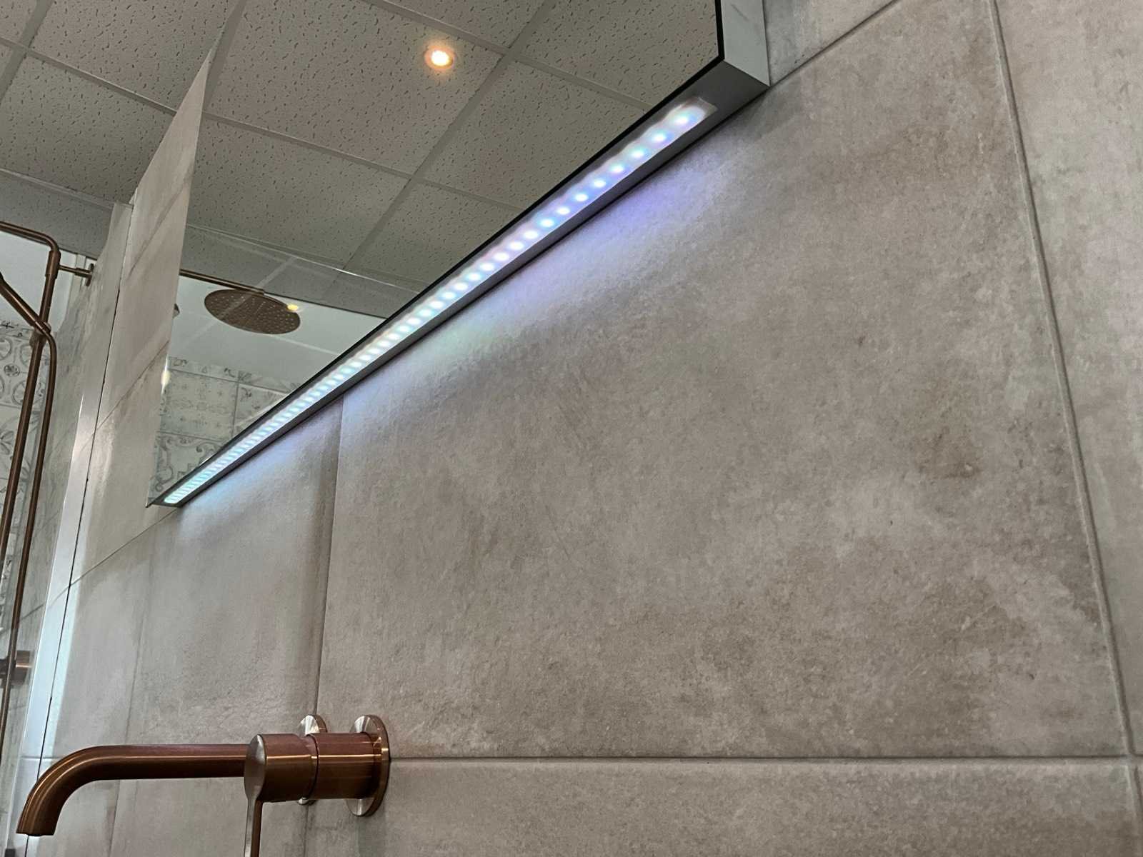 Voorzien van Damixa Silhouet mat koper opbouwdeel wastafelkraan en Looox RGB LED spiegel 100x70cm Merk: Meglio Model: Vario Lengte: 200cm Breedte: 48cm Hoogte: 15cm Materiaal: Beton