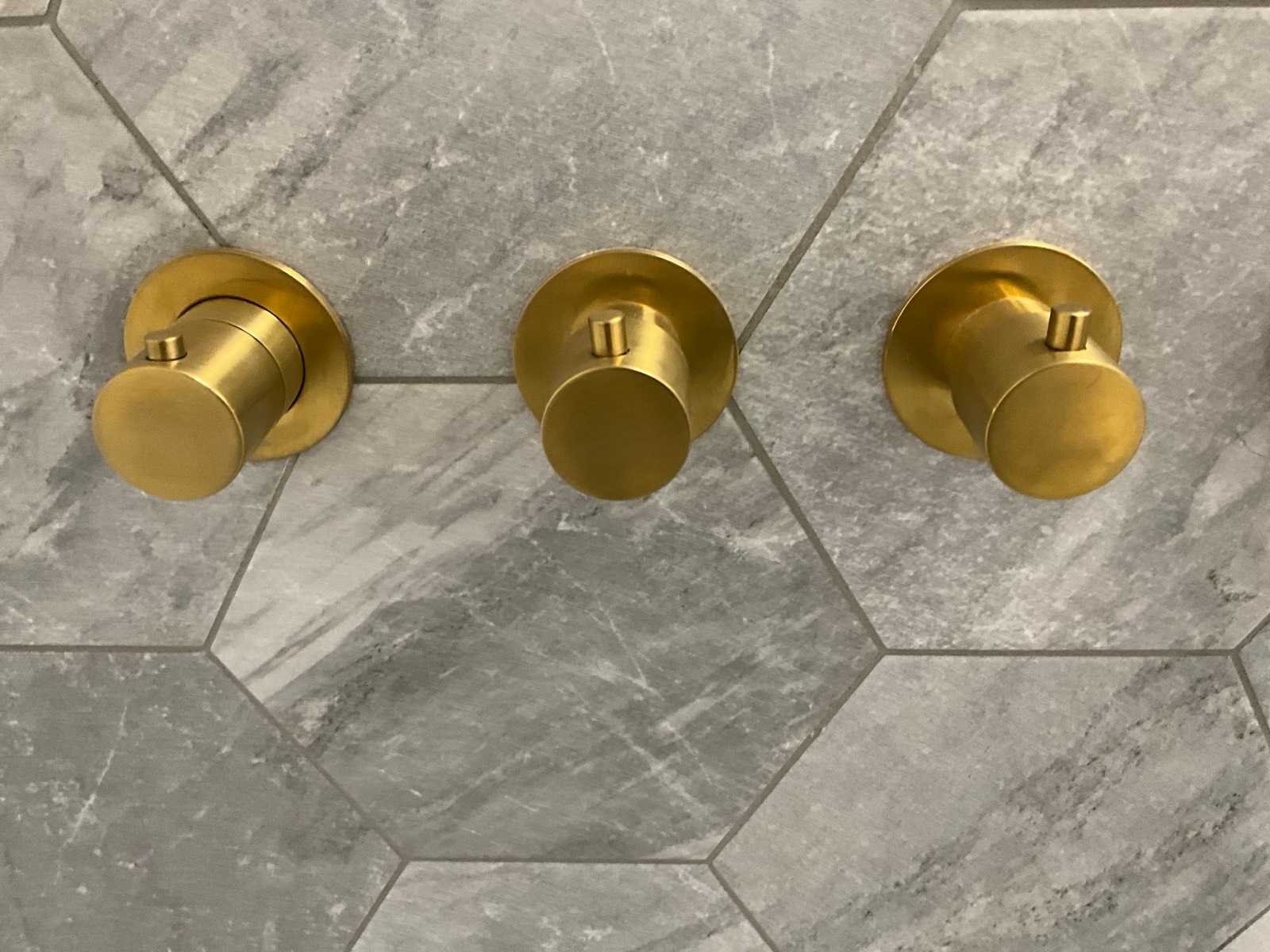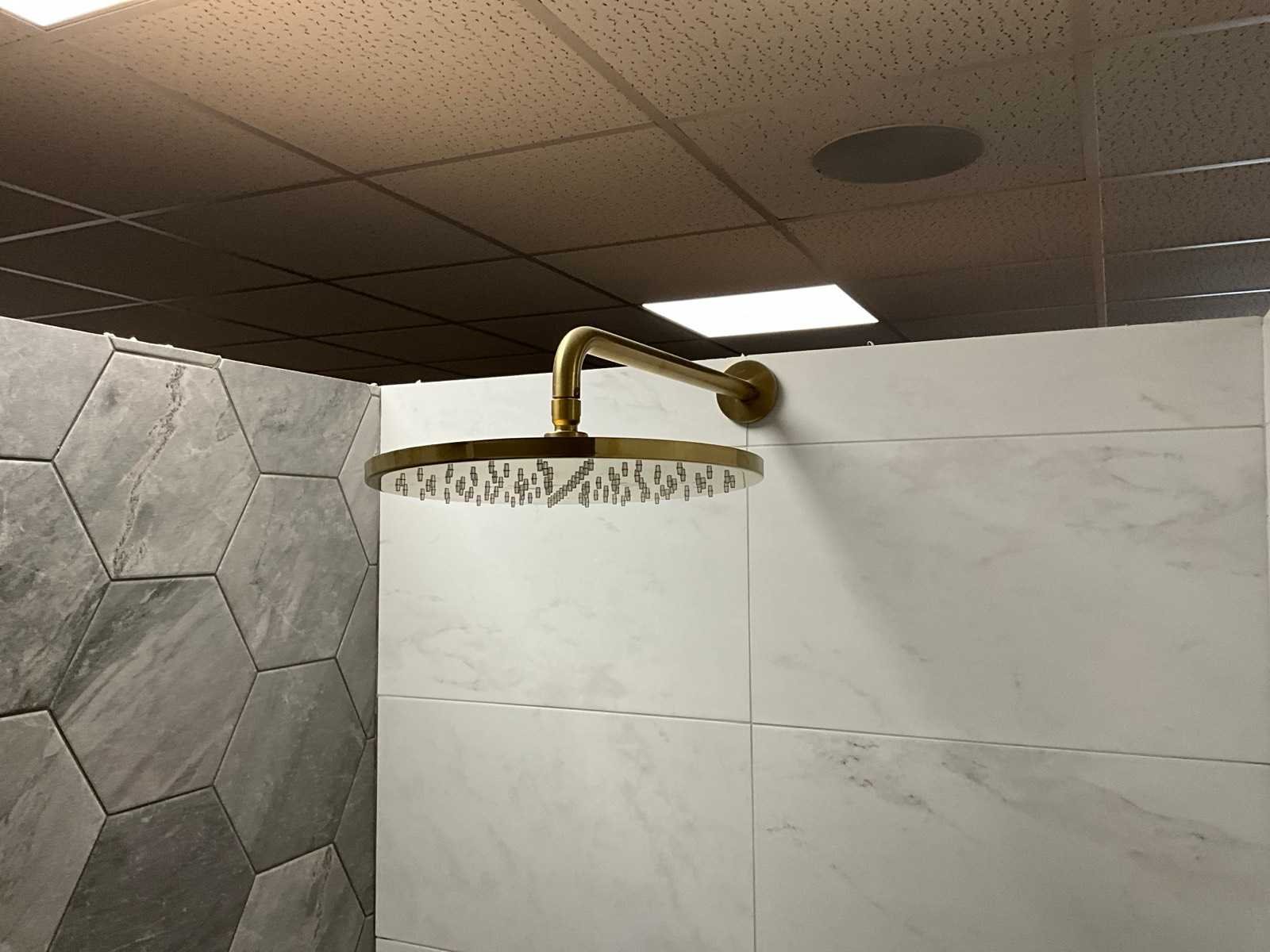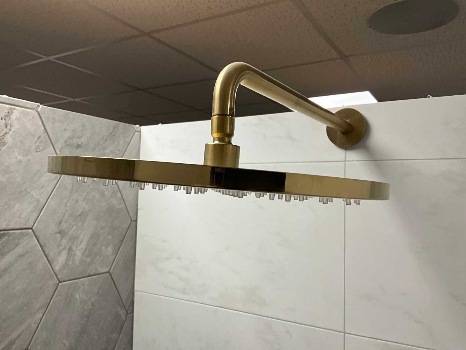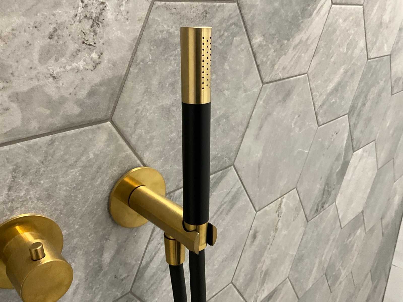 Bestaande uit hoofddouche, handdouche, bediening, Luca douchewisser en 2x Hotbath Cobber handdoekhaak Merk: Hotbath Model: Cobber Kleur: Brushed messing