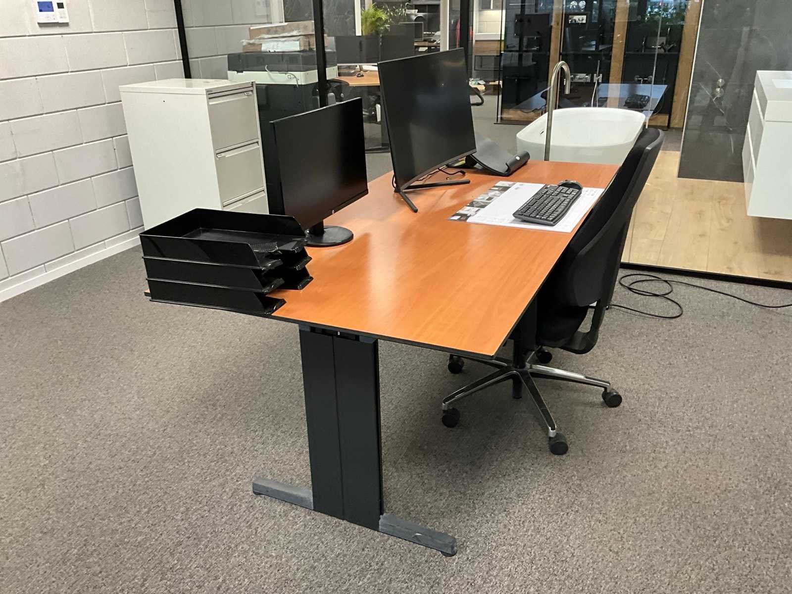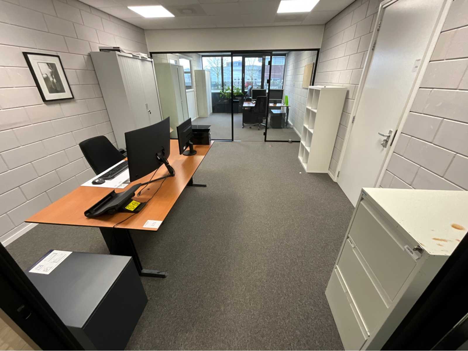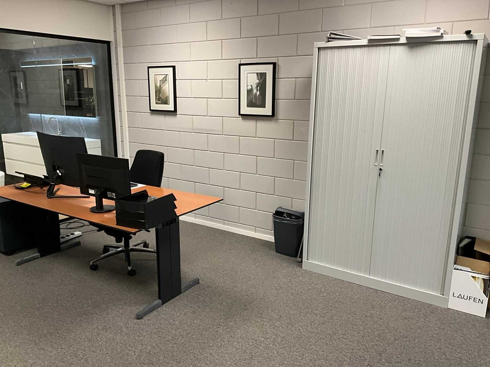 Betreft inhoud ruimte; bestaande uit: 1x bureautafel in hoogte verstelbaar, 1x Almachair bureaustoel, 1x HP V24i FHD monitor, 1x Samsung U32R590 monitor, 1x Roldeurkast H198xB120xD43cm, 1x ladeblok, 1x vakkenkast, 1x Overtoom dossierkast en wanddecoratie Lengte: 195cm Breedte: 95cm