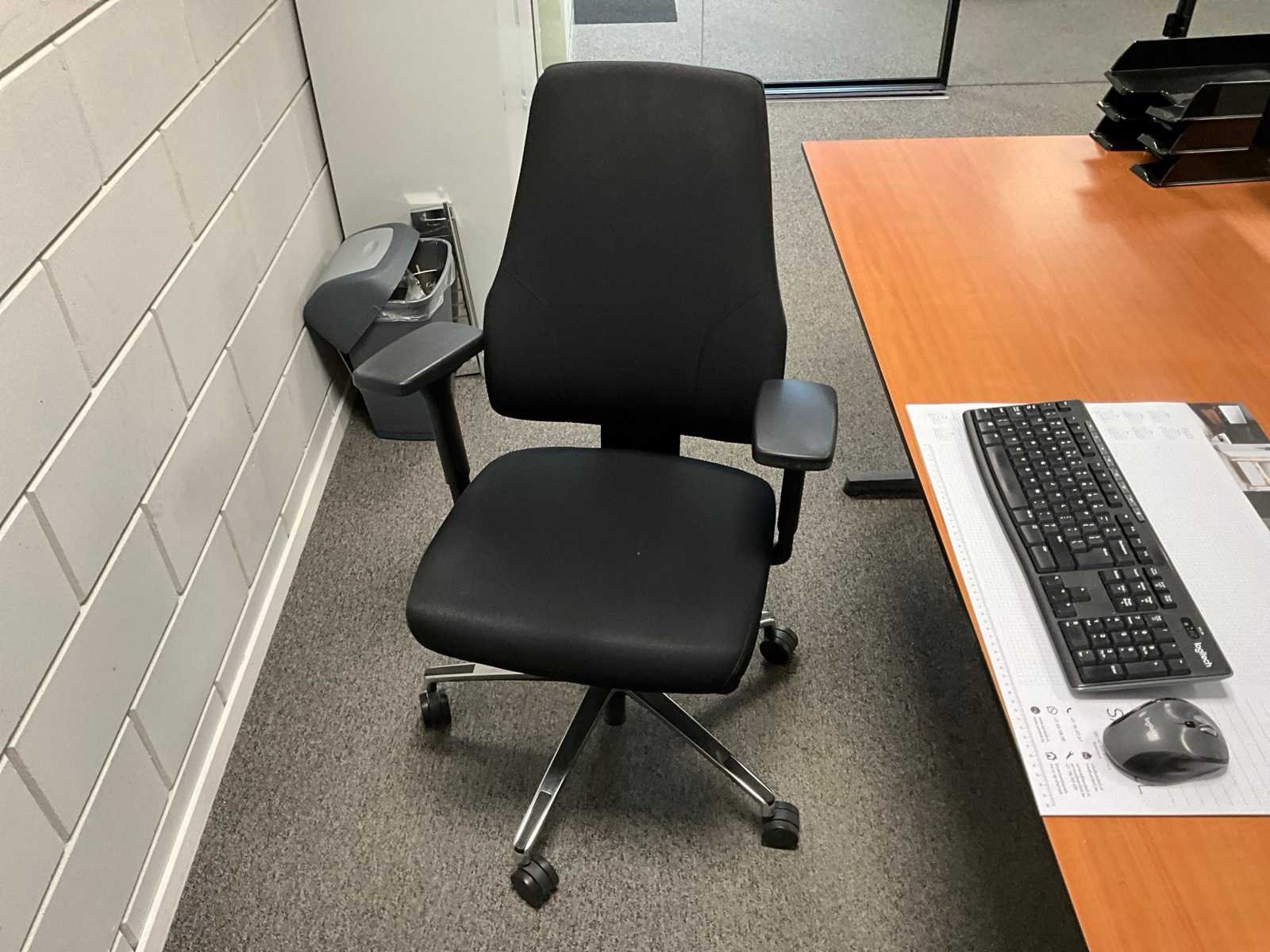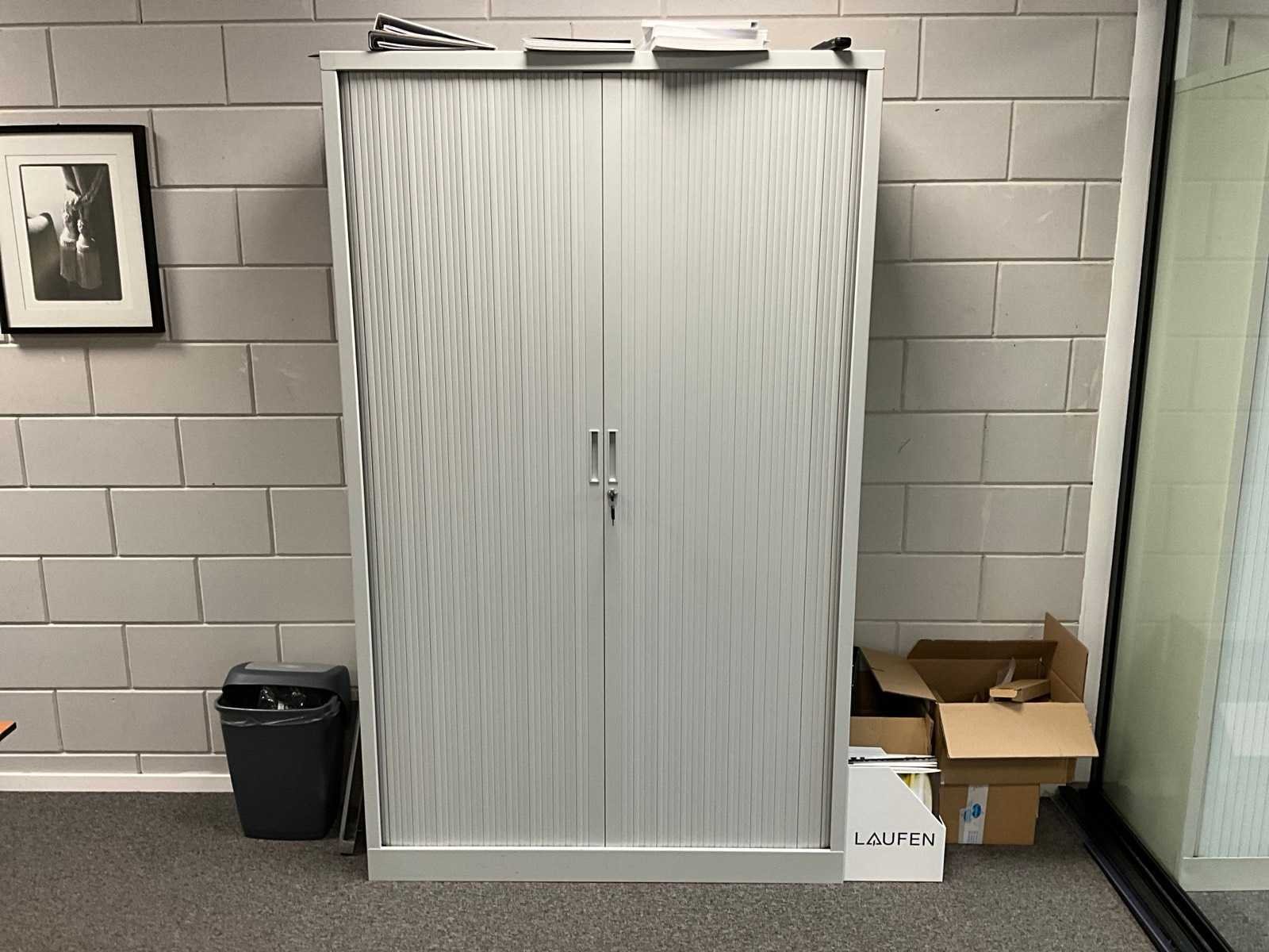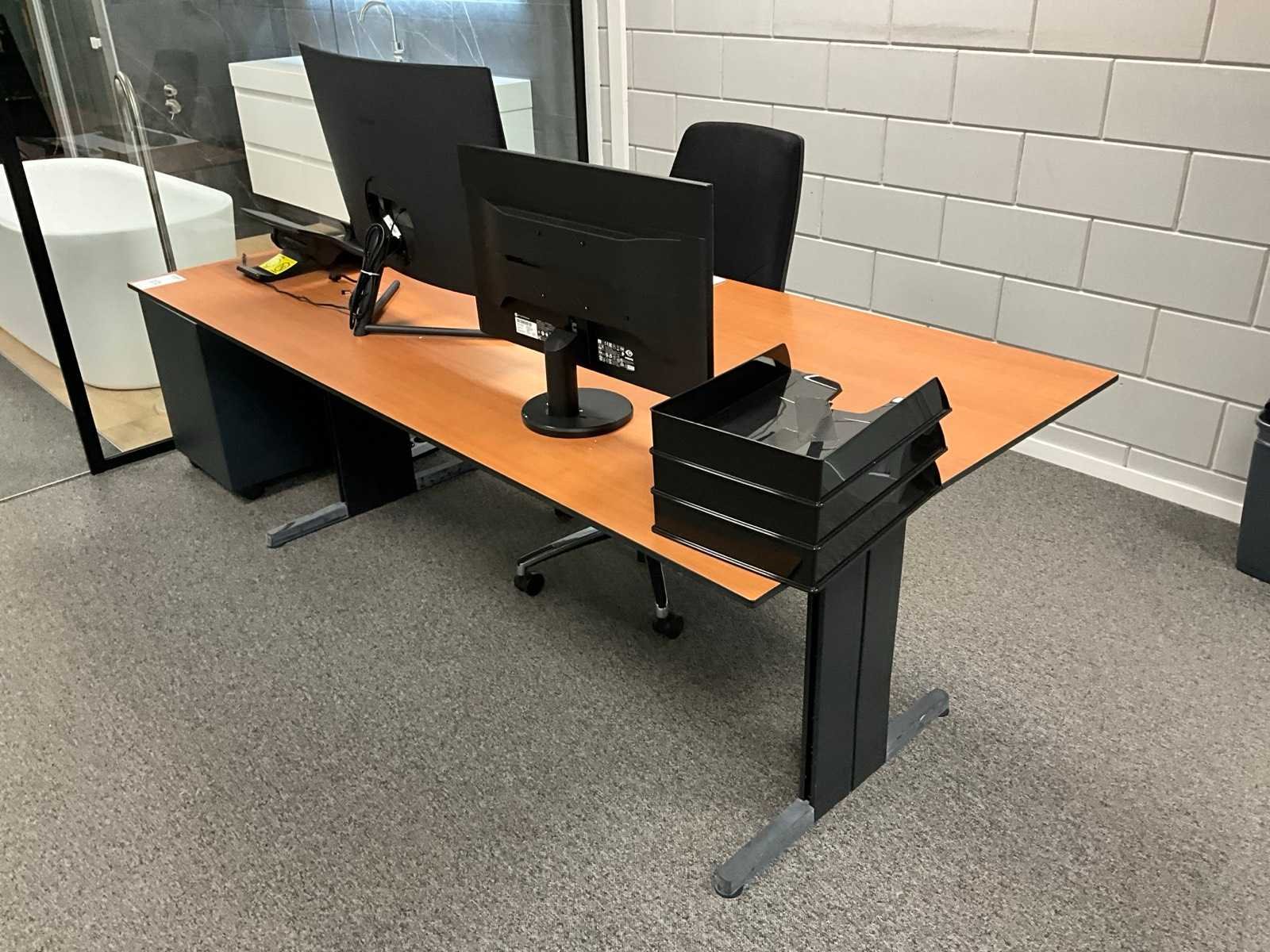 Betreft inhoud ruimte; bestaande uit: 1x bureautafel in hoogte verstelbaar, 1x Almachair bureaustoel, 1x HP V24i FHD monitor, 1x Samsung U32R590 monitor, 1x Roldeurkast H198xB120xD43cm, 1x ladeblok, 1x vakkenkast, 1x Overtoom dossierkast en wanddecoratie Lengte: 195cm Breedte: 95cm