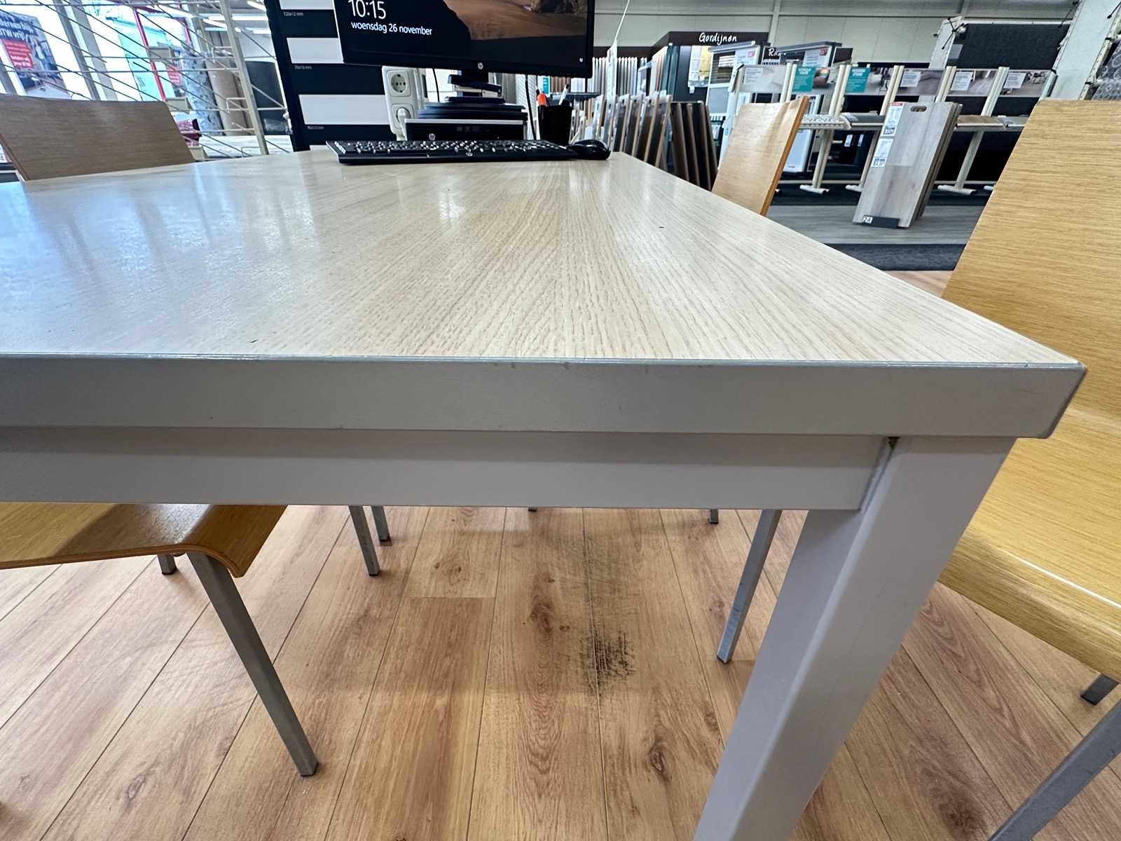 Deze set bestaat uit een tafel met 4 stoelen van Pedrali. Zithoogte 44 cm. Exclusief PC met monitor. Lengte: 140cm Breedte: 80cm Hoogte: 76cm Materiaal: Houten blad op stelen frame