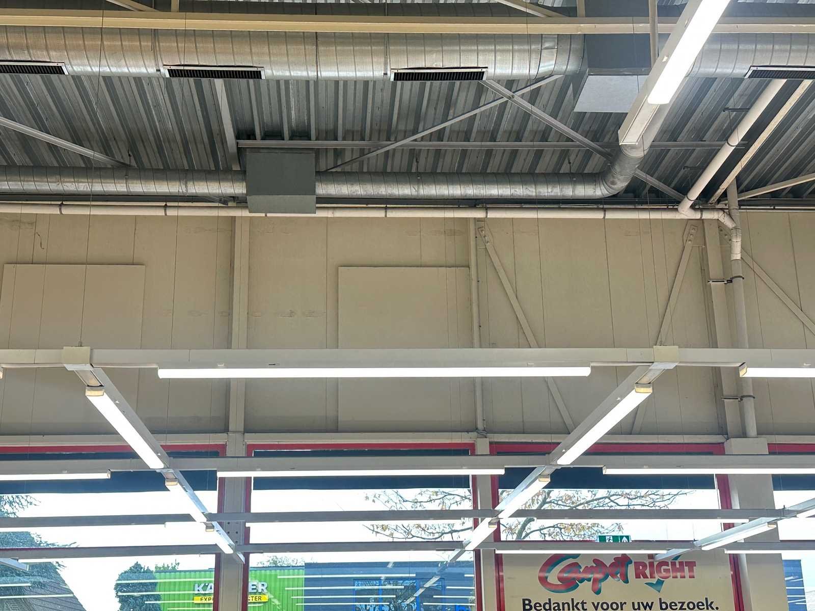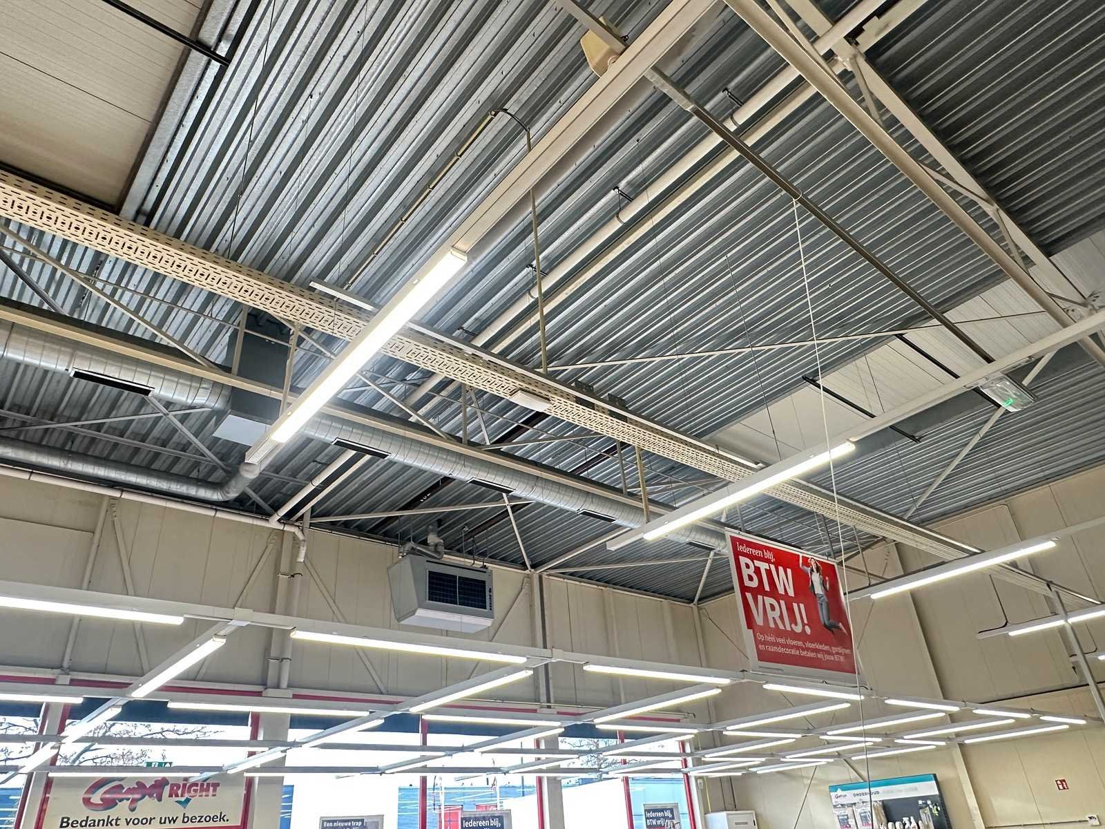 Dit kavel hangt in een frame van 6x17 meter (lage gedeelte) en 8x 17 meter (hoge gedeelte) met 11 richtspots en LED armaturen LummusLED. Merk: Zumtobel