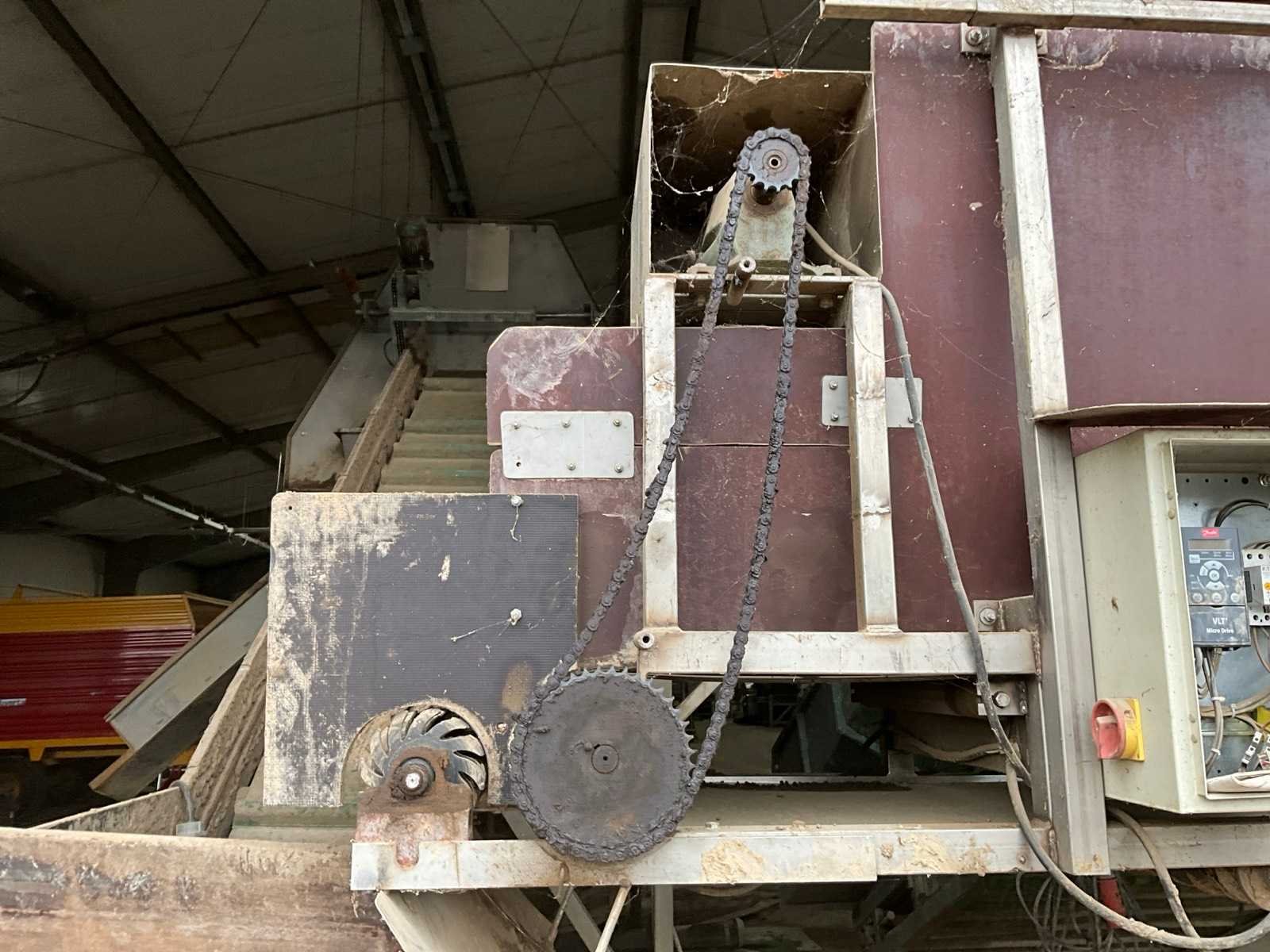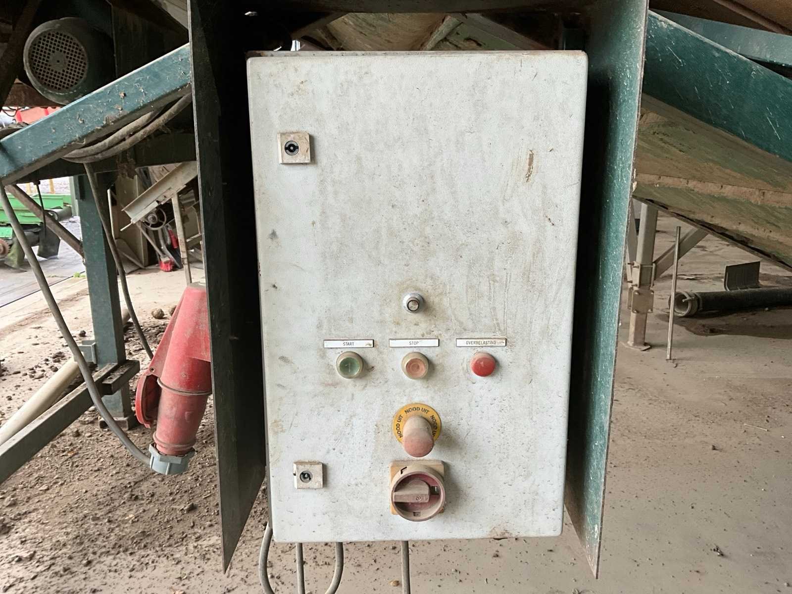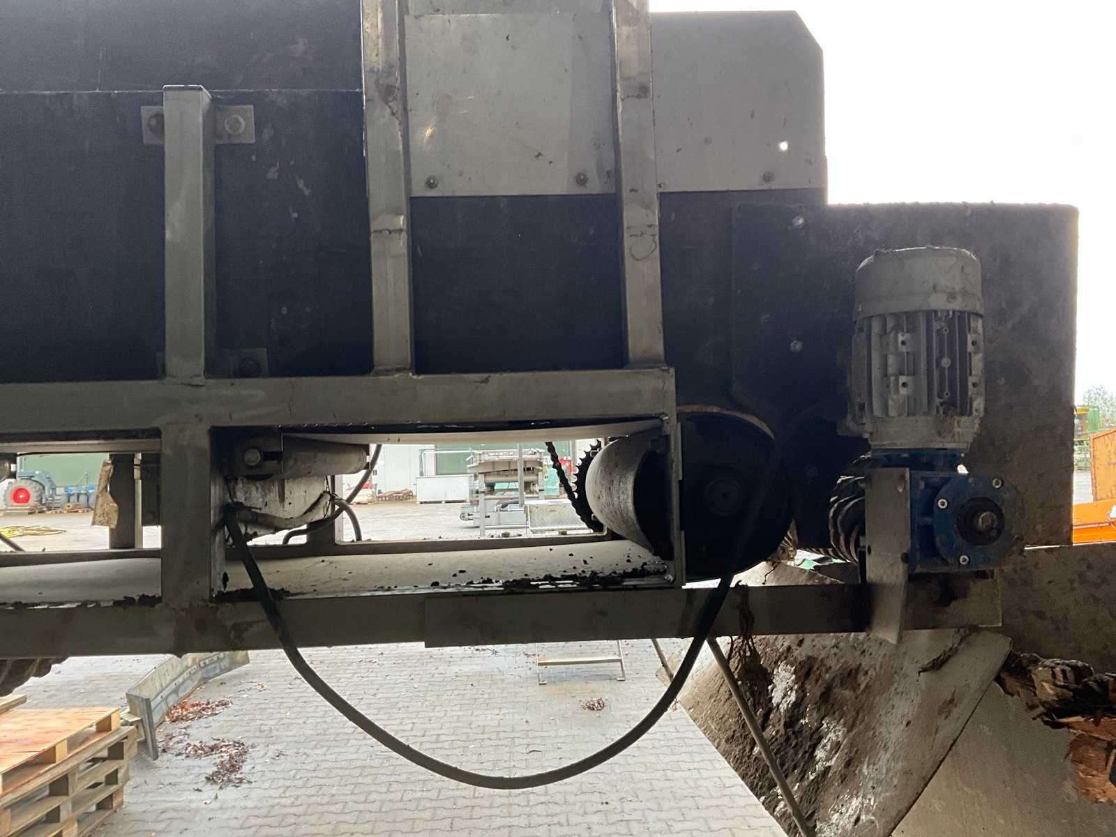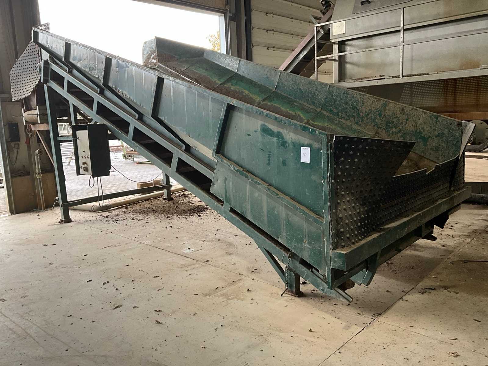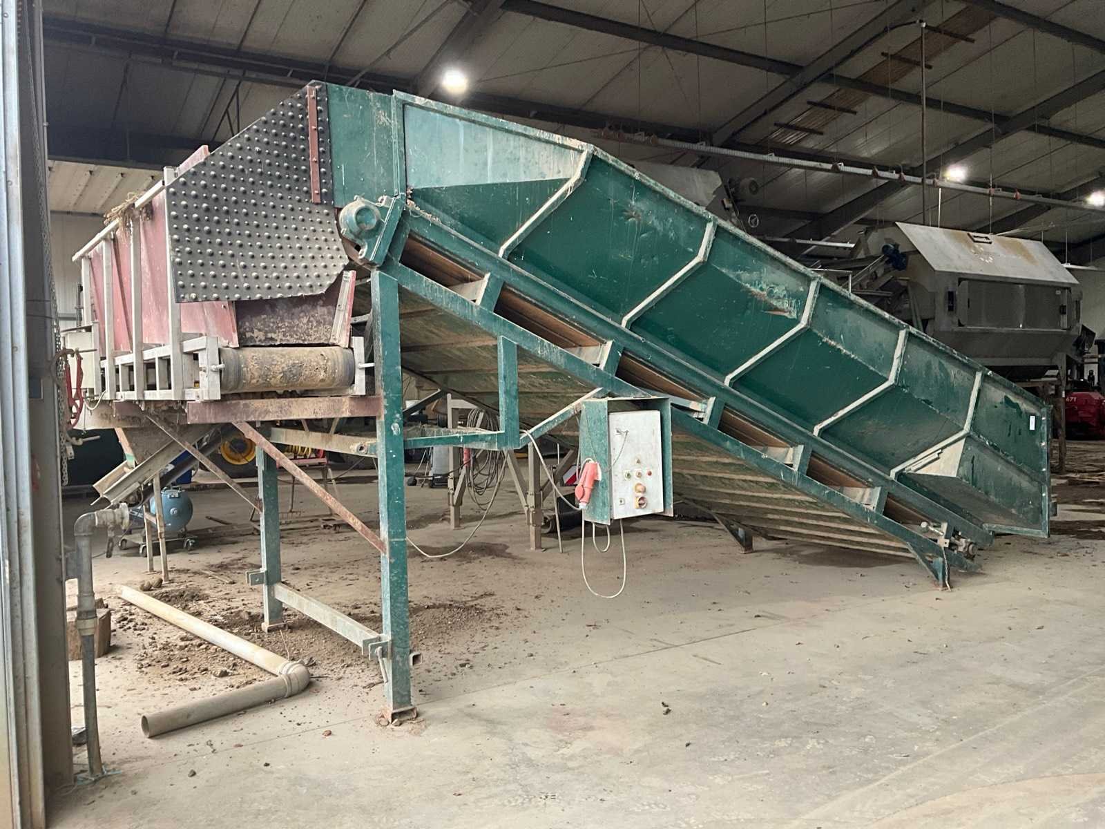 Stortbreedte 3000mm, opvoerhoogte 2650mm, transportband haaks op opvoerband op 1900mm hoog, 620mm bandbreedte, Band afm. l: 6000mm Band afm. b: 1850mm Totale afmeting L: 6500mm Totale afmeting Breedte: 4750mm Totale afmeting Hoogte: 3250mm