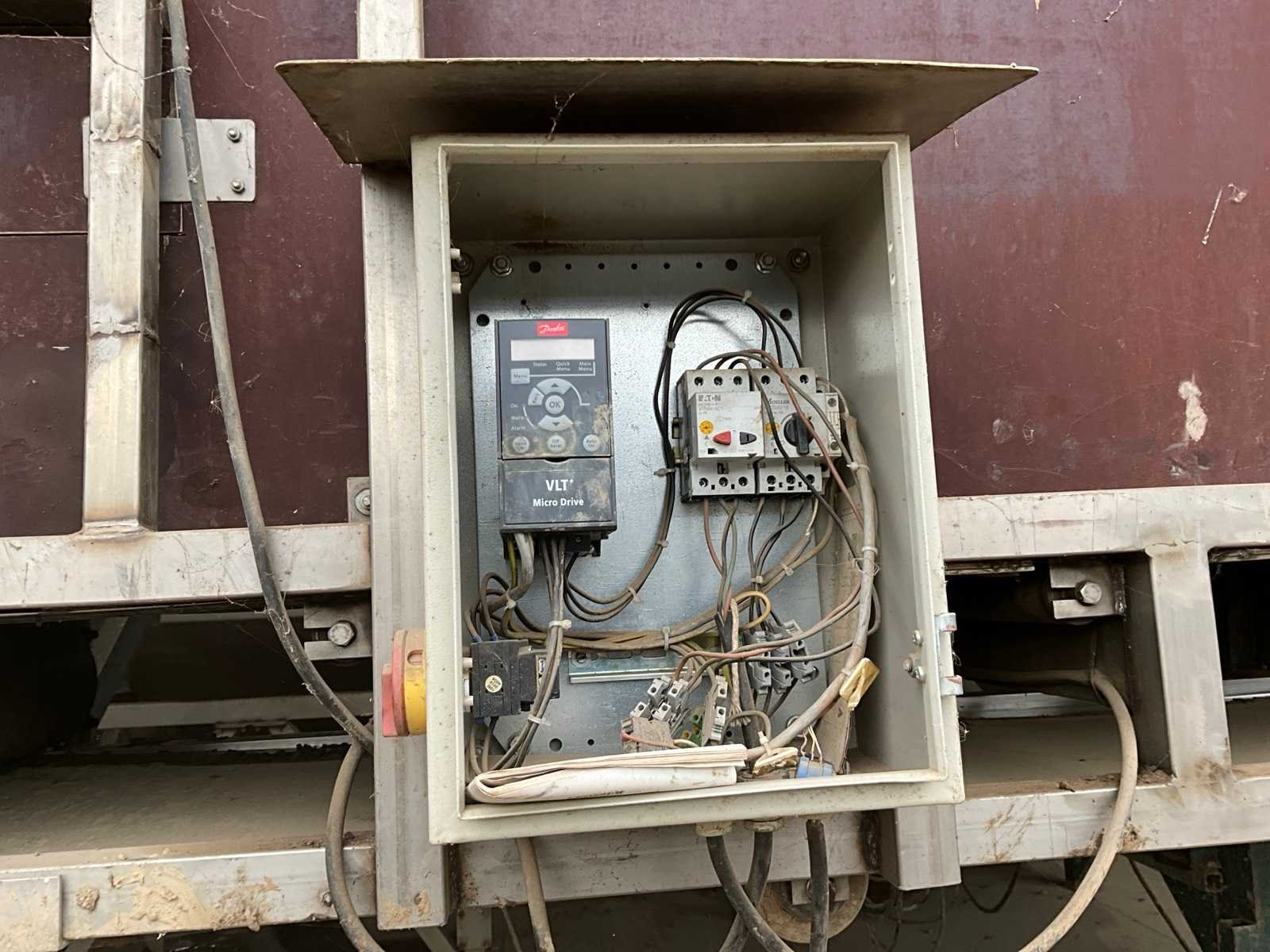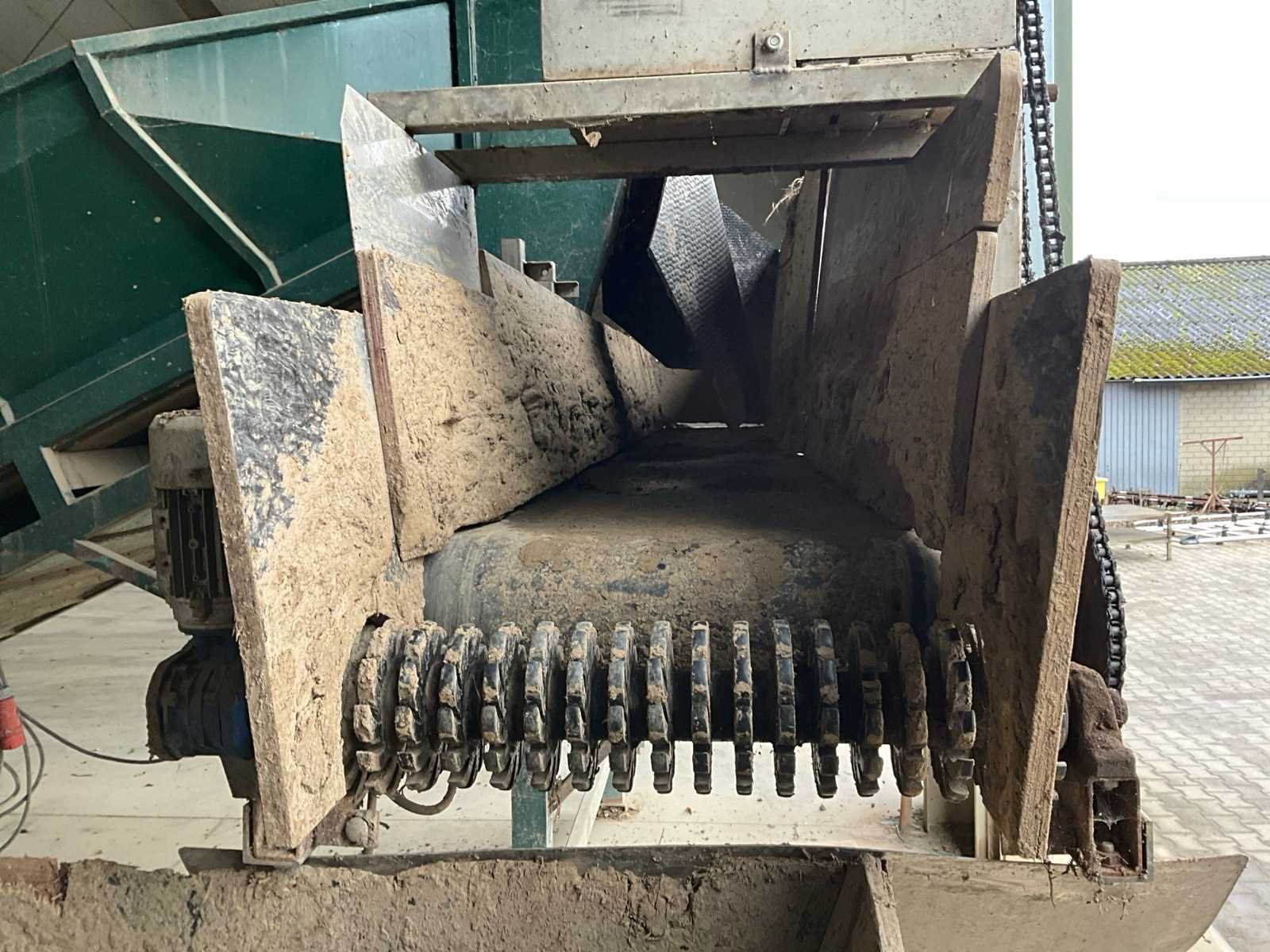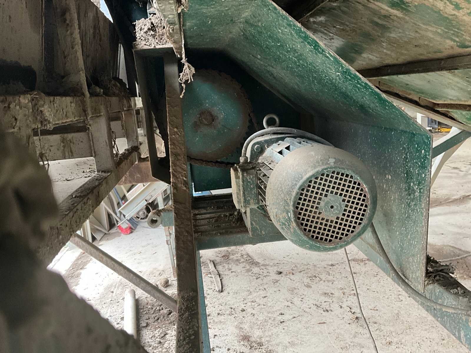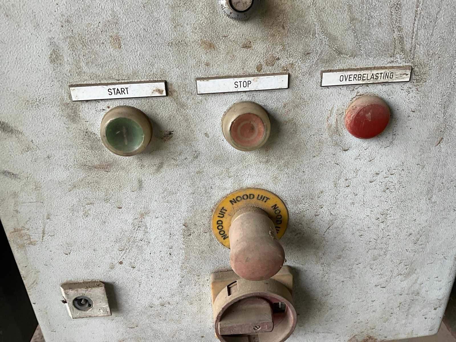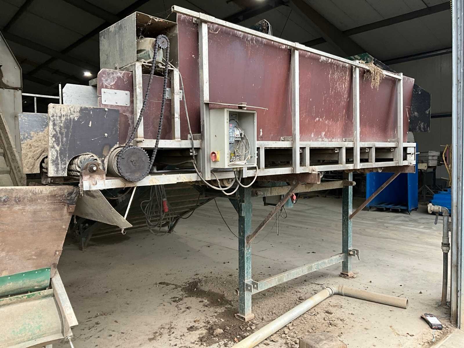 Stortbreedte 3000mm, opvoerhoogte 2650mm, transportband haaks op opvoerband op 1900mm hoog, 620mm bandbreedte, Band afm. l: 6000mm Band afm. b: 1850mm Totale afmeting L: 6500mm Totale afmeting Breedte: 4750mm Totale afmeting Hoogte: 3250mm