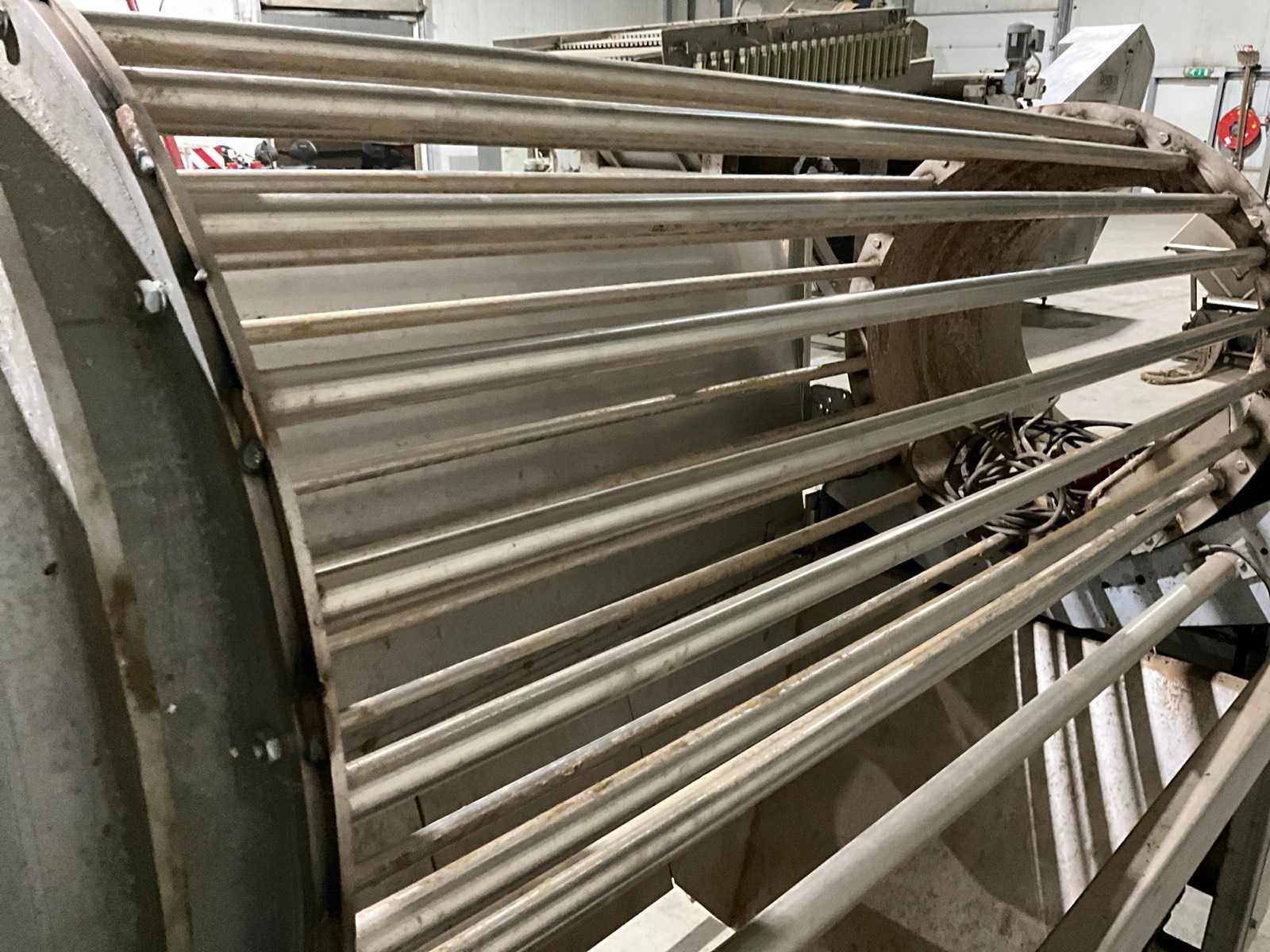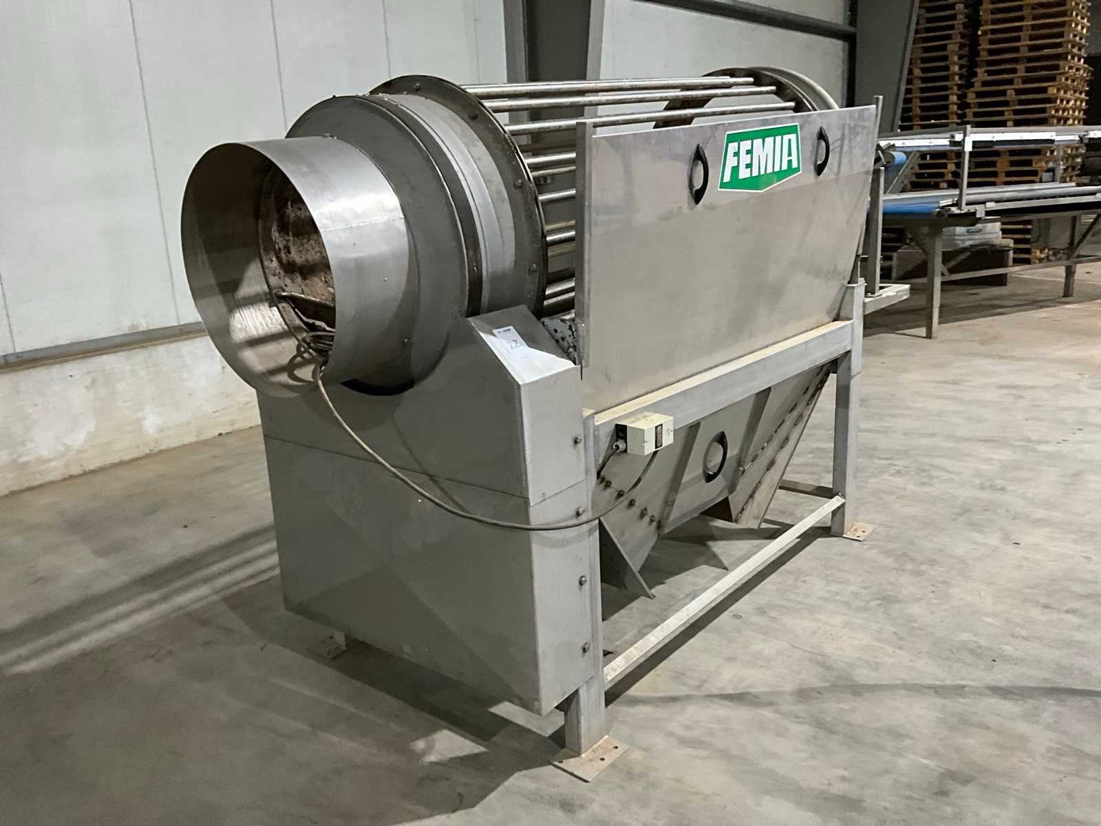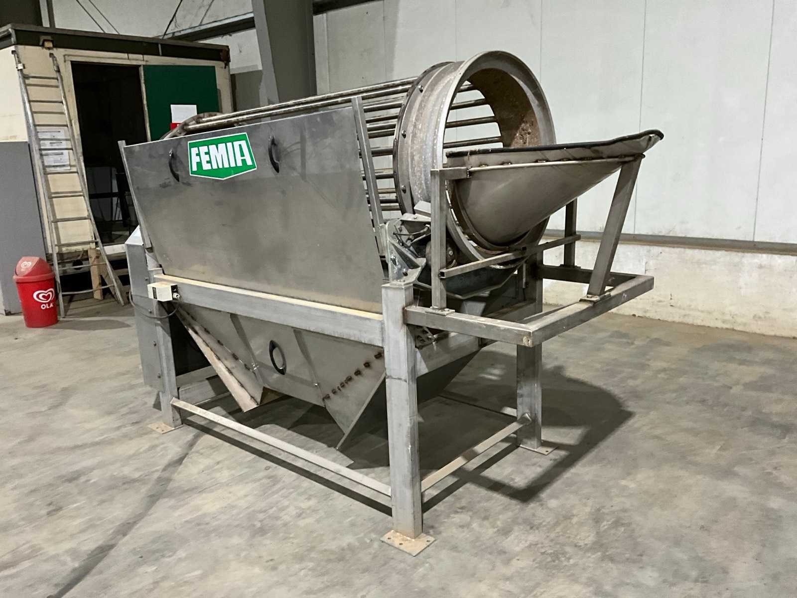 Invoer hopper 700mm breed, 75mm tussen buizen in trommel, uitvoer 600mm doorsnee Merk: Femia Type: E95 Bouwjaar: 1995 Serienummer: E61N1069 Aansluiting: 400V Totale afmeting L: 3100mm Totale afmeting Breedte: 1250mm Totale afmeting Hoogte: 2000mm