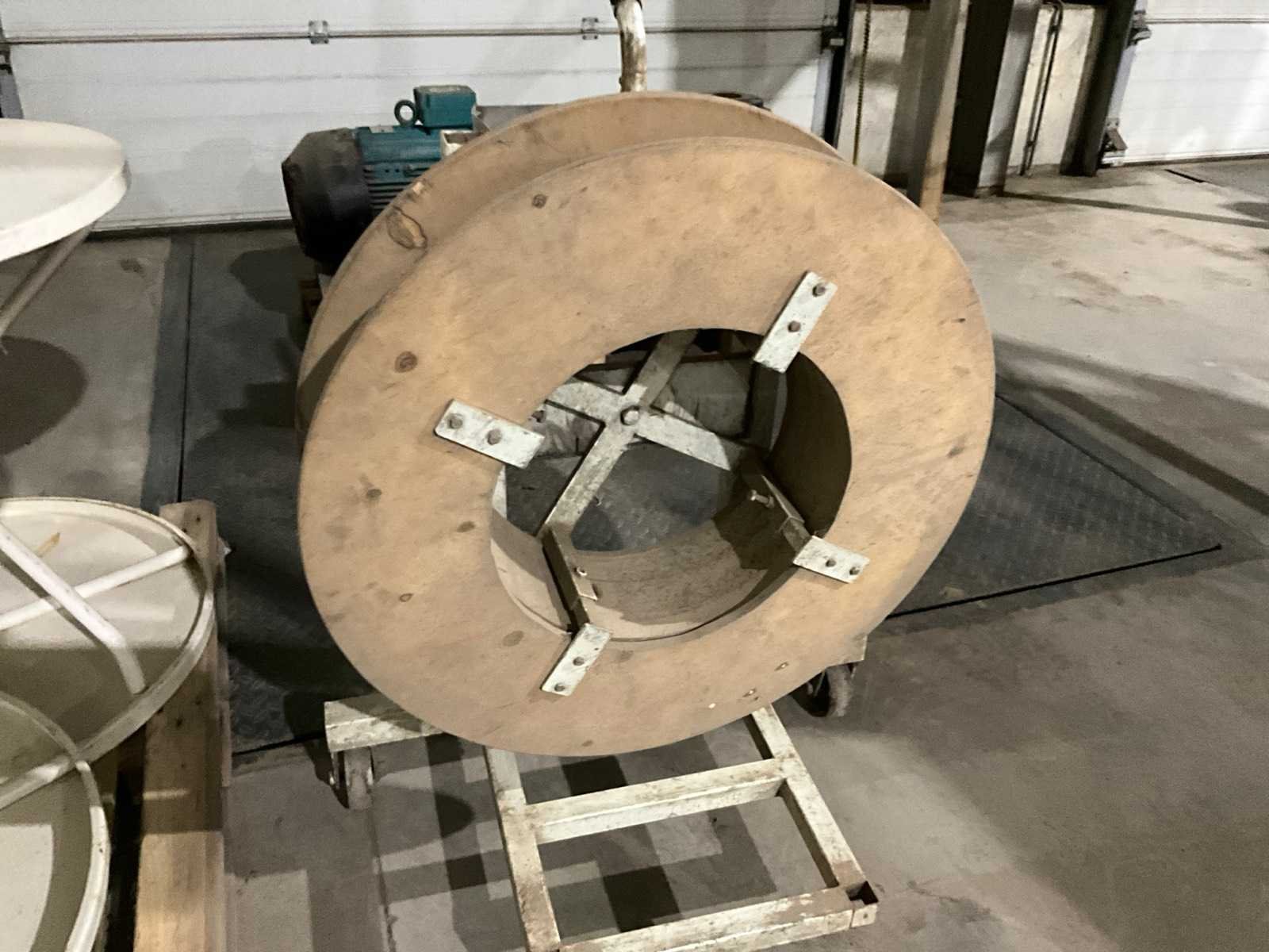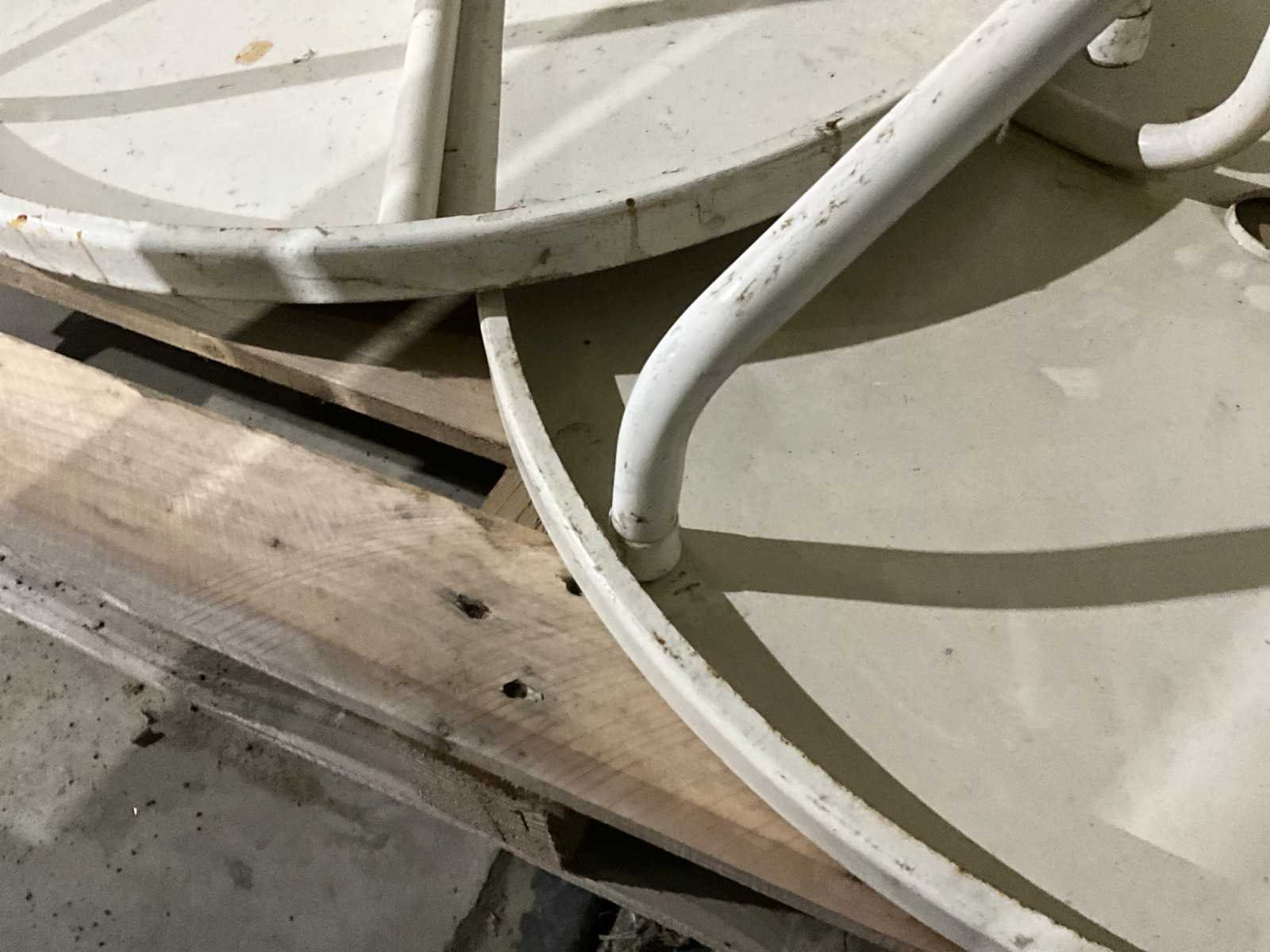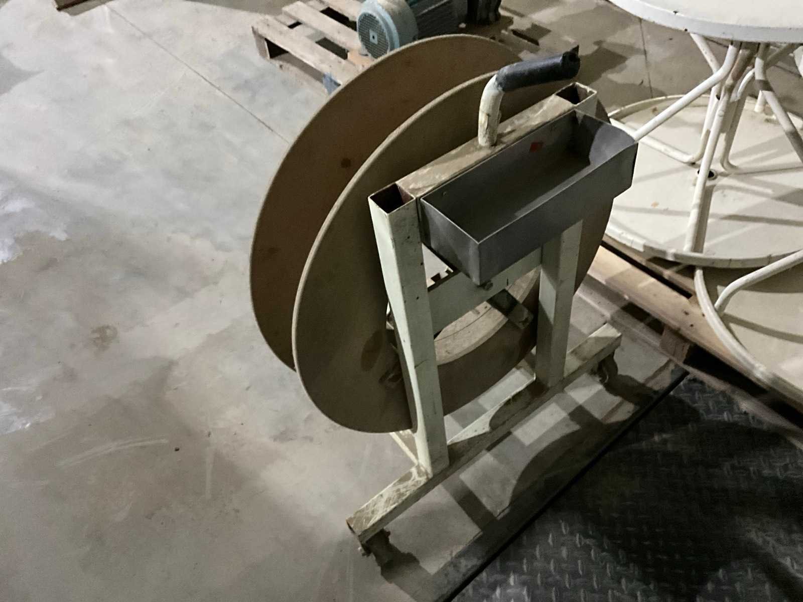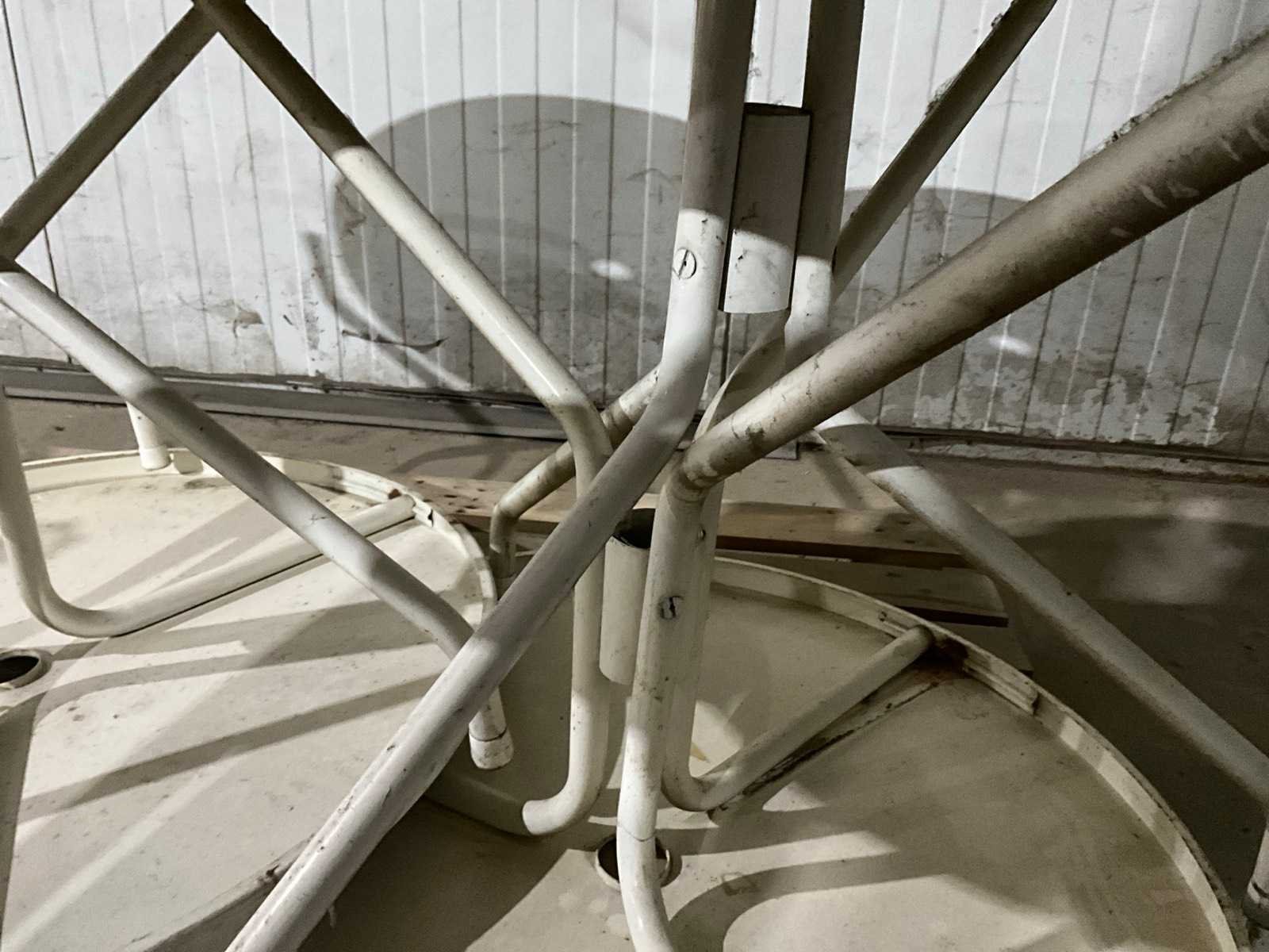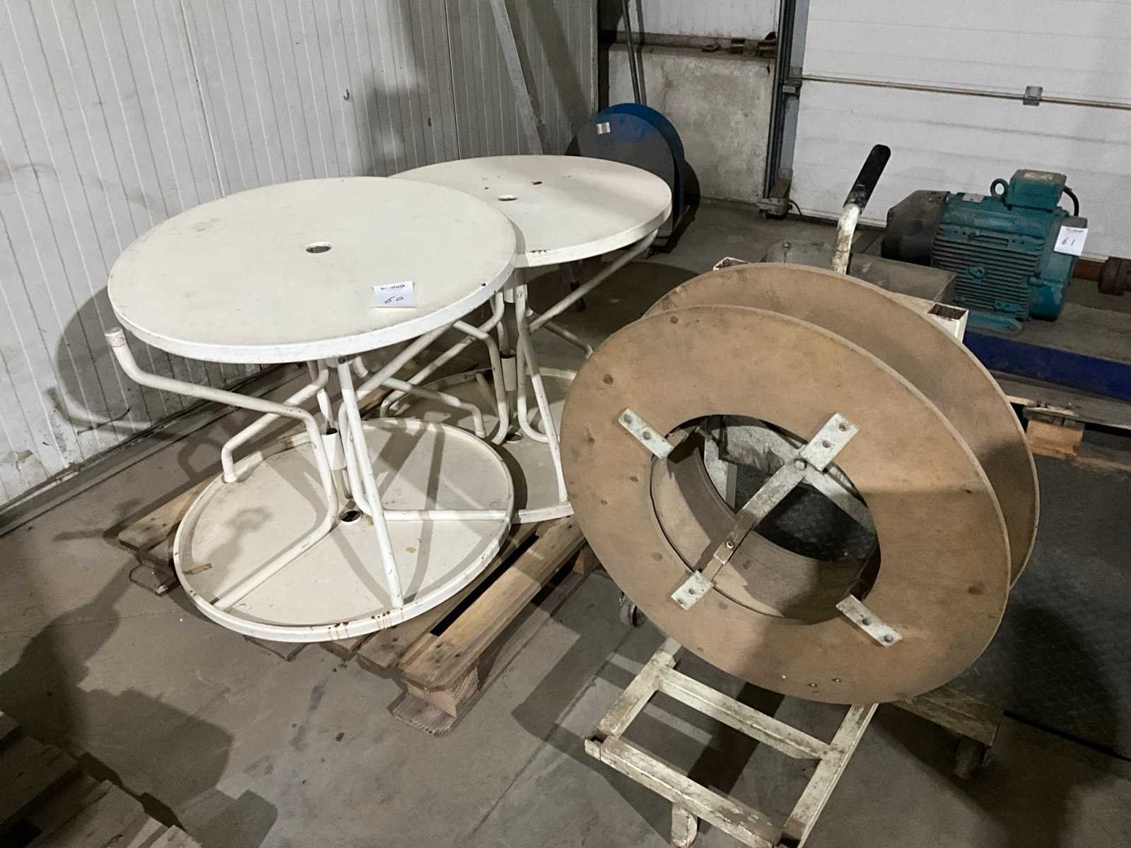 4x ronde metalen tuintafel 800mm doorsnee, 700mm hoog, in hoogte verstelbaar bureau 1200x800mm, 760mm hoog, haspel tbv bevestigingsband