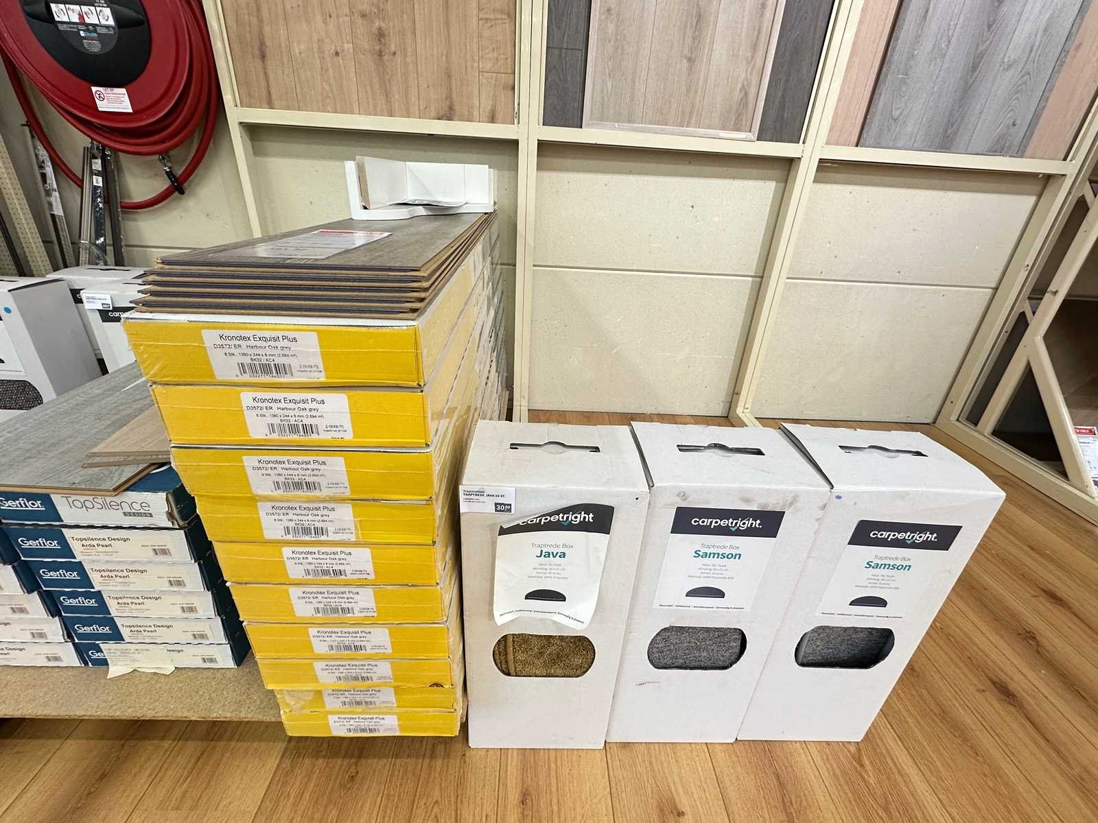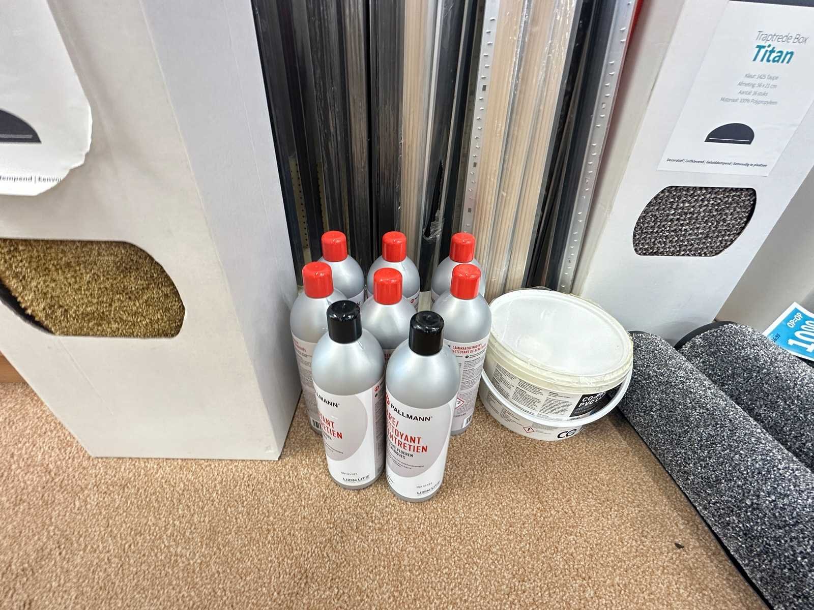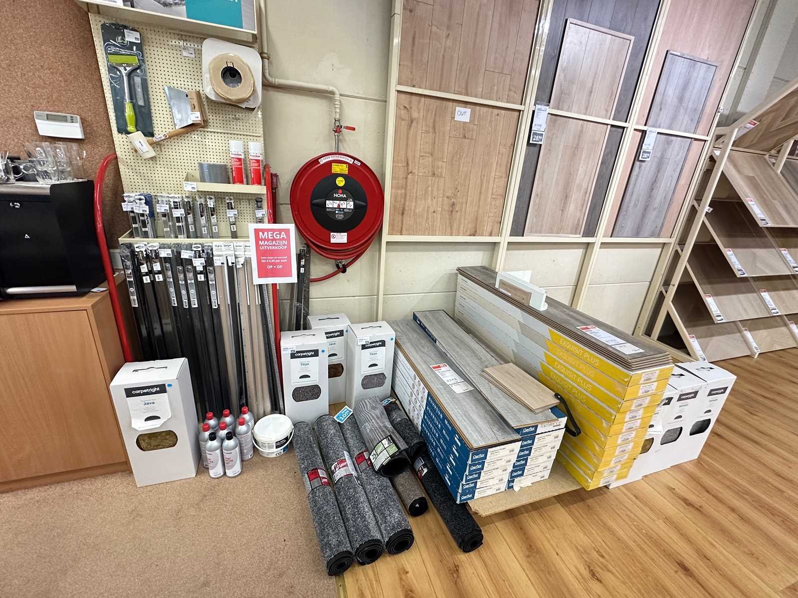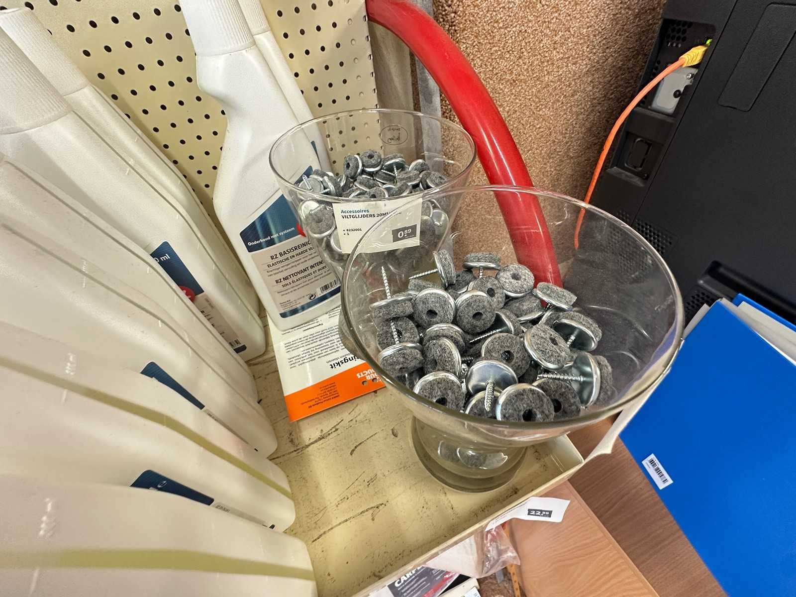 Deze partij bestaat uit onderhoudsproducten, ondervloeren, meubelvilten, bekleding voor traptrede, laminaat en plinten.