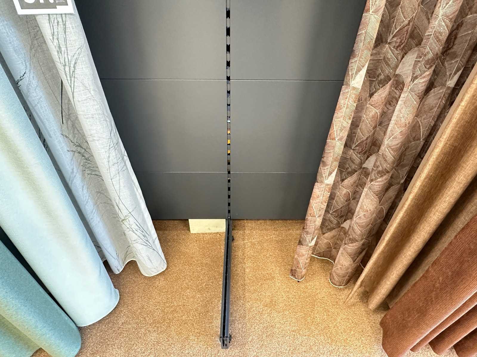Deze wand bestaat uit 15 delen van 1 meter. De delen zijn demontabel. Voorzien van LED verlichting. Inclusief samples gordijnen en overige raamdecoratie. Afmeting l: 15000mm Afmeting b: 750mm Afmeting h: 2720mm Hout: true Staal: true