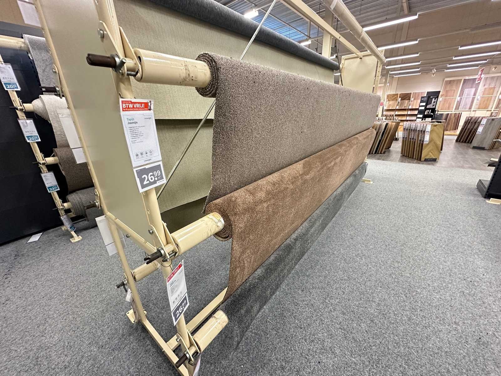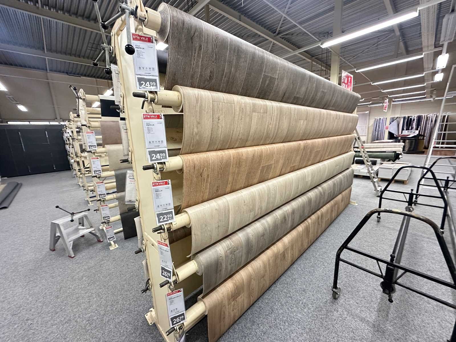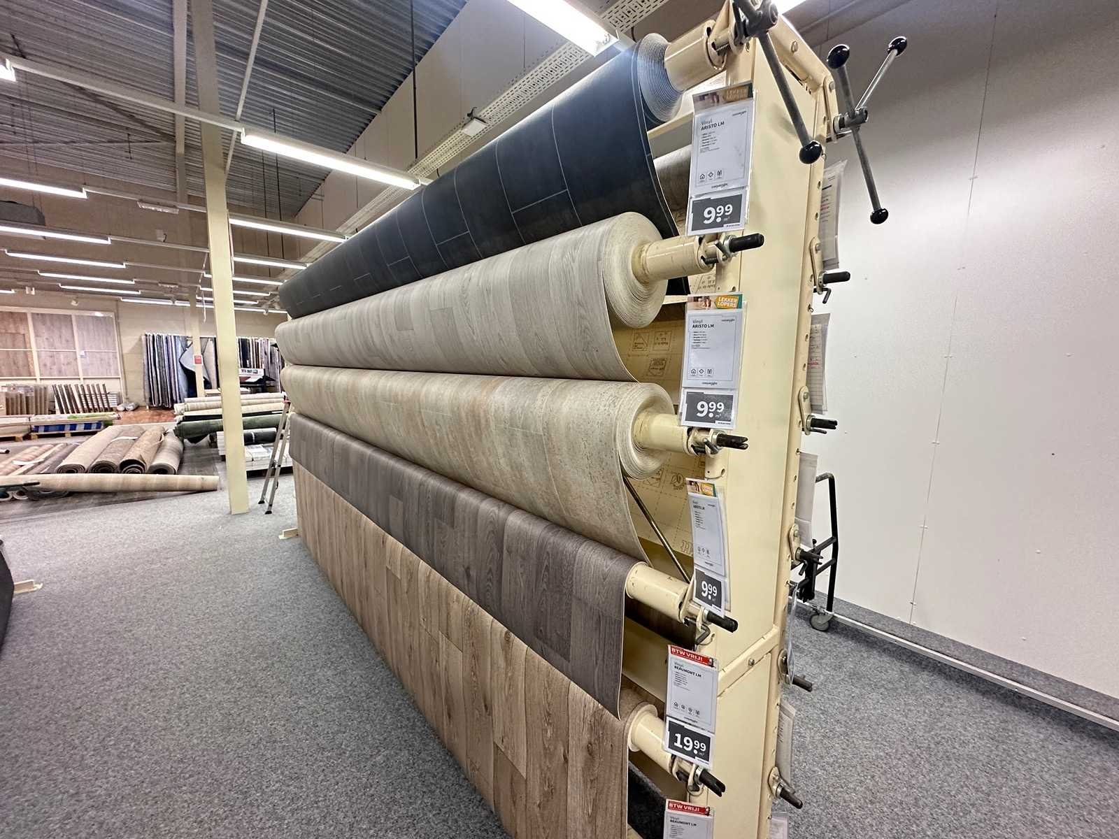 Deze partij bestaat uit diverse soorten vloerbedekking op 9 rekken. Verschillende afmetingen en kleuren. Exclusief rekken.