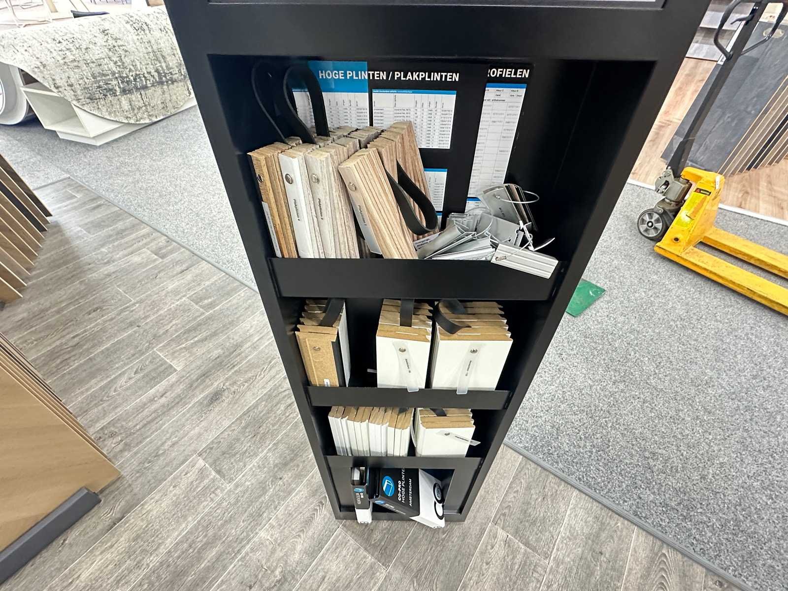 Deze display is voorzien van een aantal samples plinten Lengte: 43cm Breedte: 43cm Hoogte: 187cm Materiaal: metaal en hout