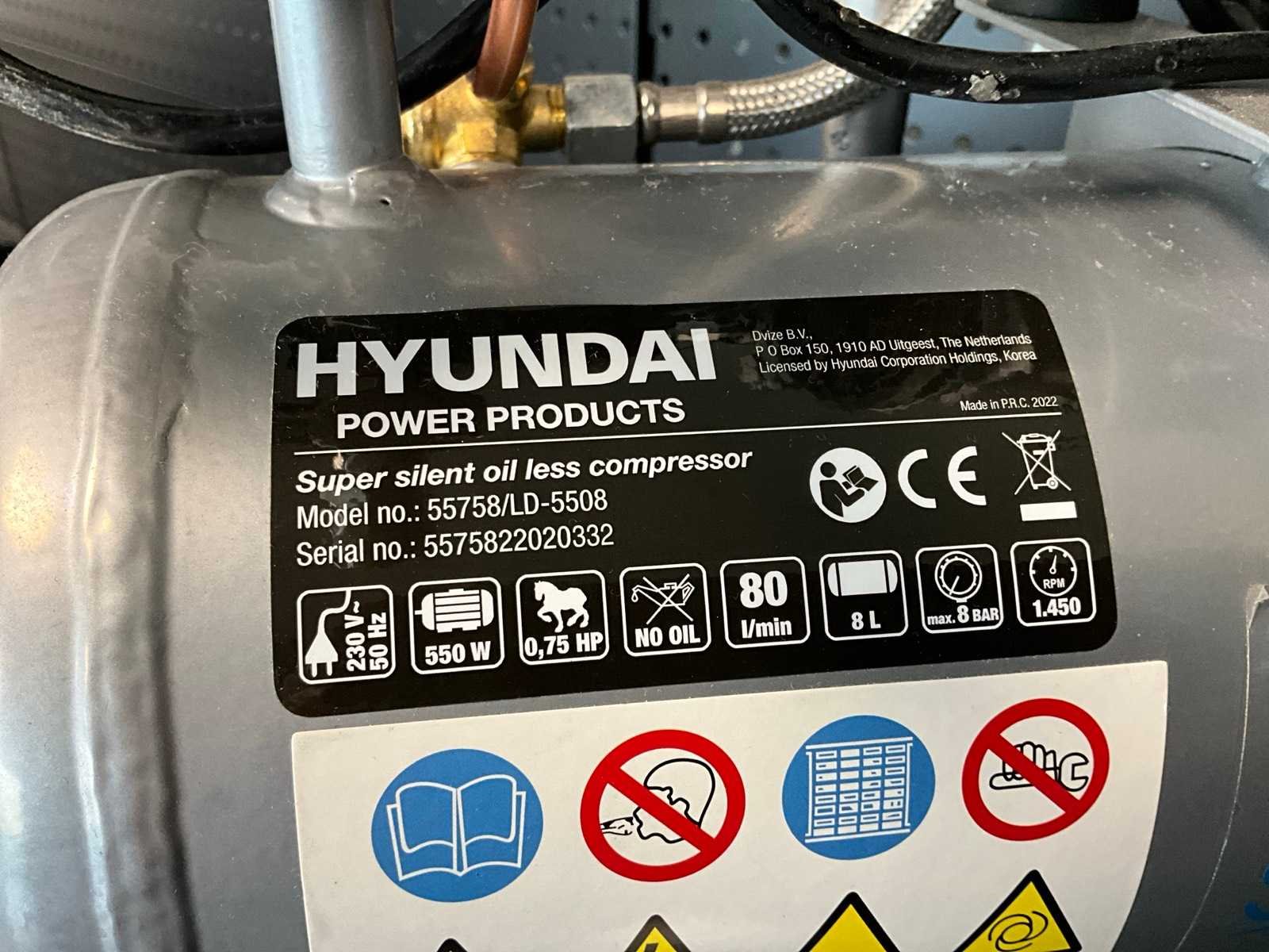 Merk: Hyundai Type: 55758 Bouwjaar: 2022 Serienummer: 5575822020332 Capaciteit.: 8bar Luchtstroom: 80l/min Vermogen: 0.55kW Buffertank inhoud: 8l Aansluiting: 230V Totale afmeting L: 450mm Totale afmeting Breedte: 200mm Totale afmeting Hoogte: 520mm