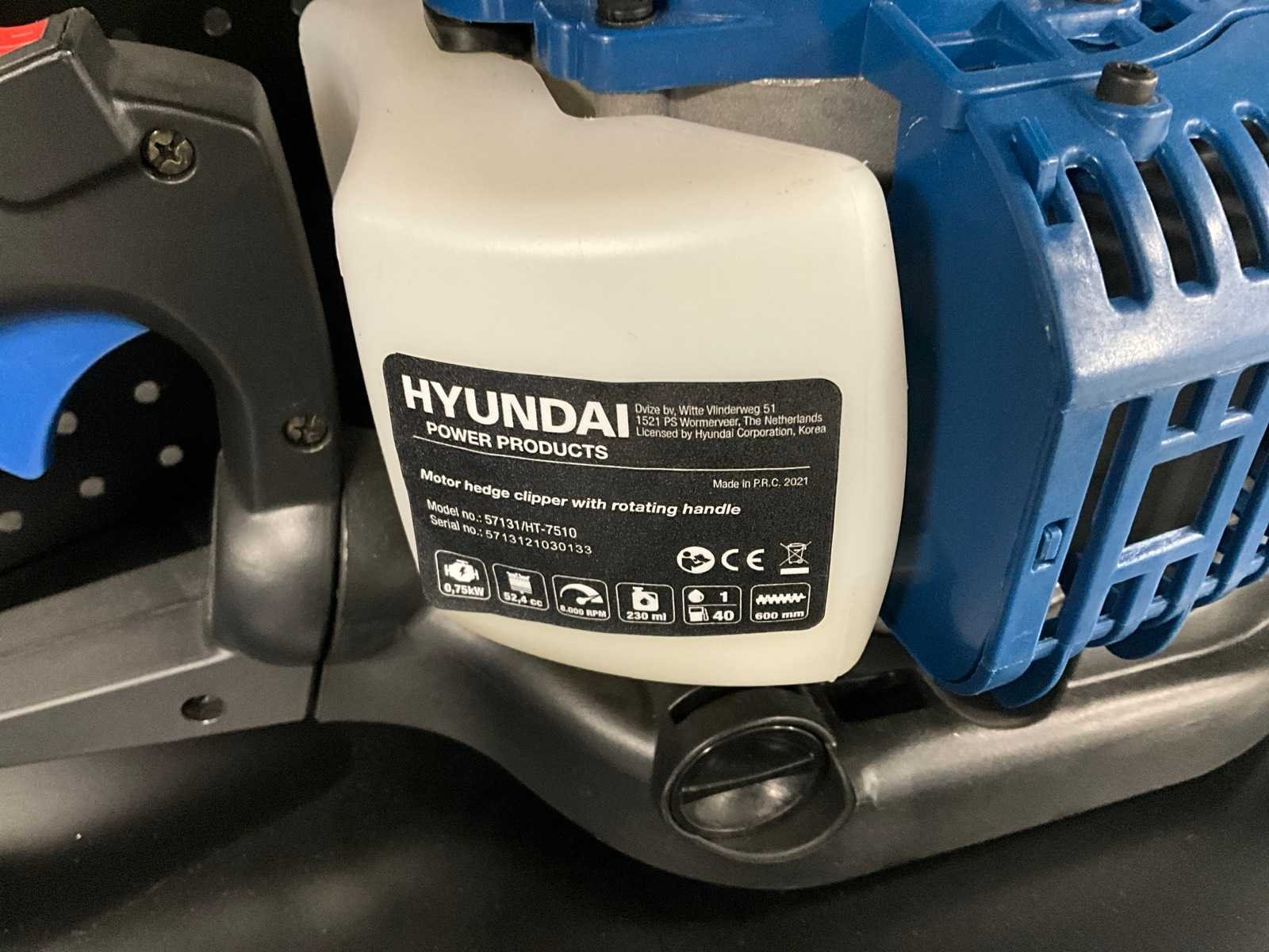 2-takt motor 52.4cc; inclusief gehoor -en oogbescherming Merk: Hyundai Type: 57131 Bouwjaar: 2021 Lengte: 600mm Brandstofmotor aangedreven: true Brandstof: Benzine Vermogen: 0.75kW Eigen gewicht: 6.5kg
