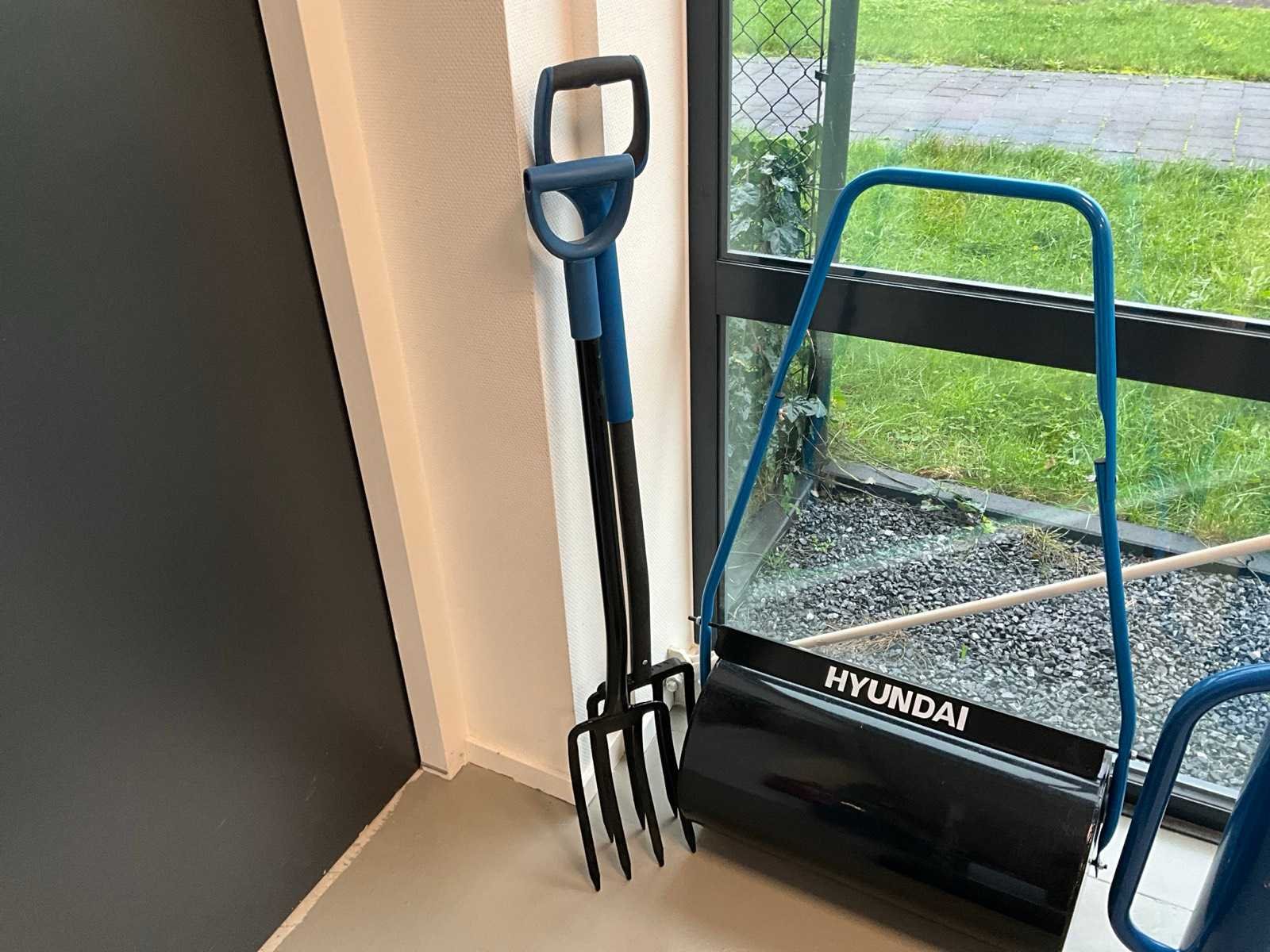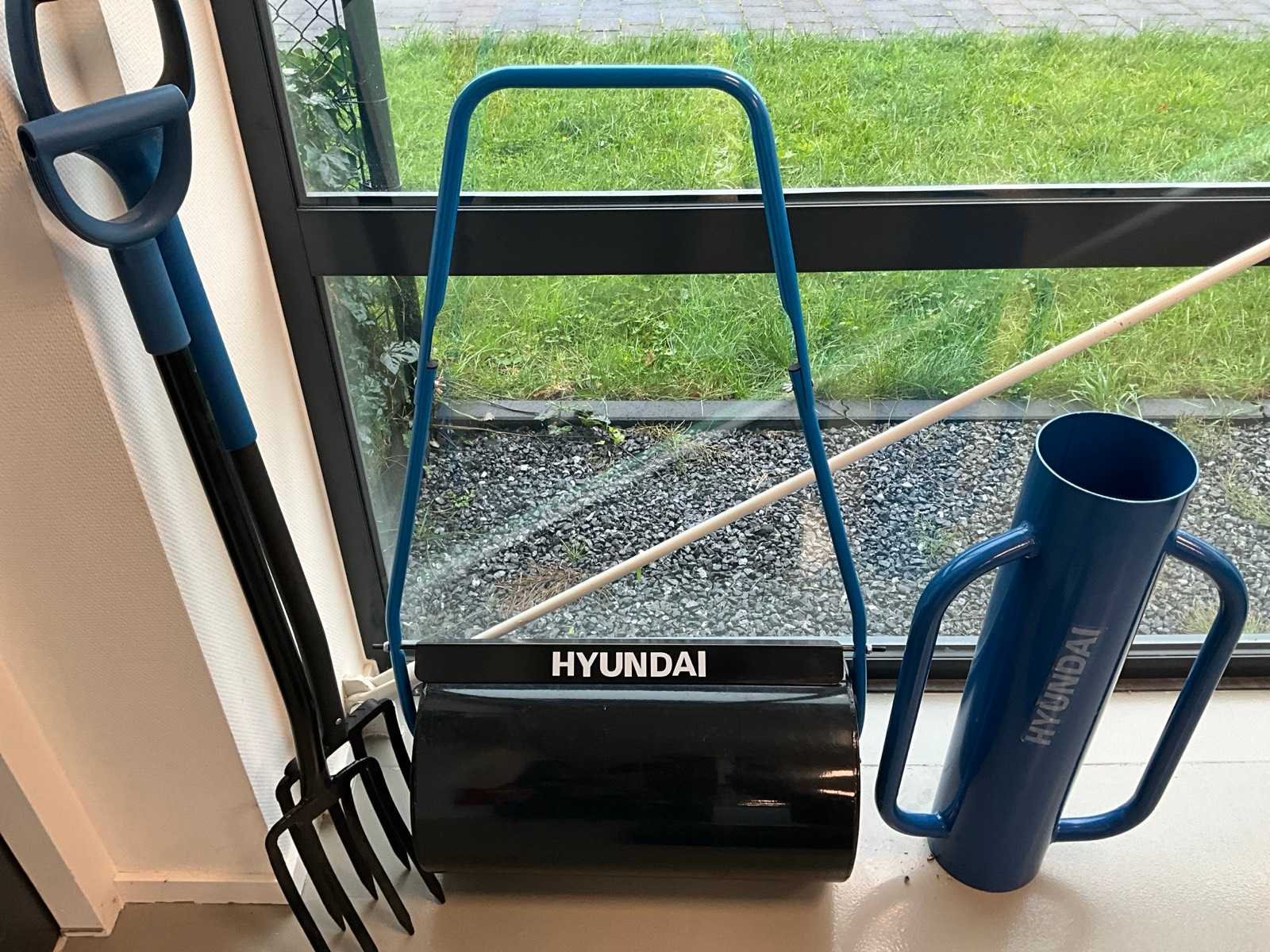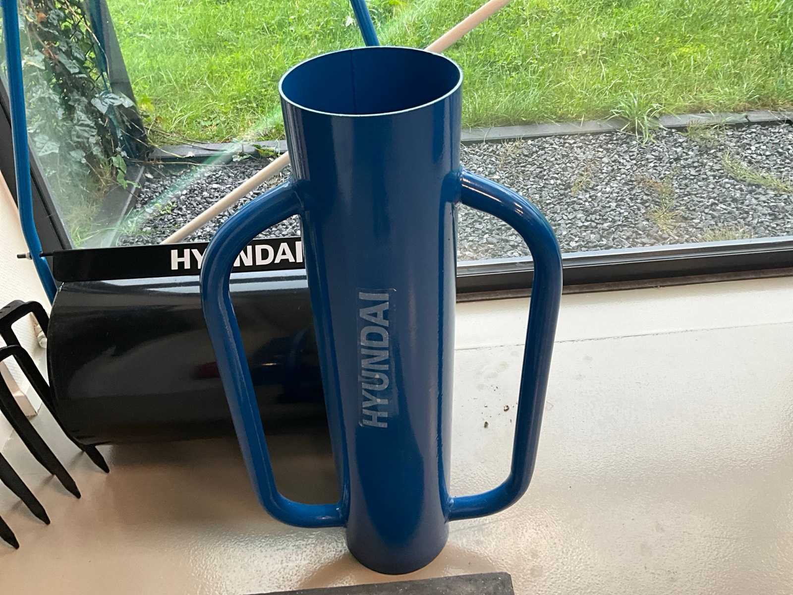 Bestaande uit: Hyundai palenrammer, Hyundai tuinwals, 2x Hyundai hooivork; inclusief paalhouder op blok