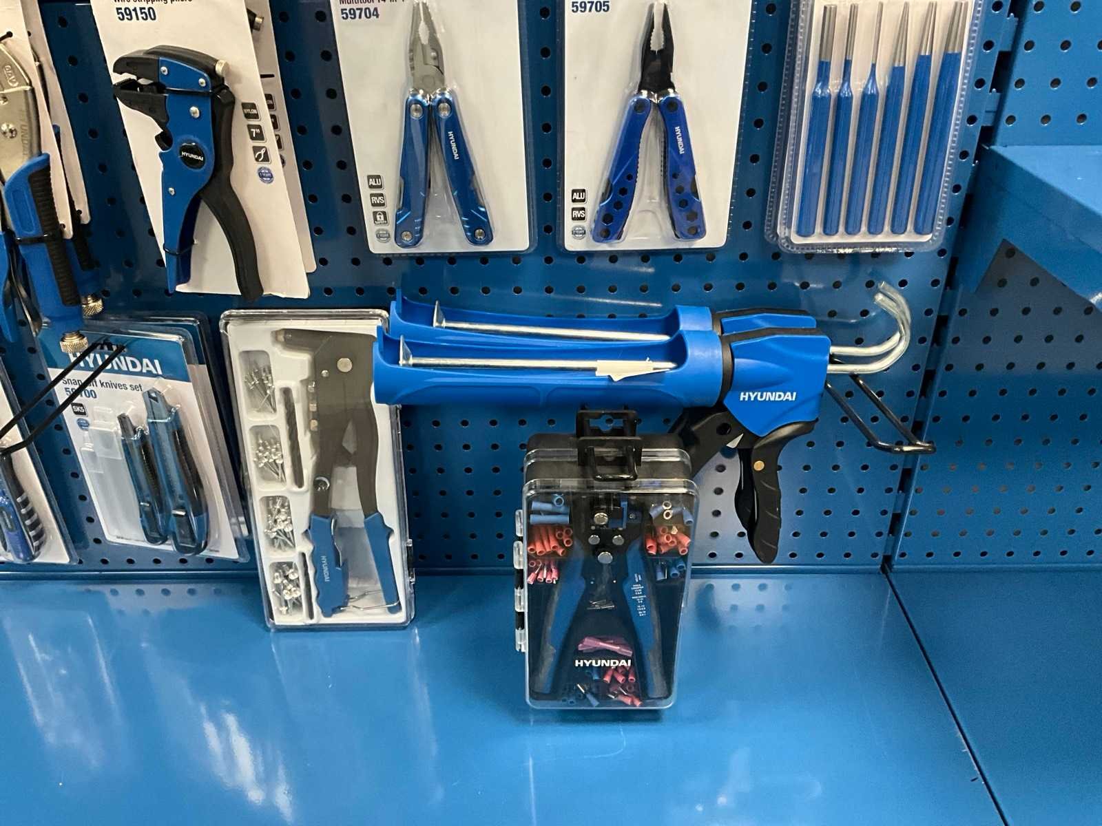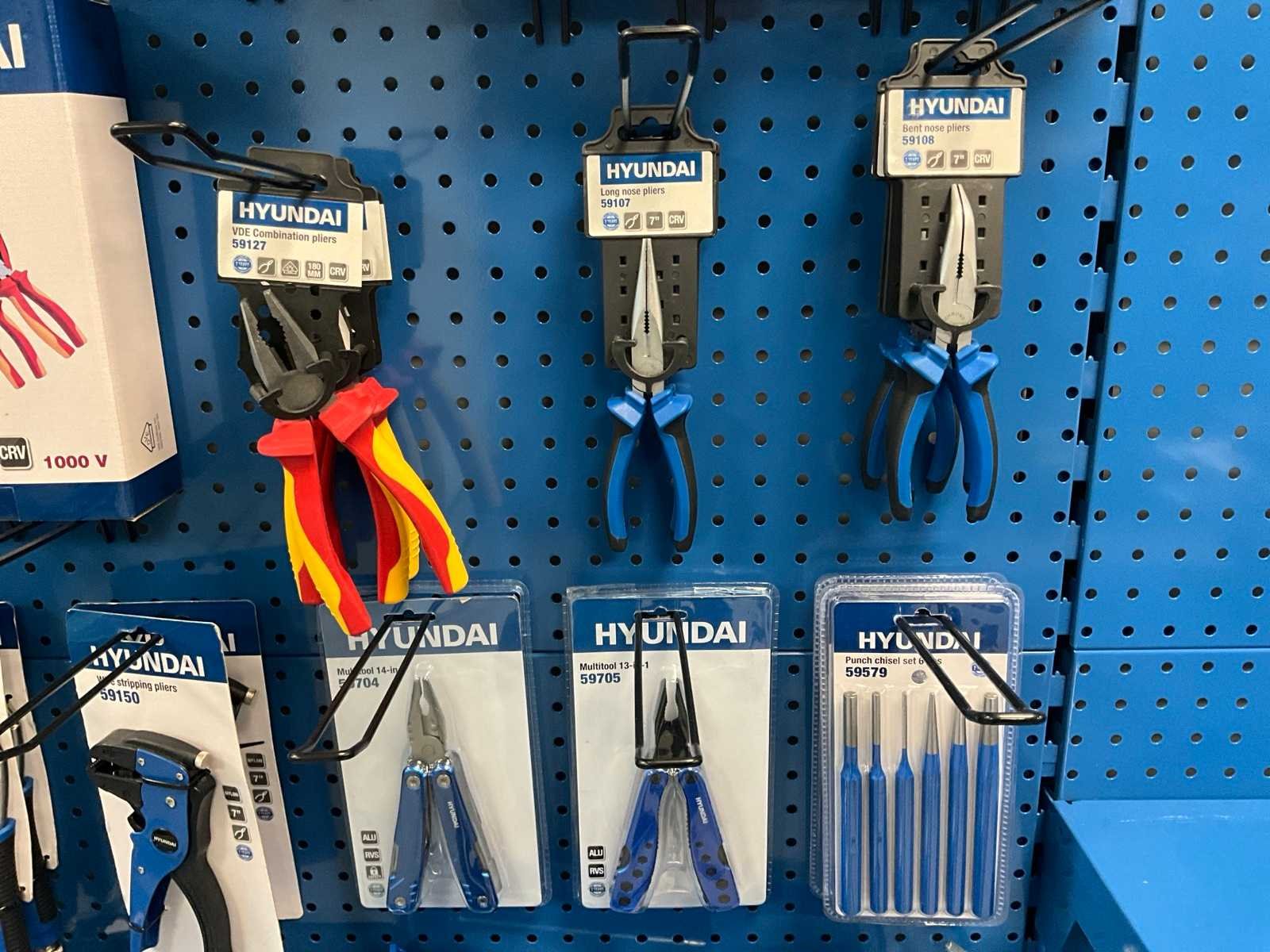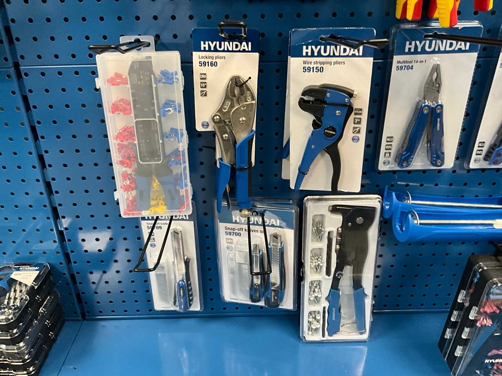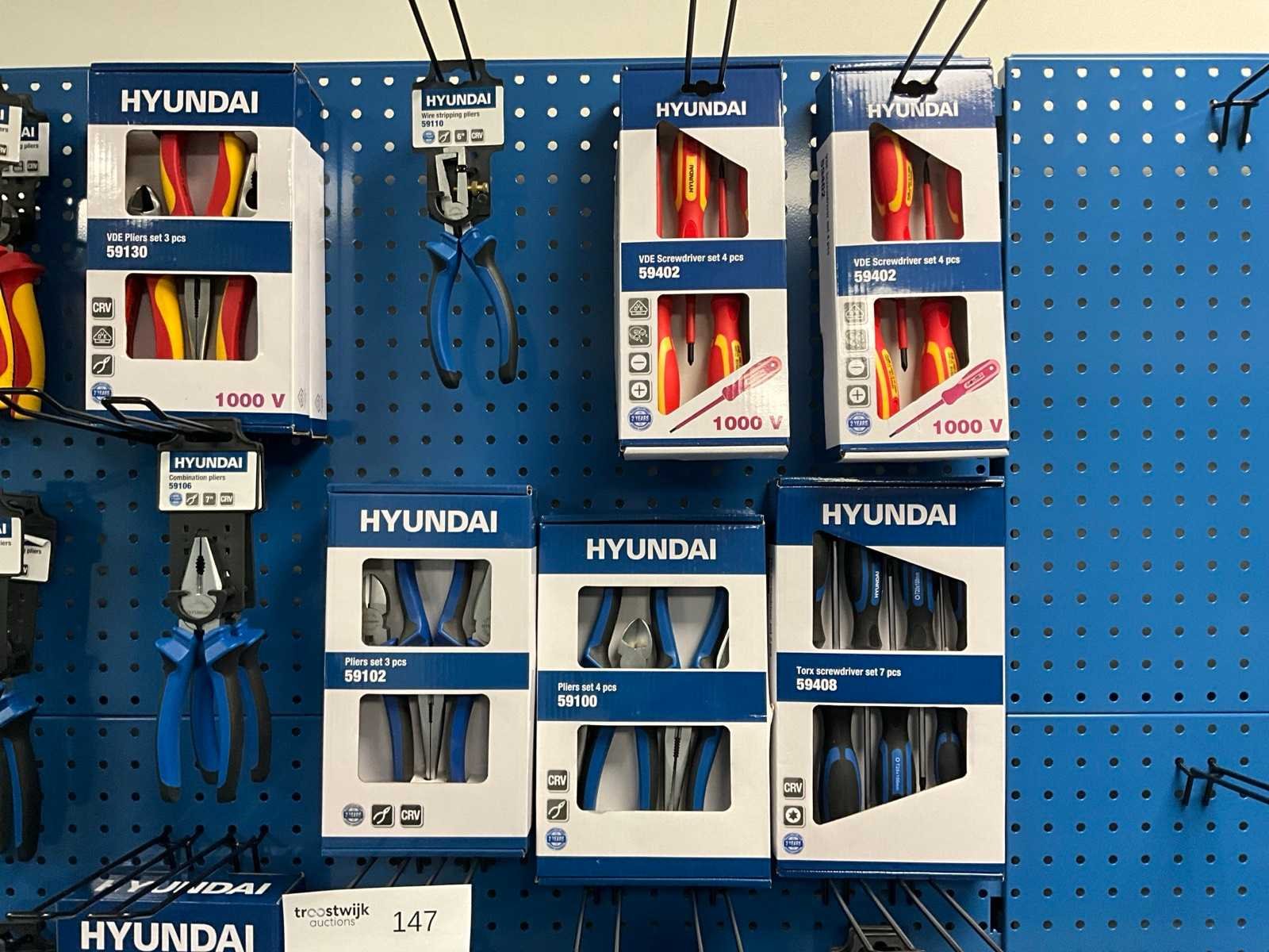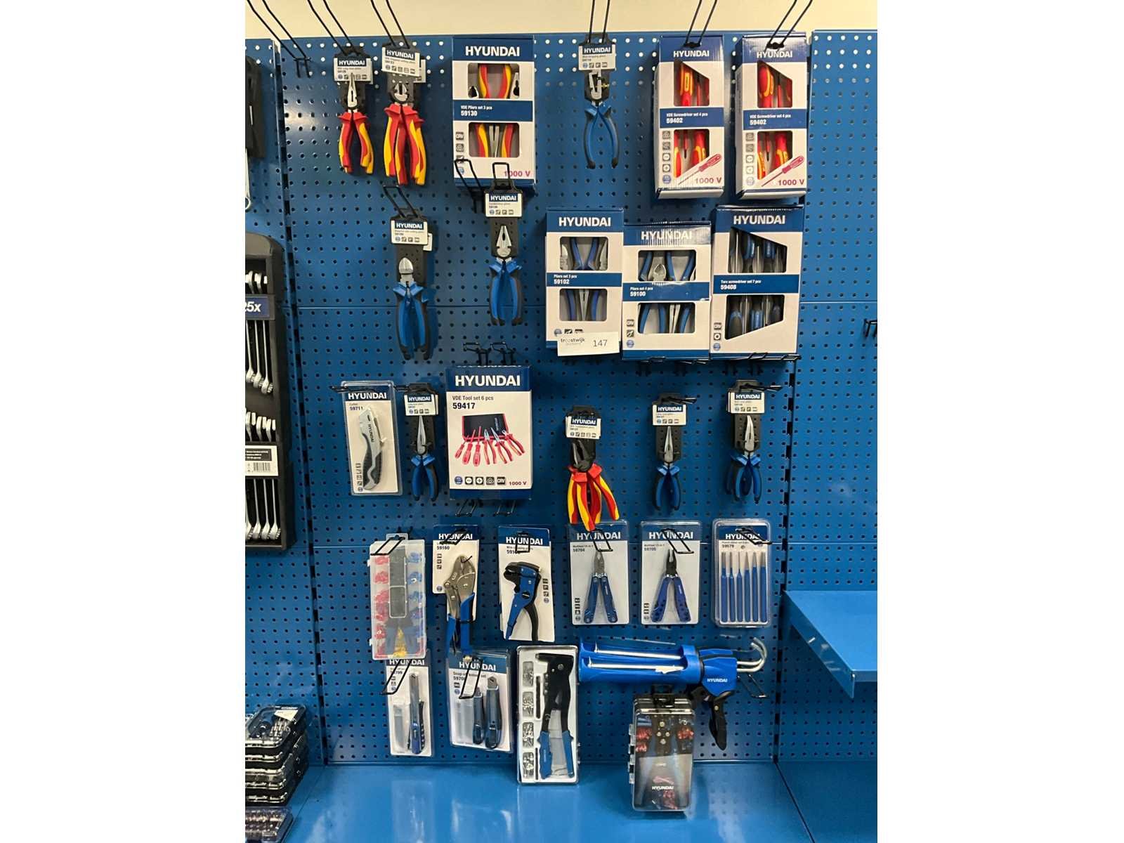 Bestaande uit onder andere: striptangen, kniptangen, schroevendraaiersets, combinatietangen, kitdrukkers, popnageltang, mesjes, etc; inhoud van 1 meter achterwand Merk: Hyundai