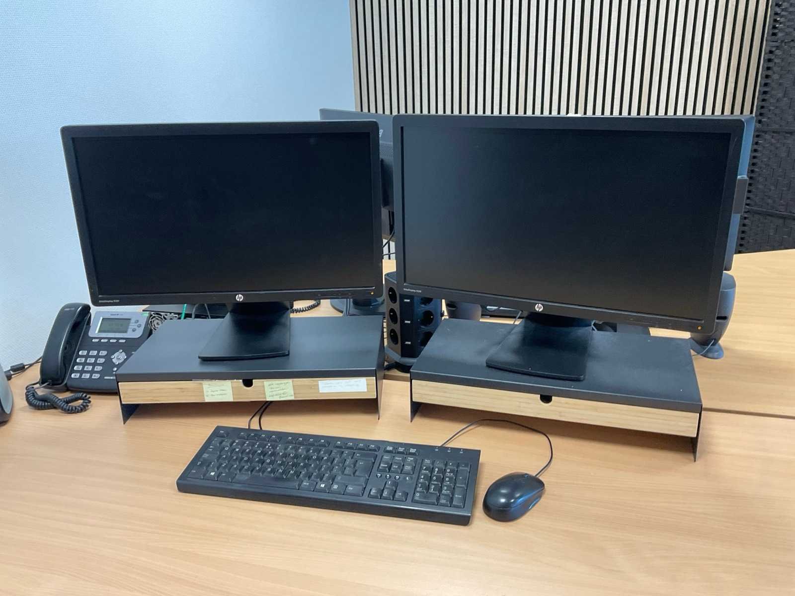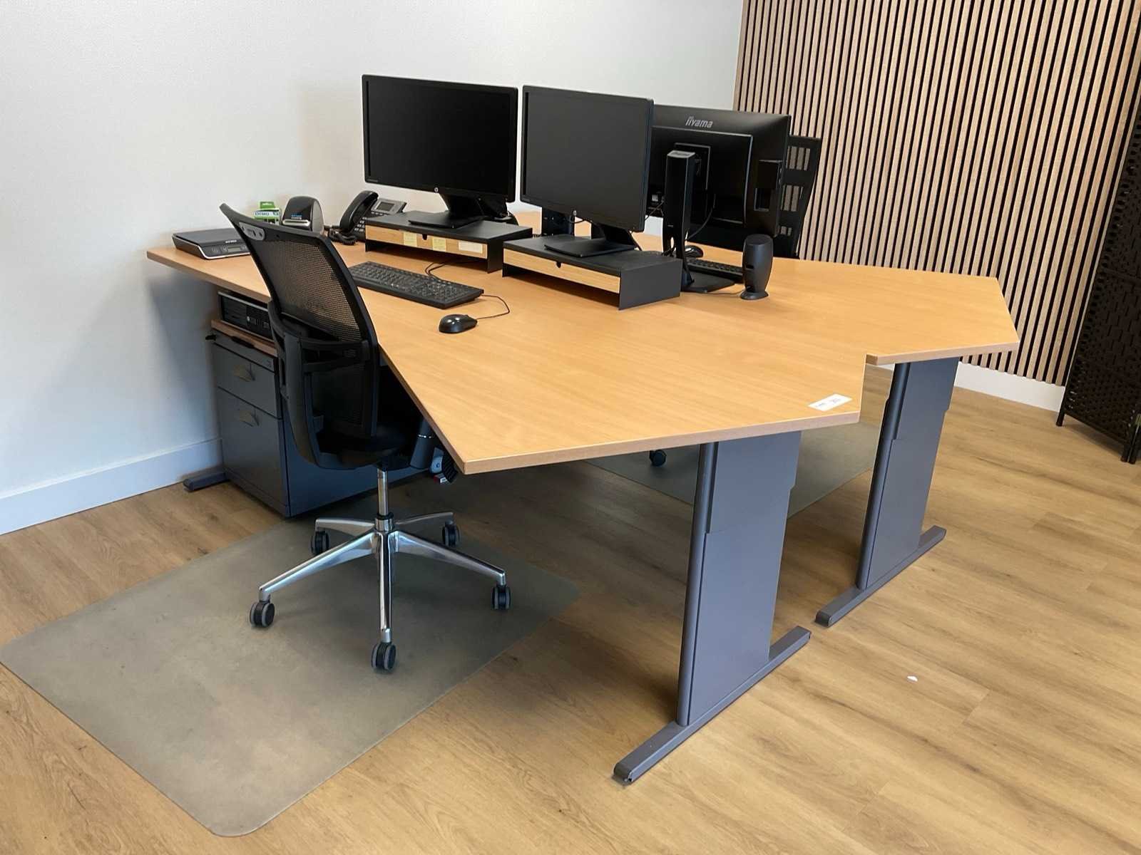 Inclusief: (2x) mobiele bureaustoel, (6x) LCD monitor, (2x) ladenblok, (1x) kapstok. Let op! Deze kavel bevindt zich op de eerste etage. Lengte: 220cm Breedte: 113cm