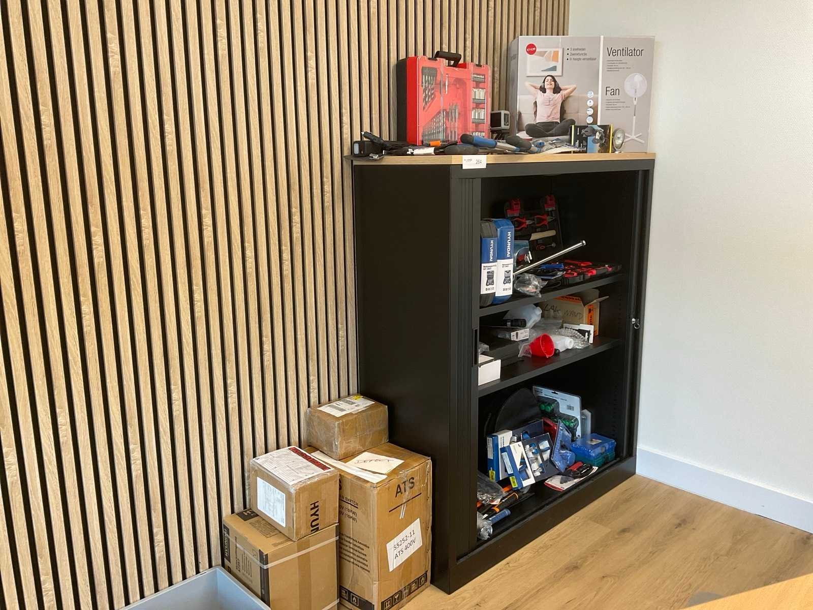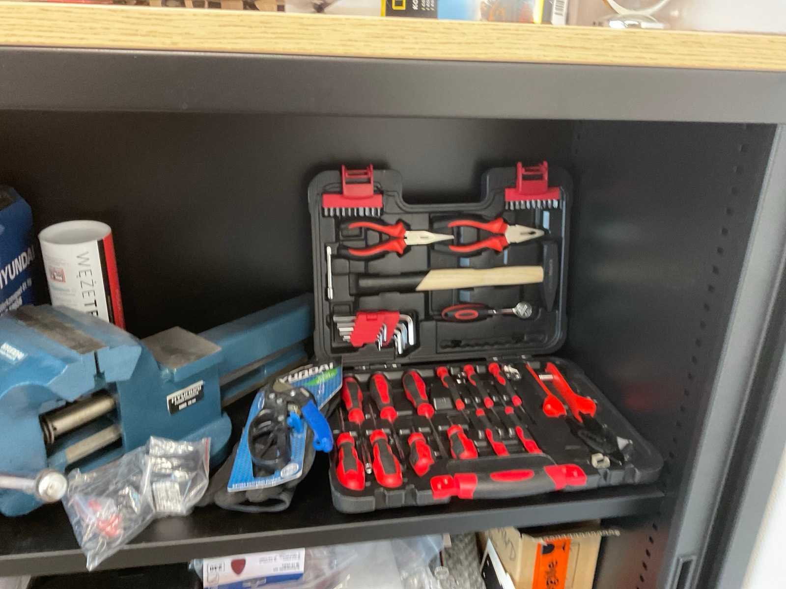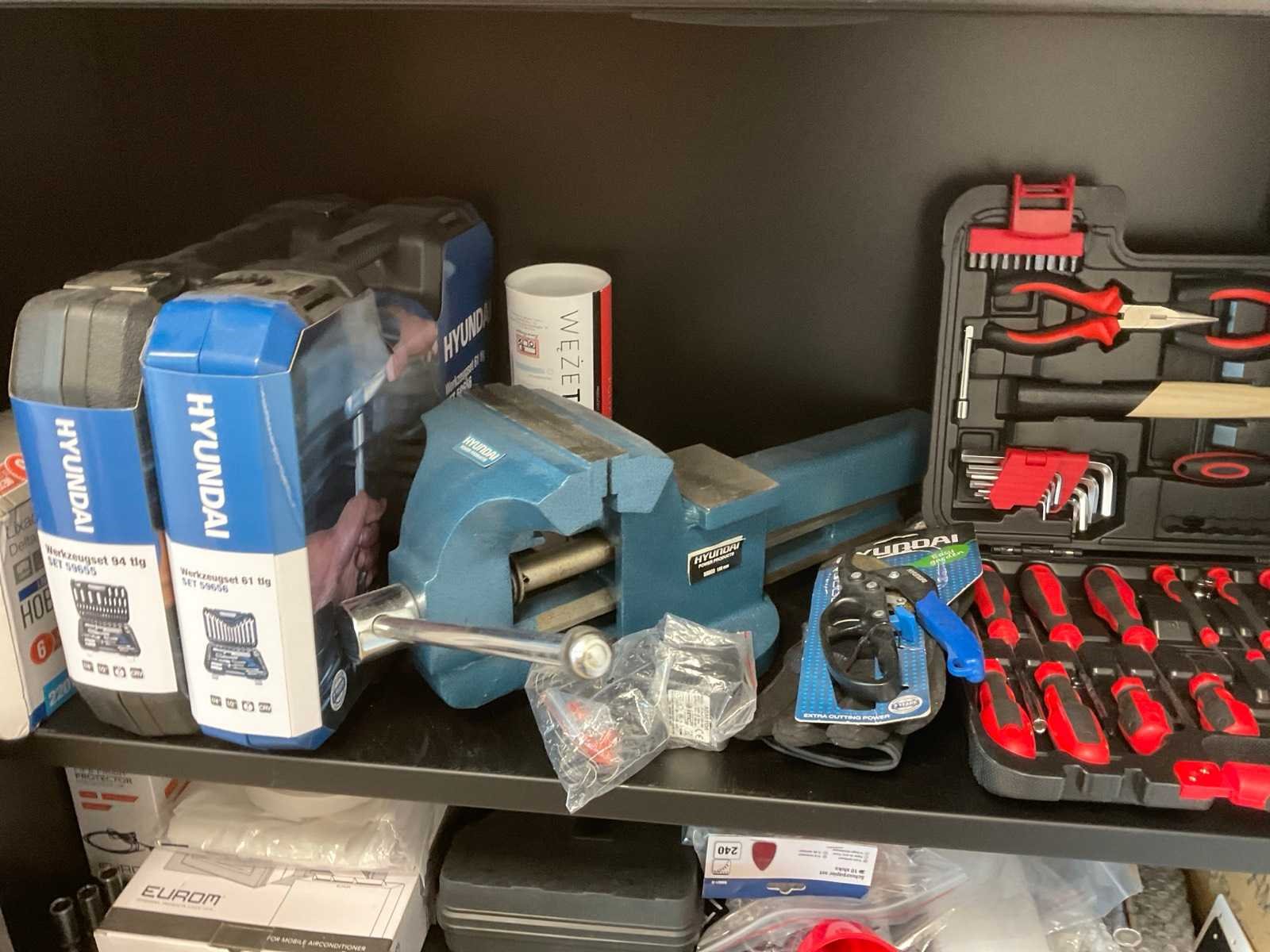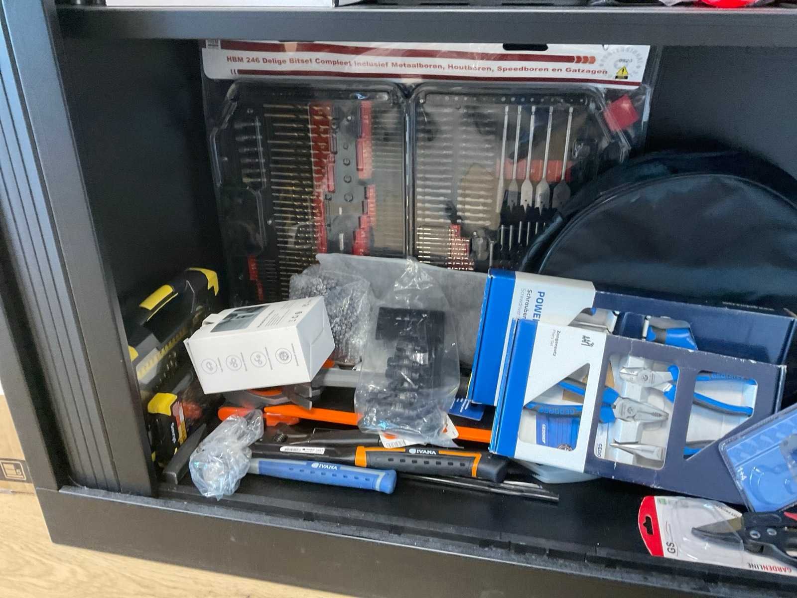 Formaat kast 120x43x138cm. Gereedschappen bestaaande uit: doppensets, bankschroef, ventilator, tangen, etc. Let op! Deze kavel bevindt zich op de eerste etage.