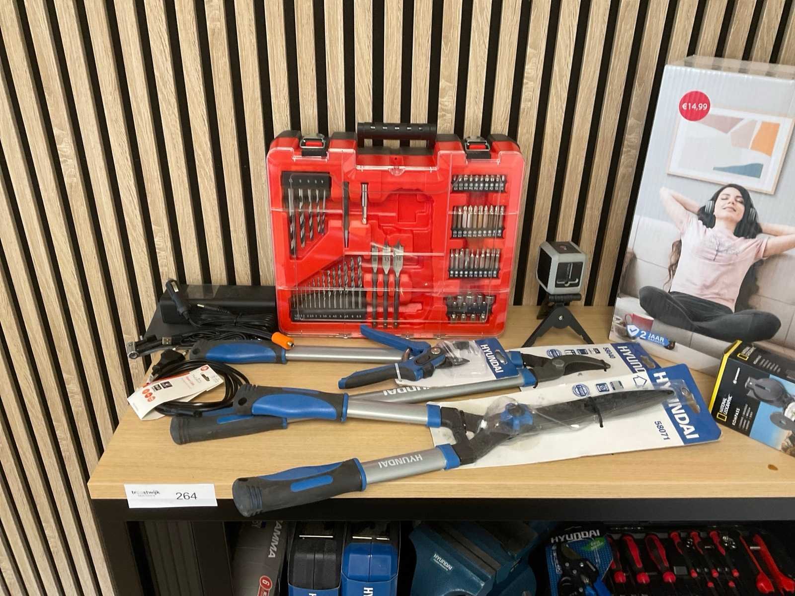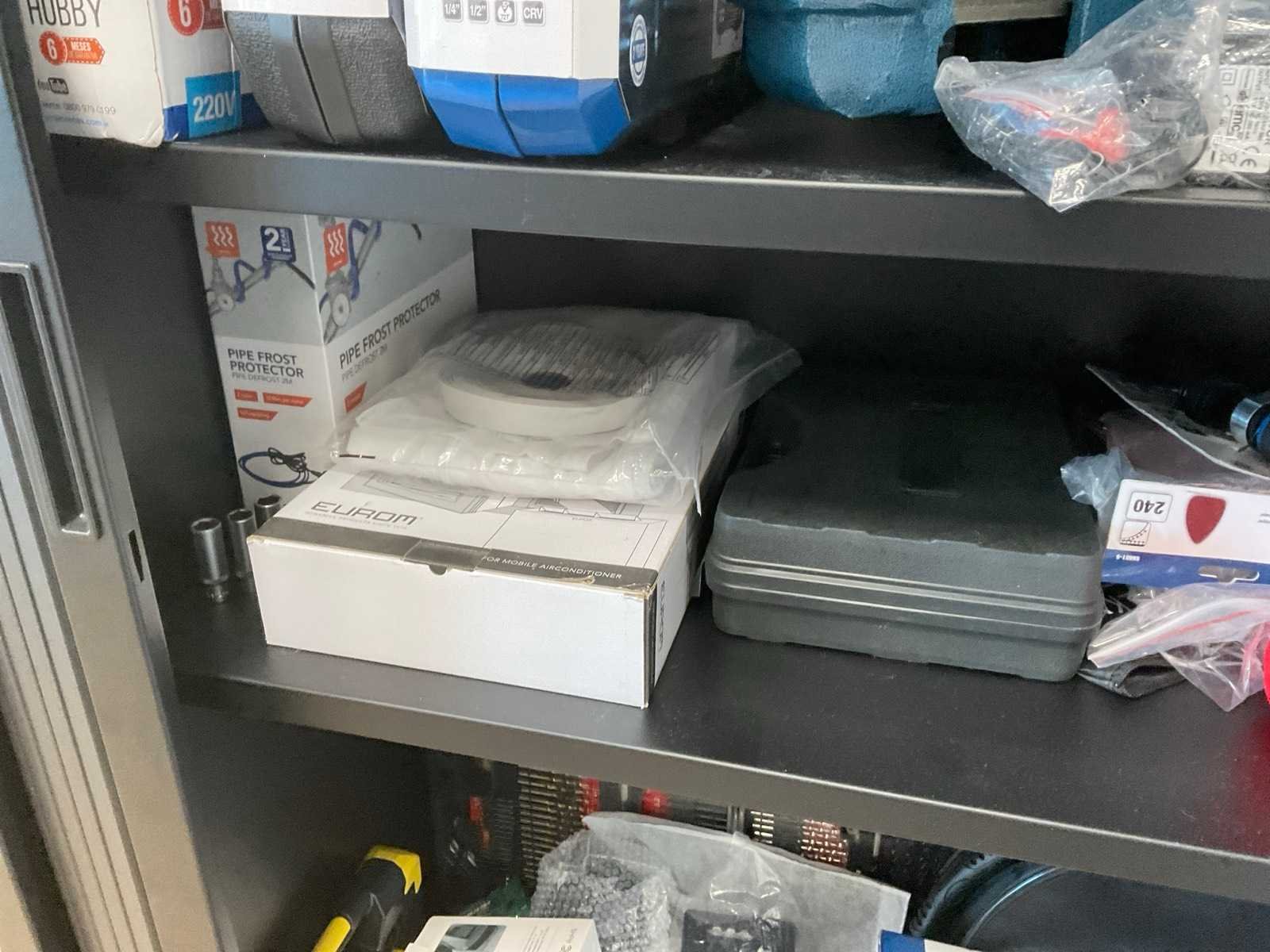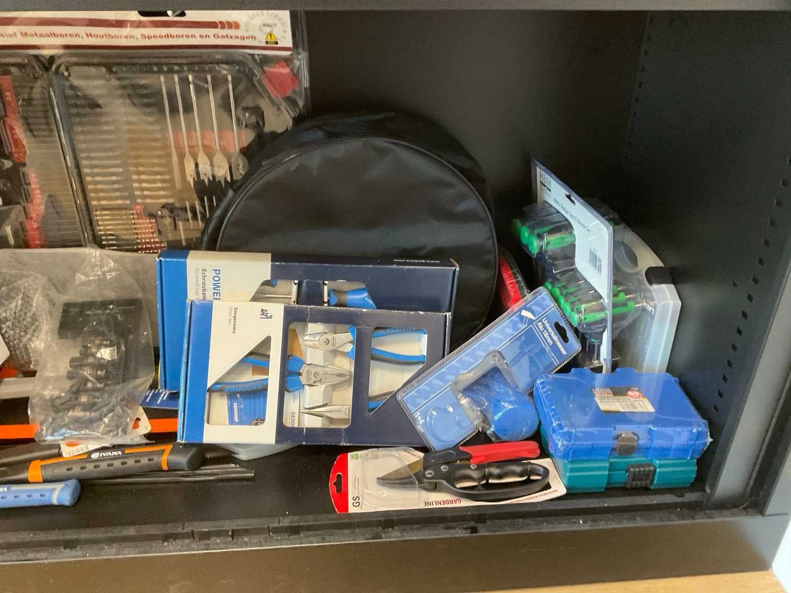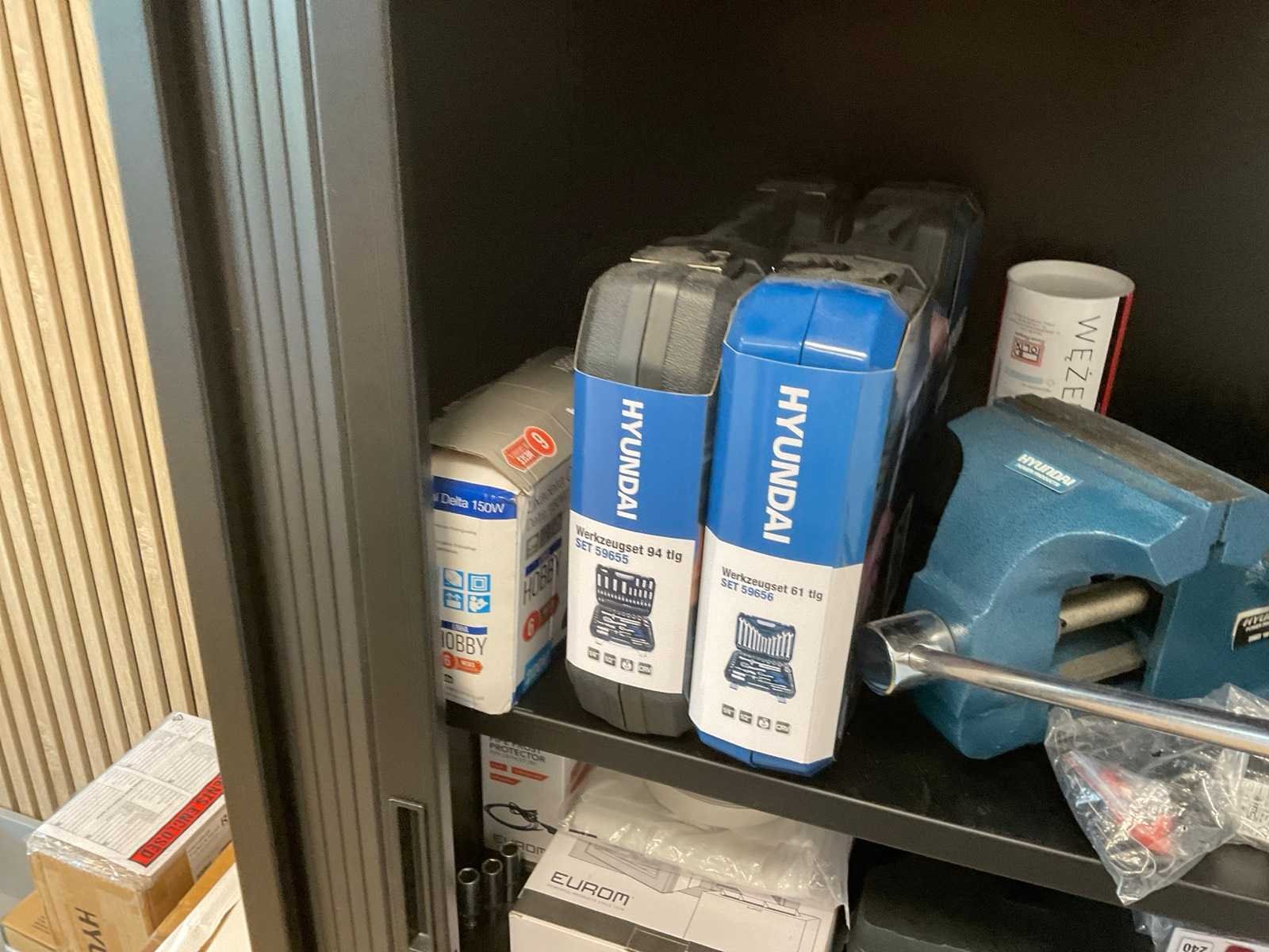 Formaat kast 120x43x138cm. Gereedschappen bestaaande uit: doppensets, bankschroef, ventilator, tangen, etc. Let op! Deze kavel bevindt zich op de eerste etage.