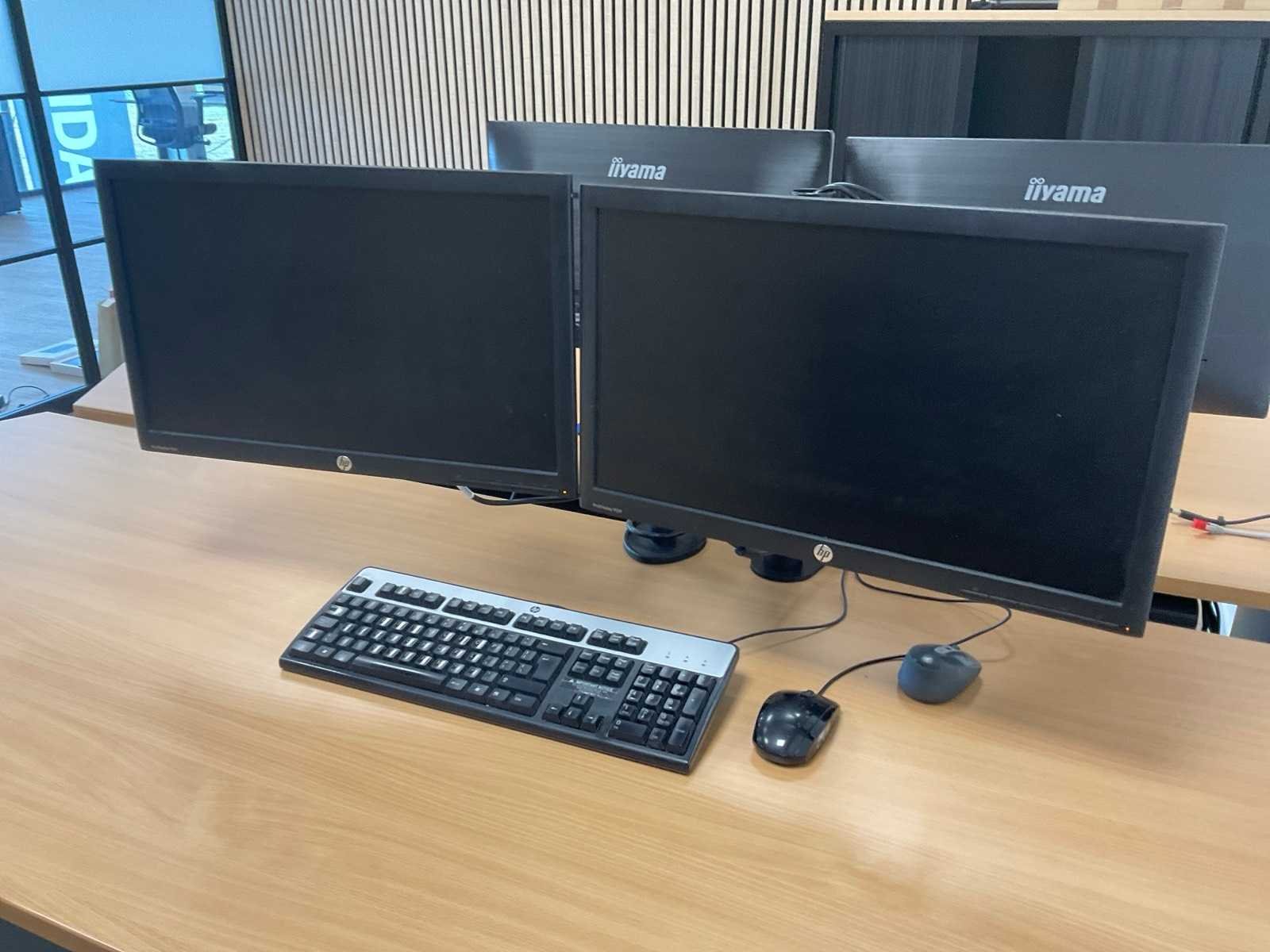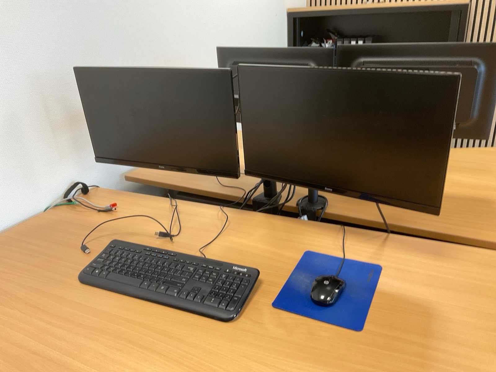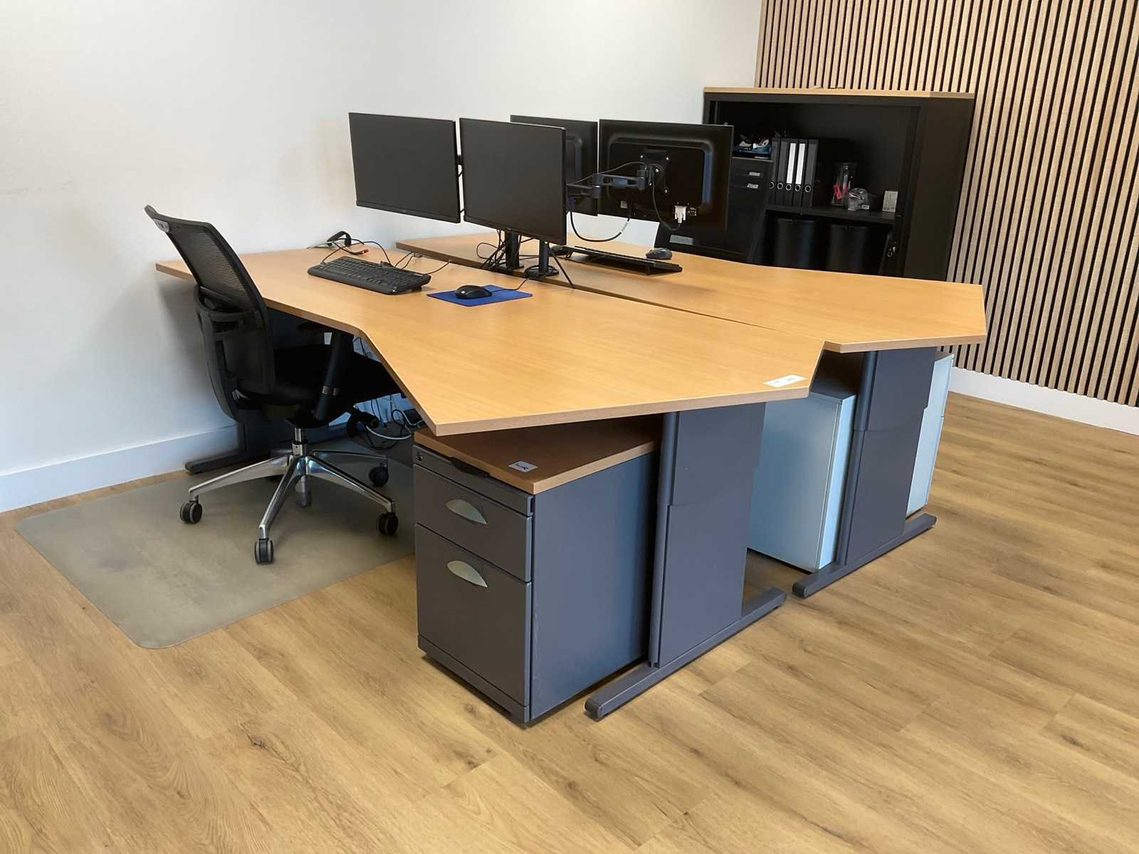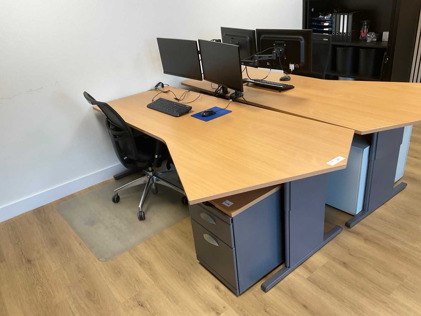 Inclusief: (2x) mobiele bureaustoel, (4x) LCD monitor op arm, (2x) ladenblok, (2x) jalousiedeurkast 120x43x138cm. Let op! Deze kavel bevindt zich op de eerste etage. Lengte: 220cm Breedte: 113cm