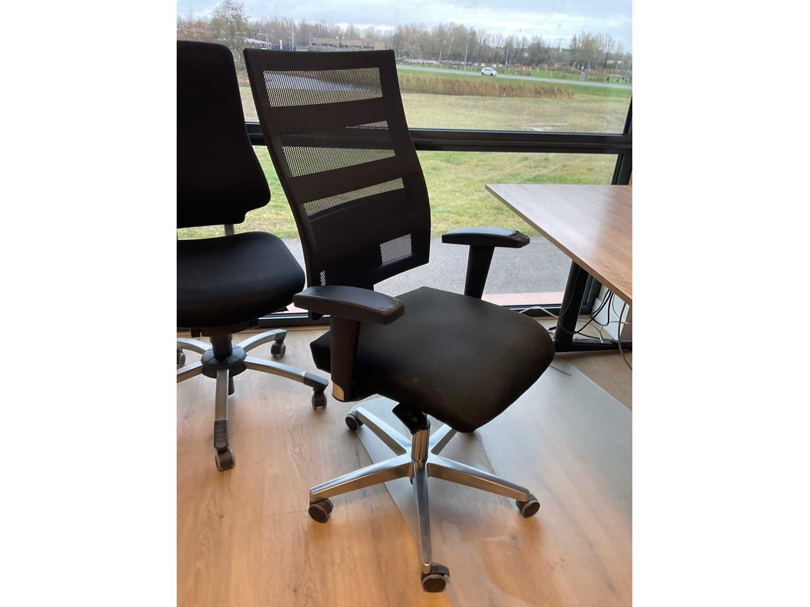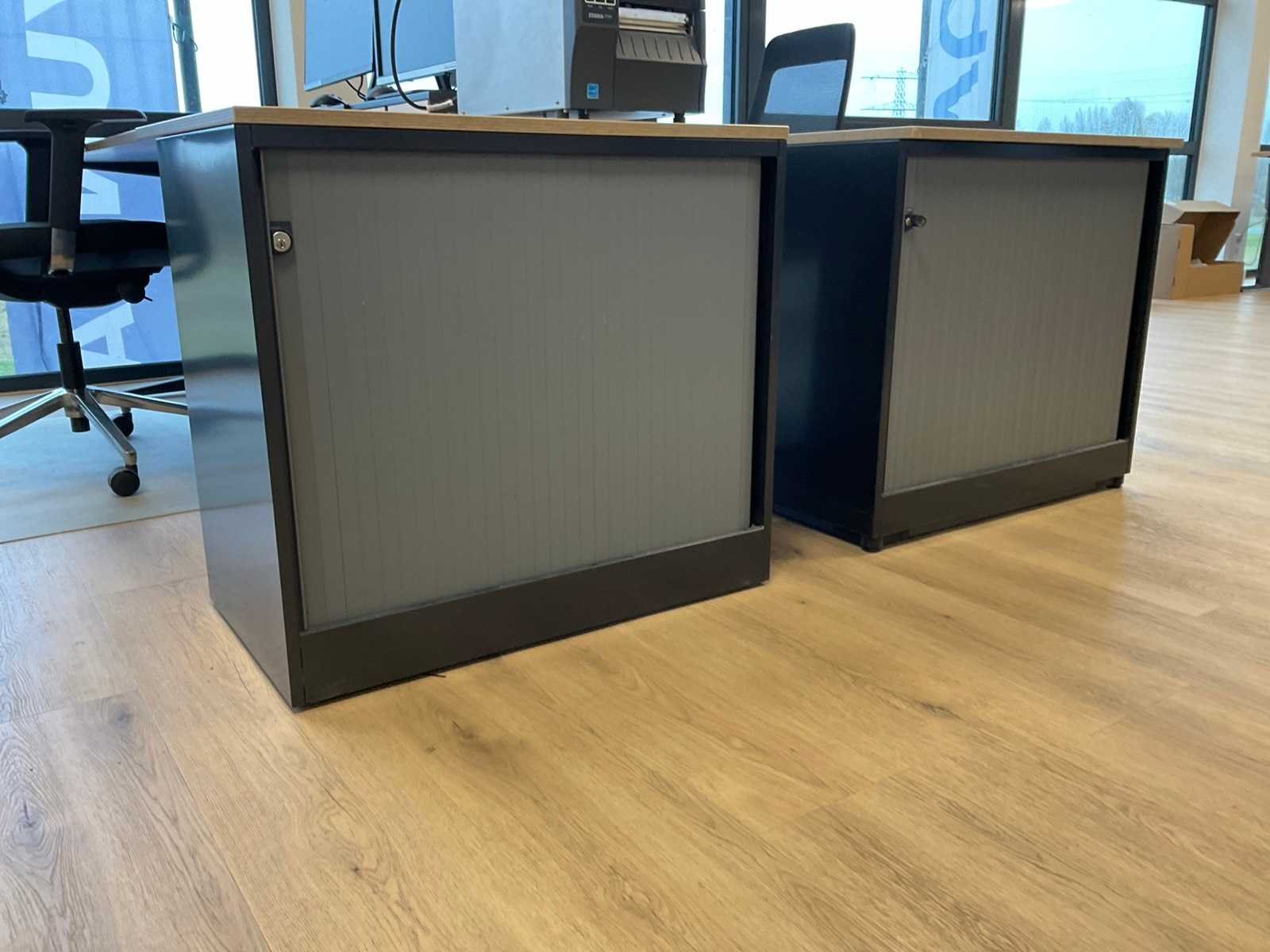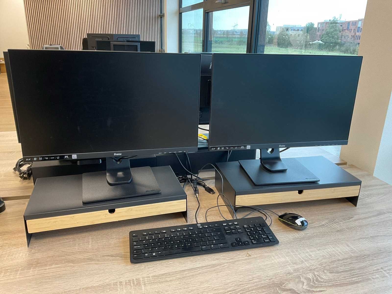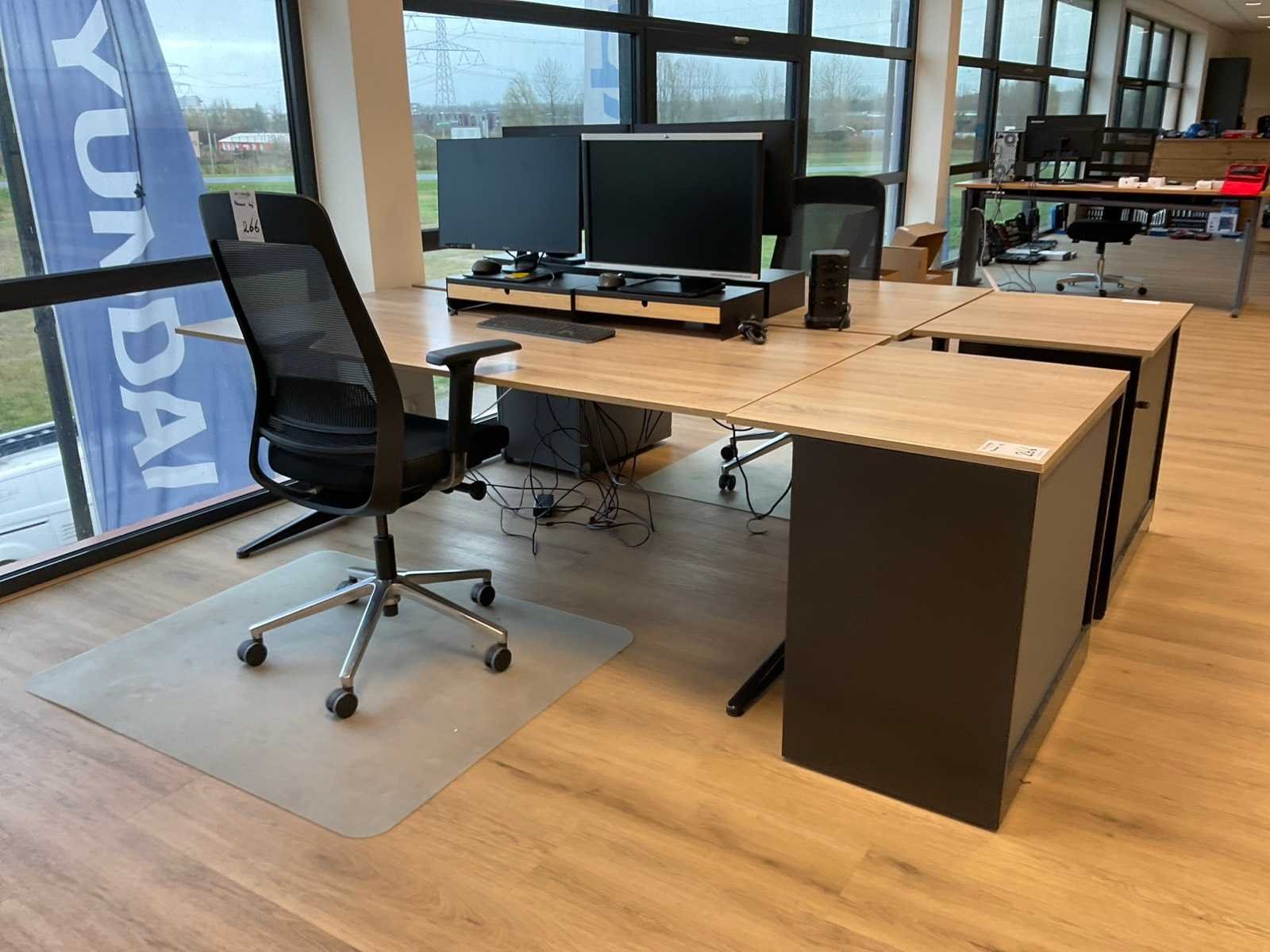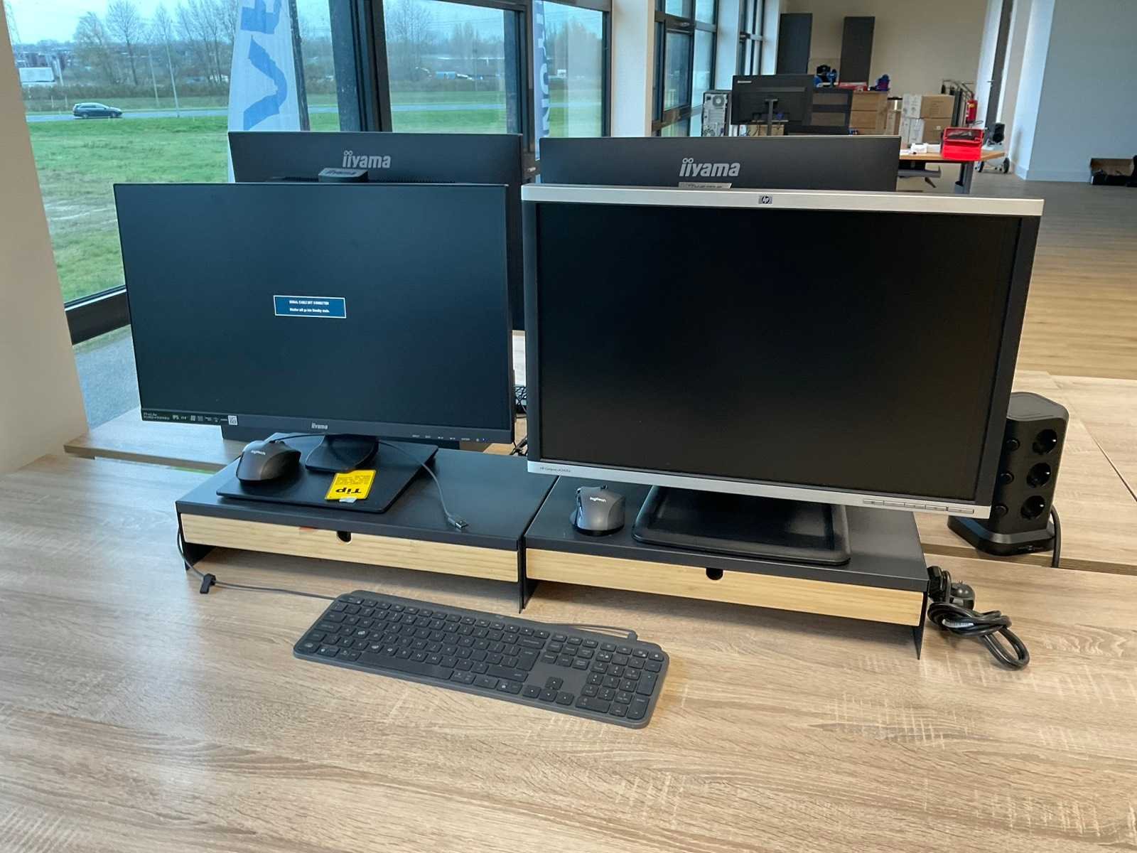 Voorzien van: (5x) mobiele bureaustoelen, (8x) monitorschermen, (4x) aanschuifkasten 80x60x74cm. Let op! Deze kavel bevindt zich op de eerste etage. Lengte: 180cm Breedte: 90cm Hoogte: 74cm