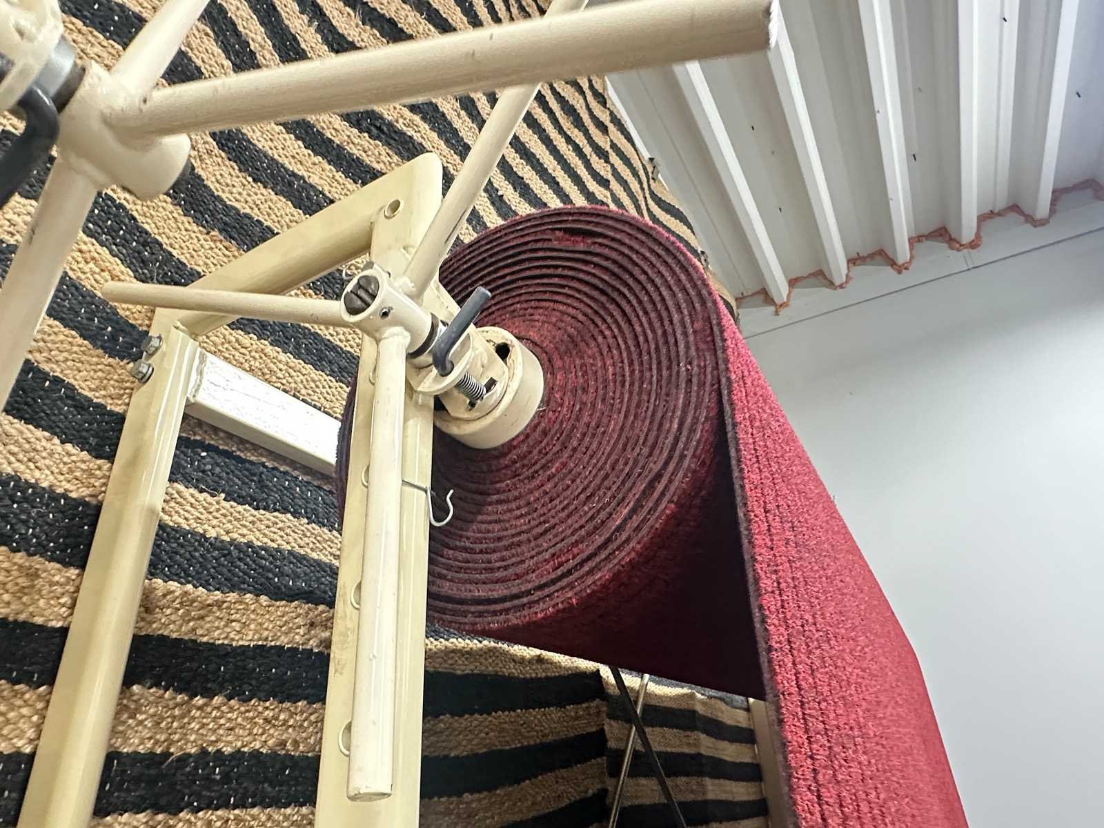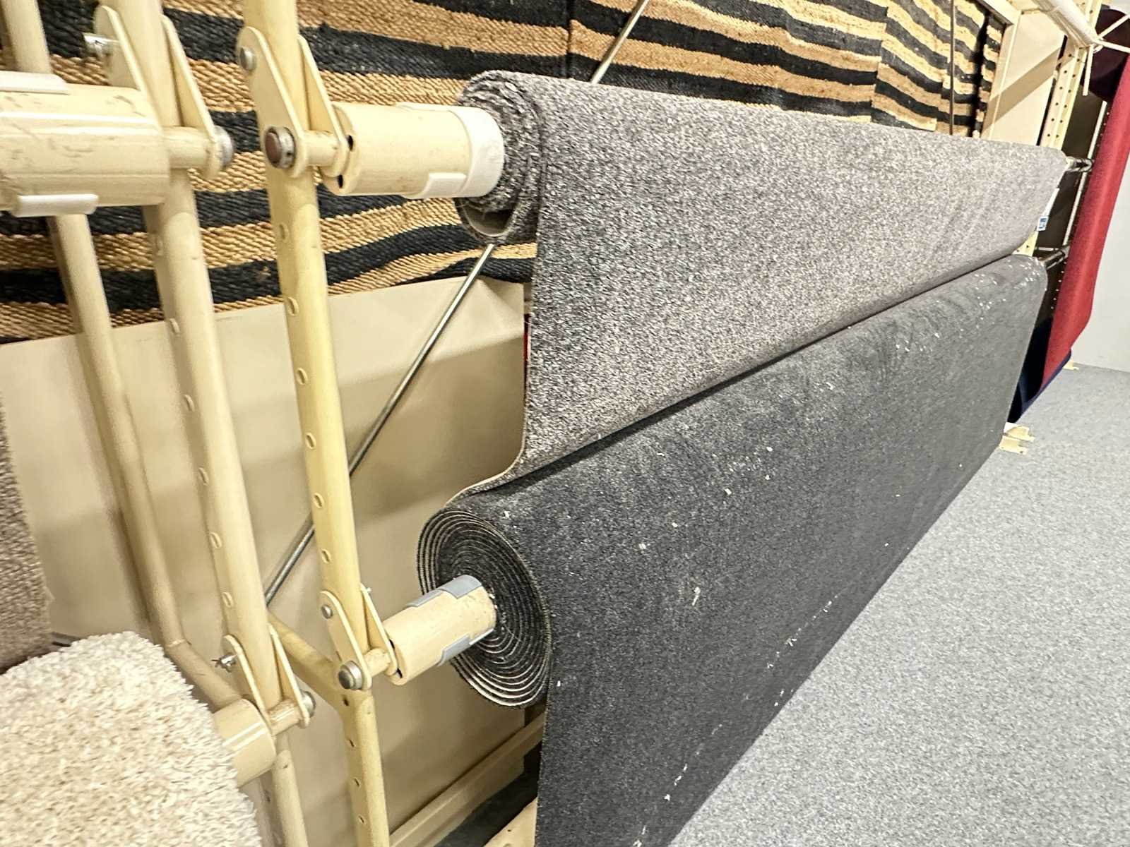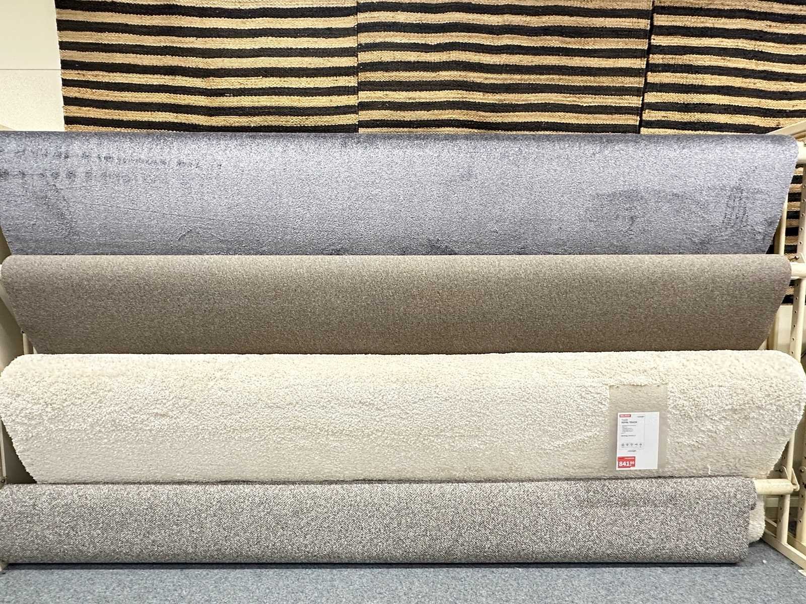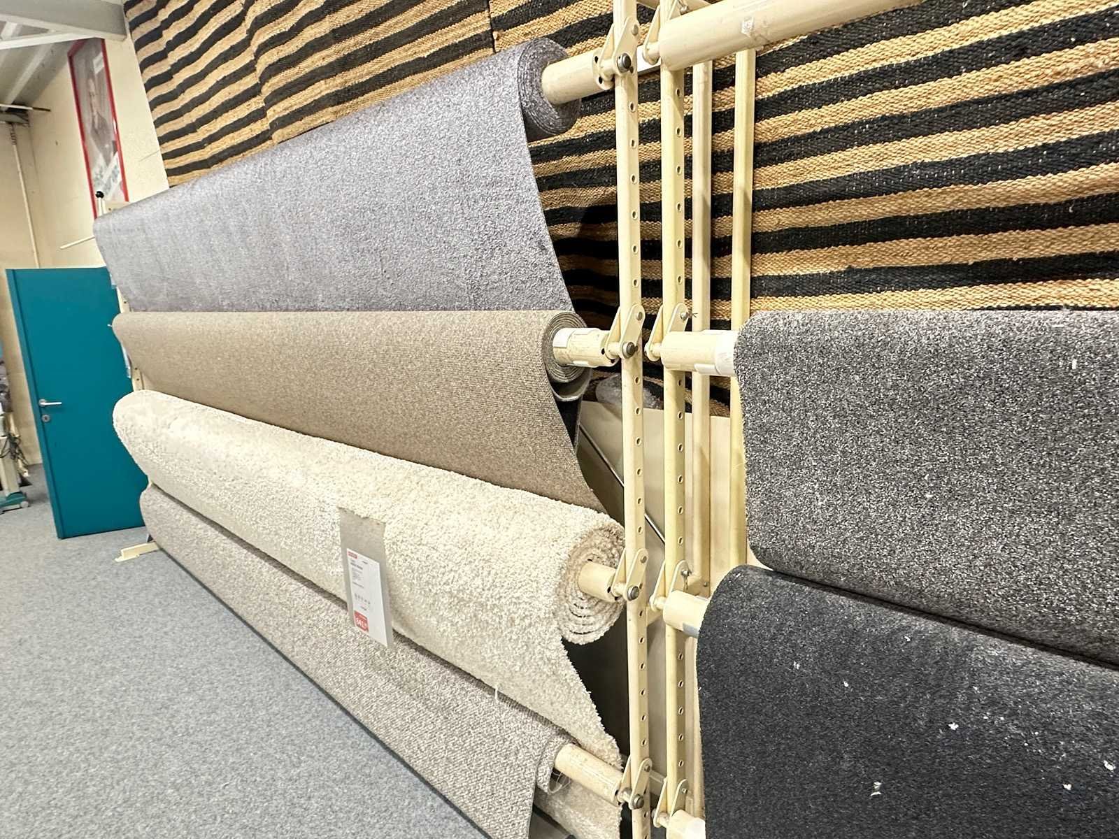 Deze partij bestaat uit diverse soorten vloerbedekking op 4 rekken. Verschillende afmetingen en kleuren. Exclusief rekken.